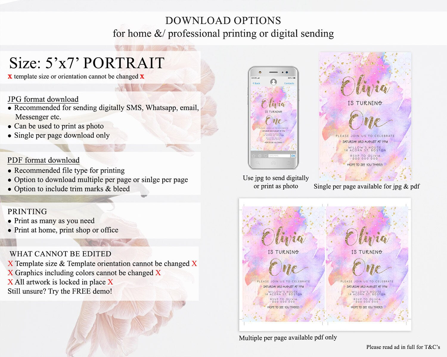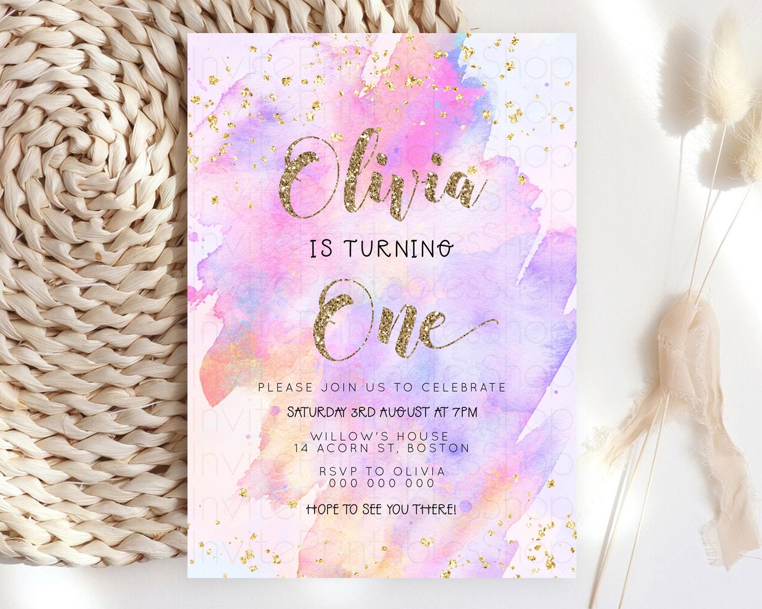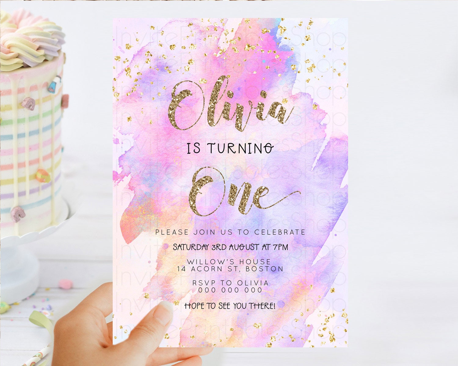 Rainbow Birthday Invitation Colorful Pastel Watercolor Invitation Gold Glitter Sprinkles Ombre Pastel 1st 2nd 3rd Birthday D23298