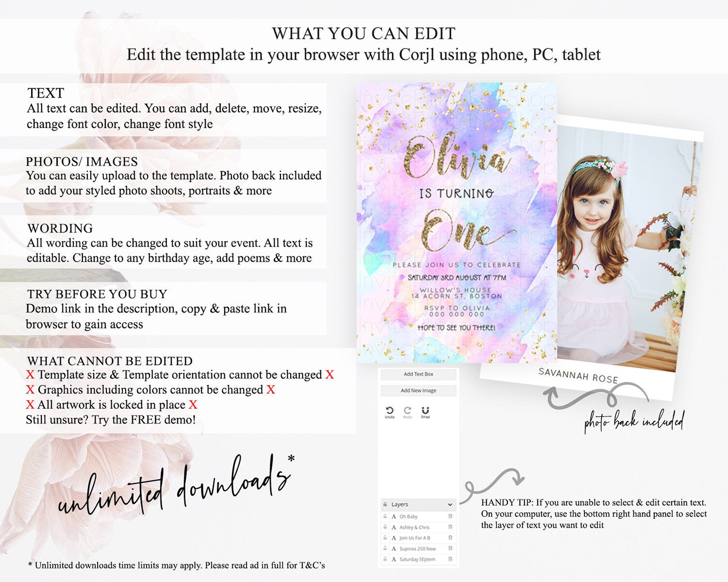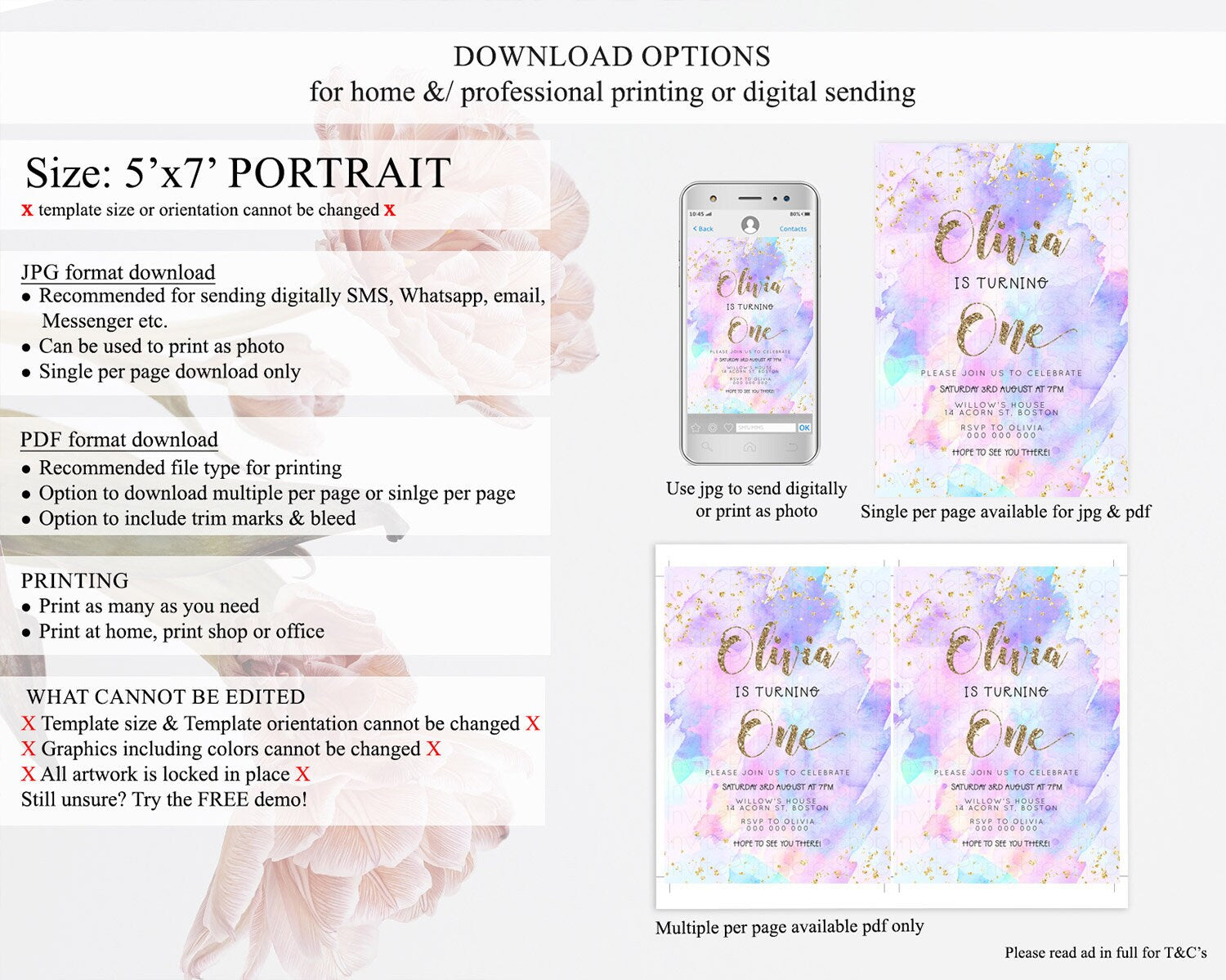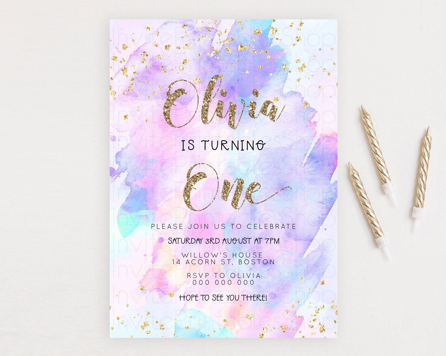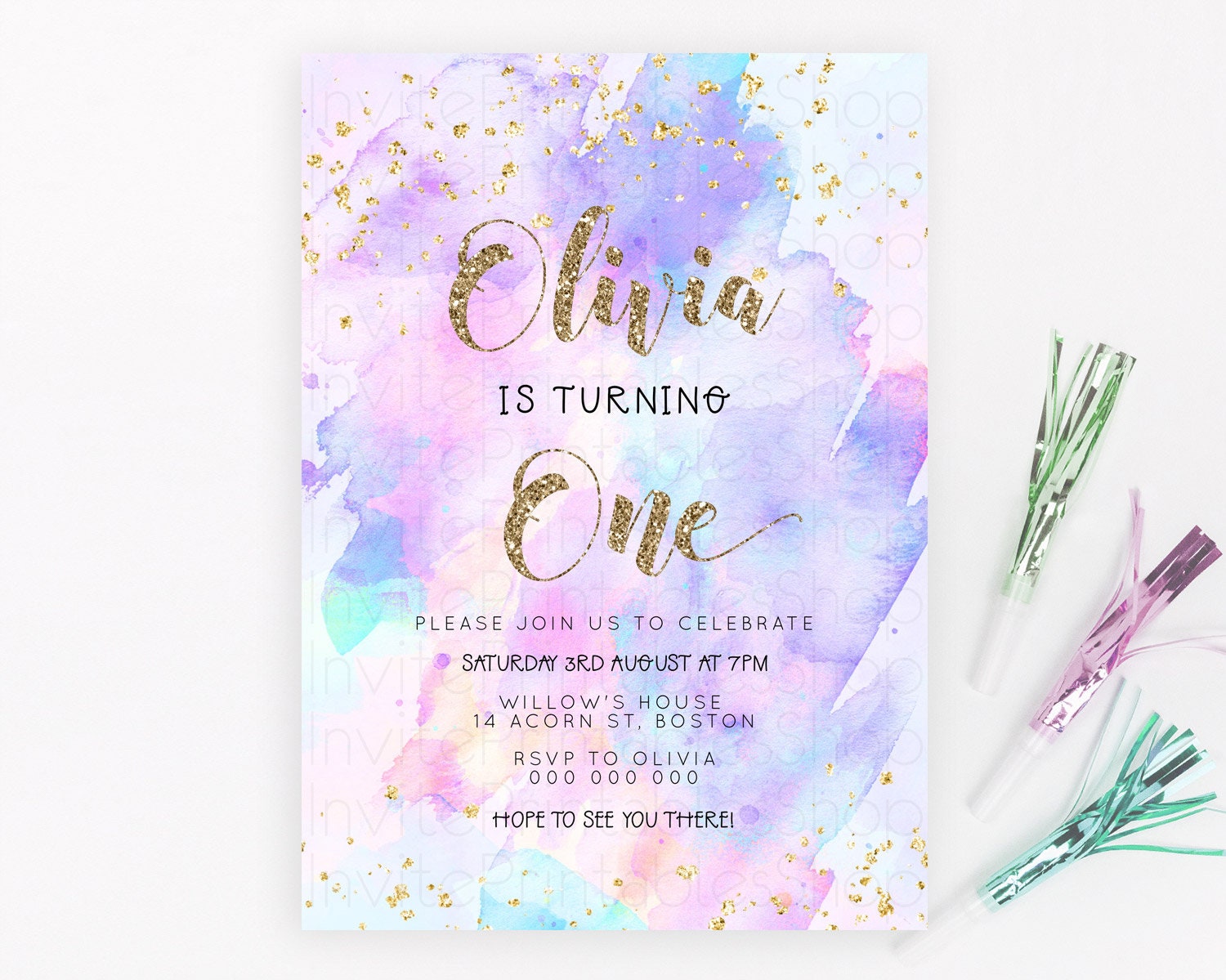 Rainbow Birthday Invitation Colorful Pastel Watercolor Invitation Gold Glitter Sprinkles Ombre Pastel 1st 2nd 3rd Birthday D23299
