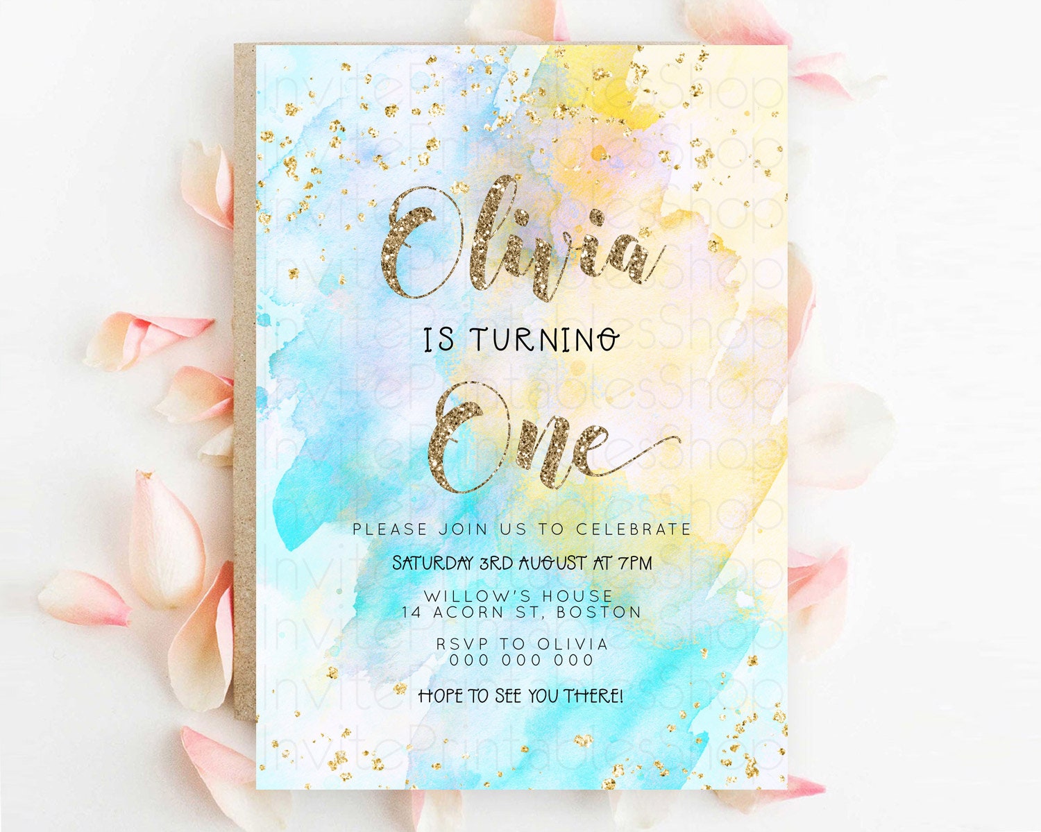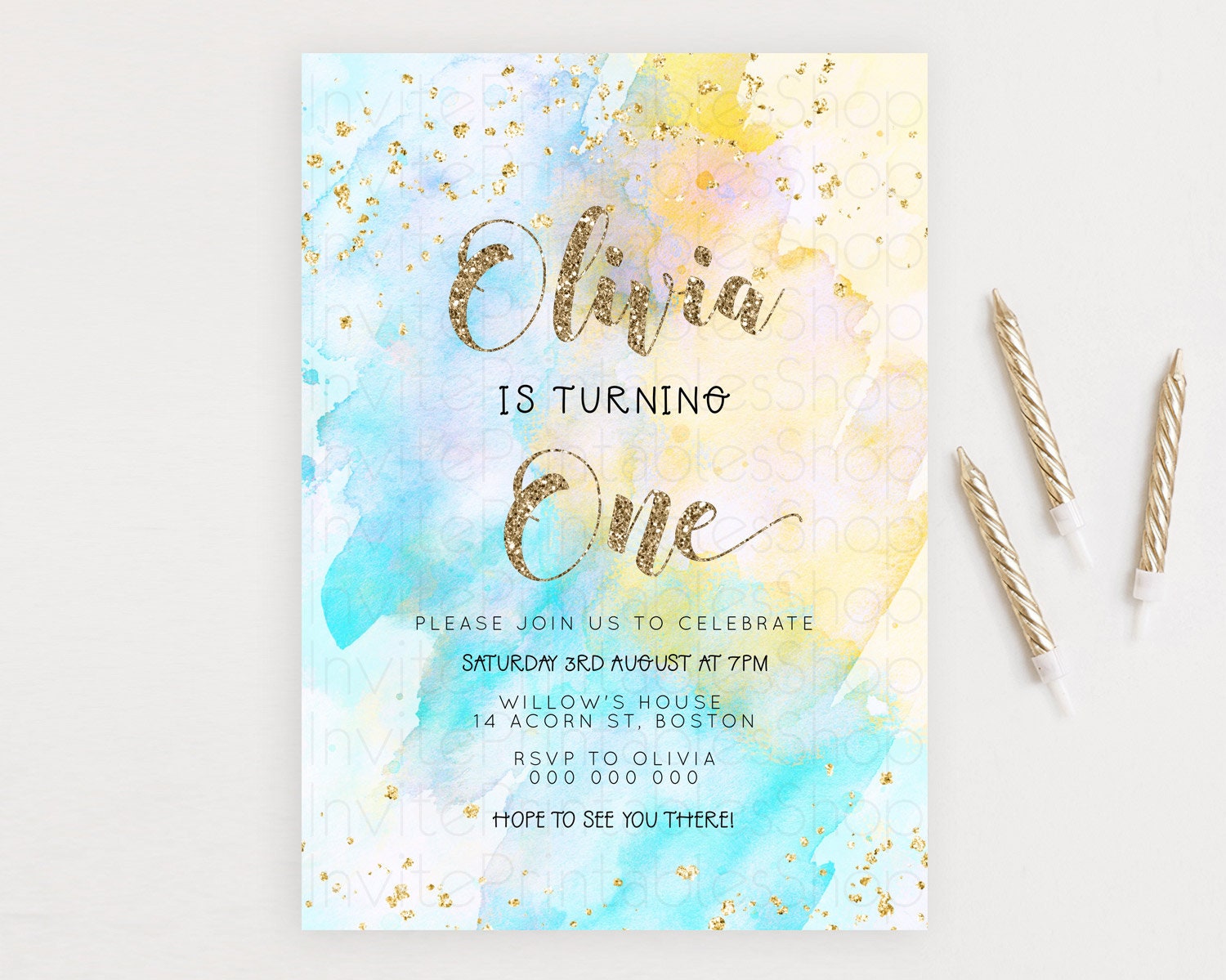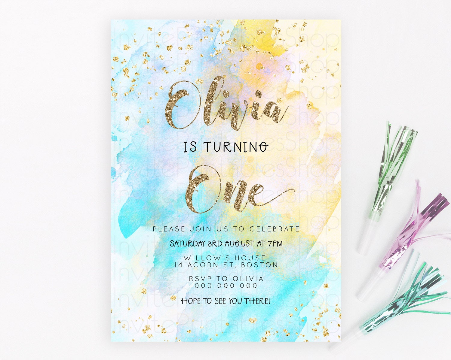 Rainbow Birthday Invitation Colorful Pastel Watercolor Invitation Gold Glitter Sprinkles Ombre Pastel 1st 2nd 3rd Birthday D23301