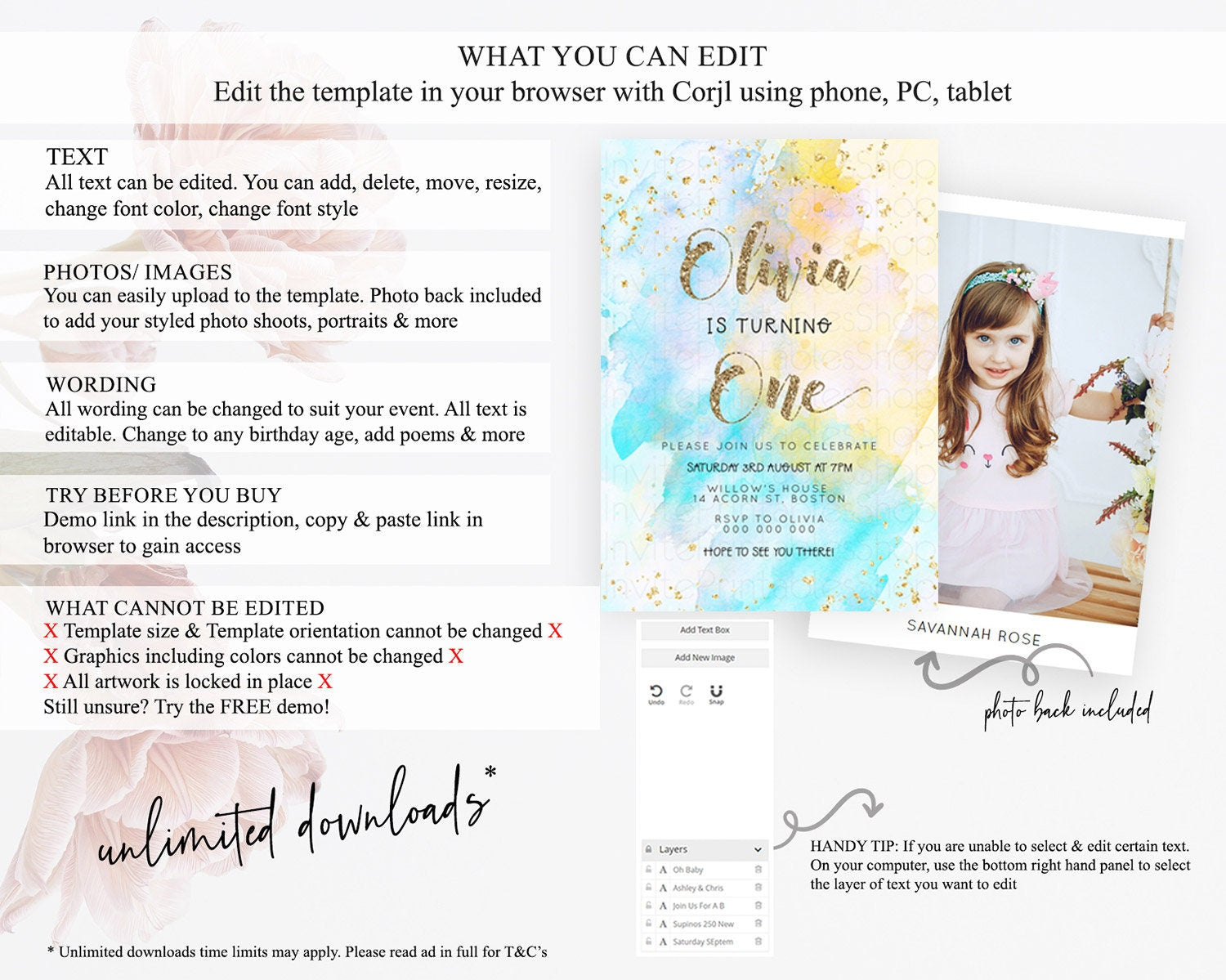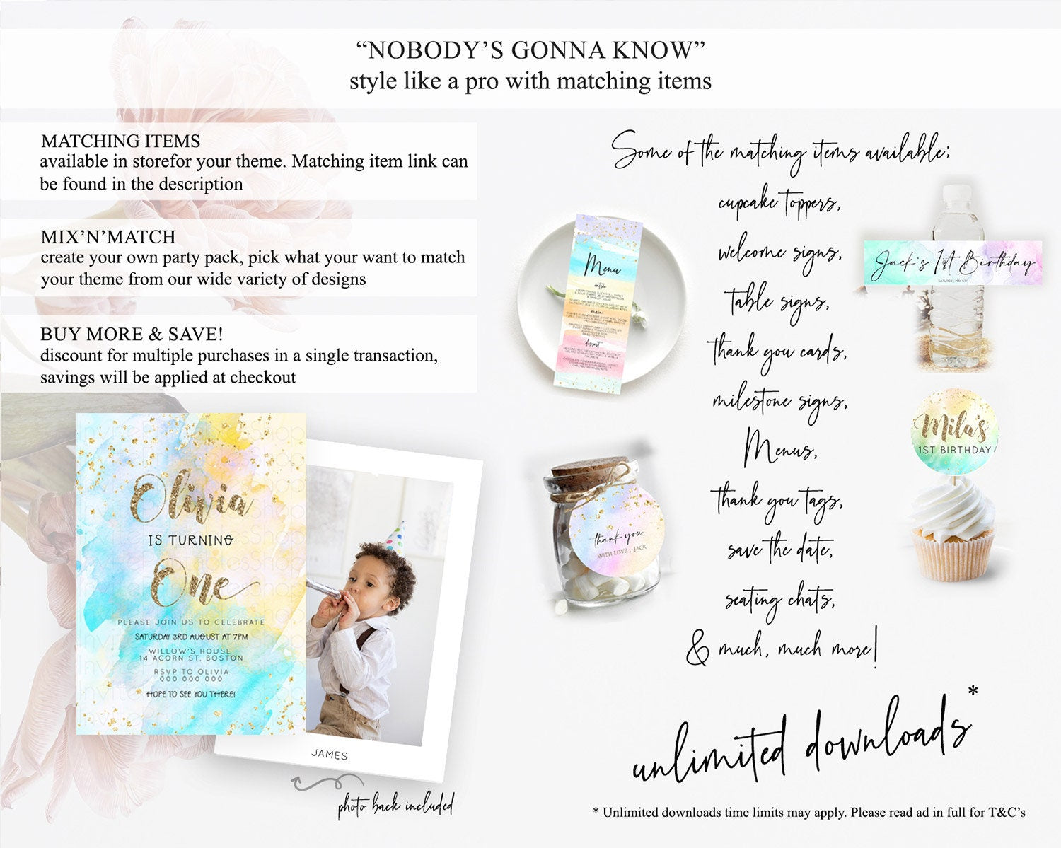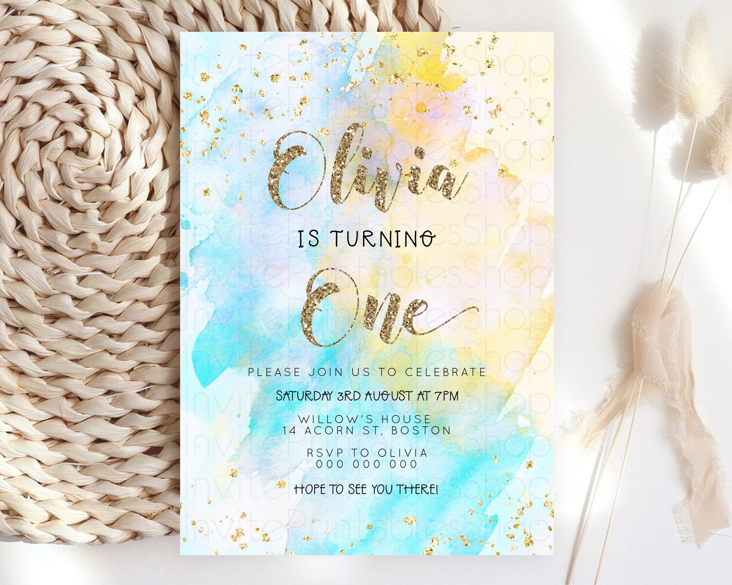 Rainbow Birthday Invitation Colorful Pastel Watercolor Invitation Gold Glitter Sprinkles Ombre Pastel 1st 2nd 3rd Birthday D23301