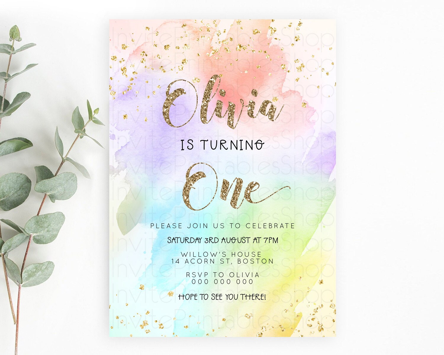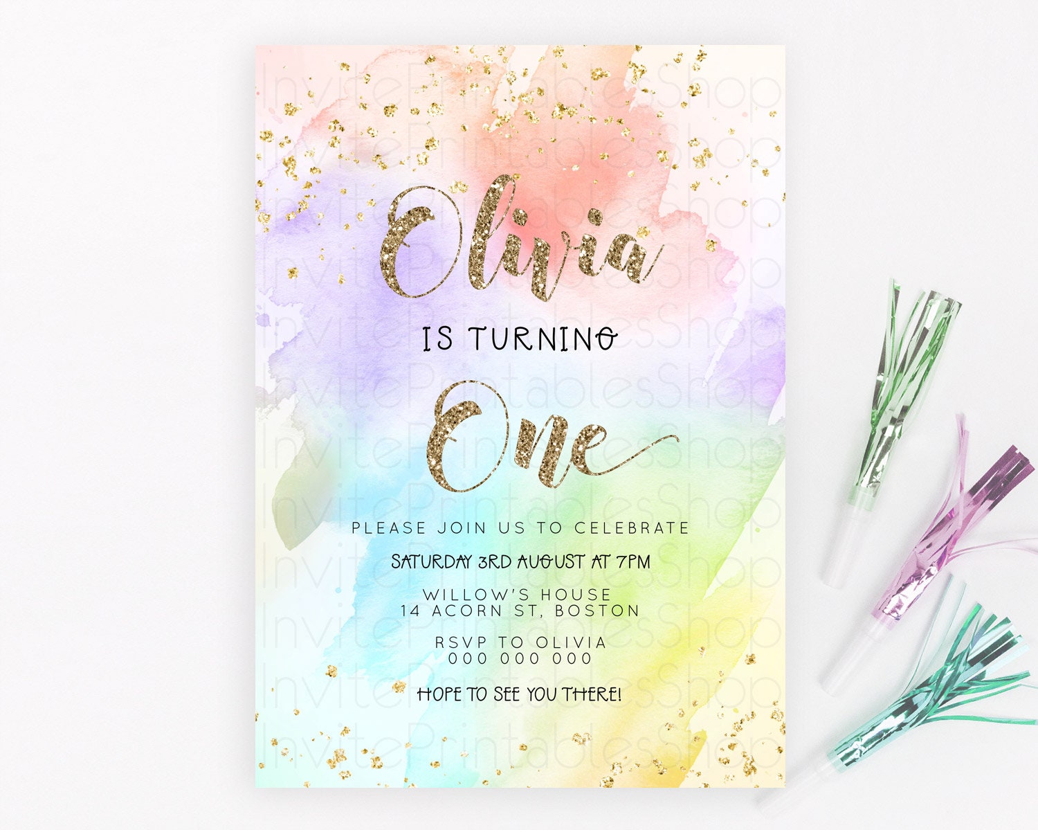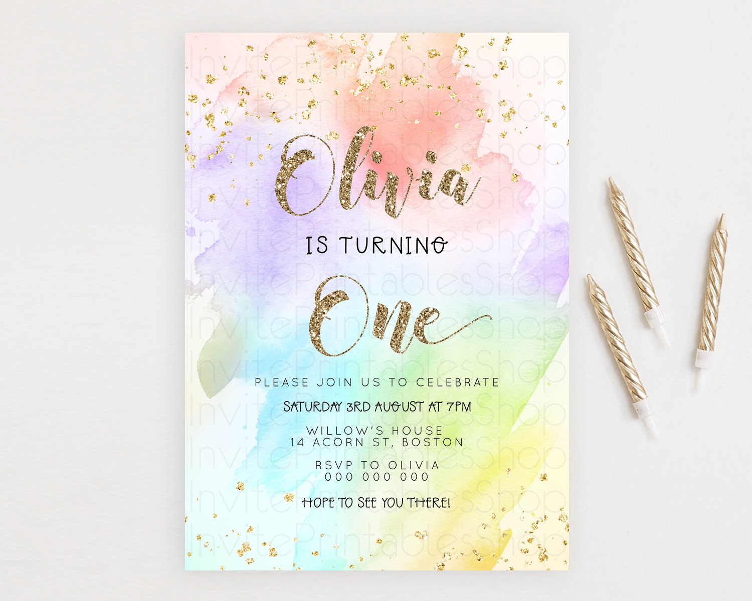 Rainbow Birthday Invitation Colorful Pastel Watercolor Invitation Gold Glitter Sprinkles Ombre Pastel 1st 2nd 3rd Birthday D23302