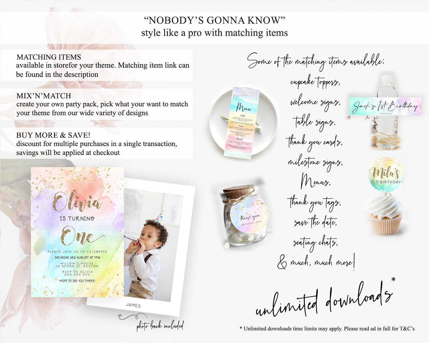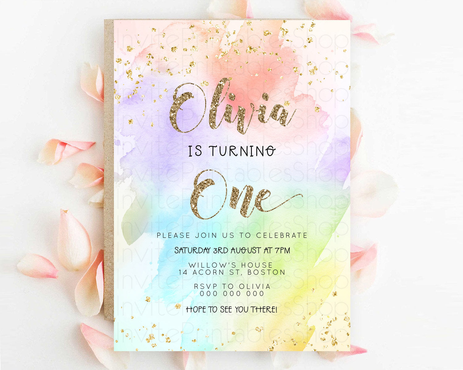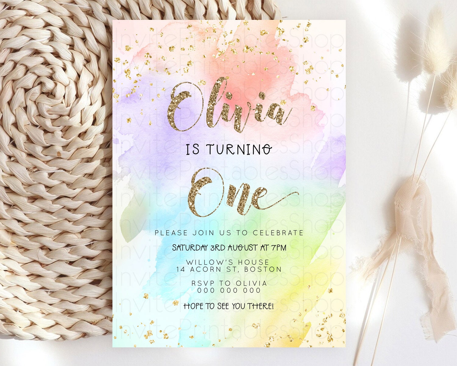 Rainbow Birthday Invitation Colorful Pastel Watercolor Invitation Gold Glitter Sprinkles Ombre Pastel 1st 2nd 3rd Birthday D23302
