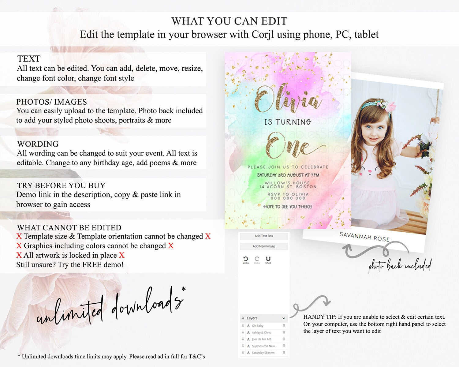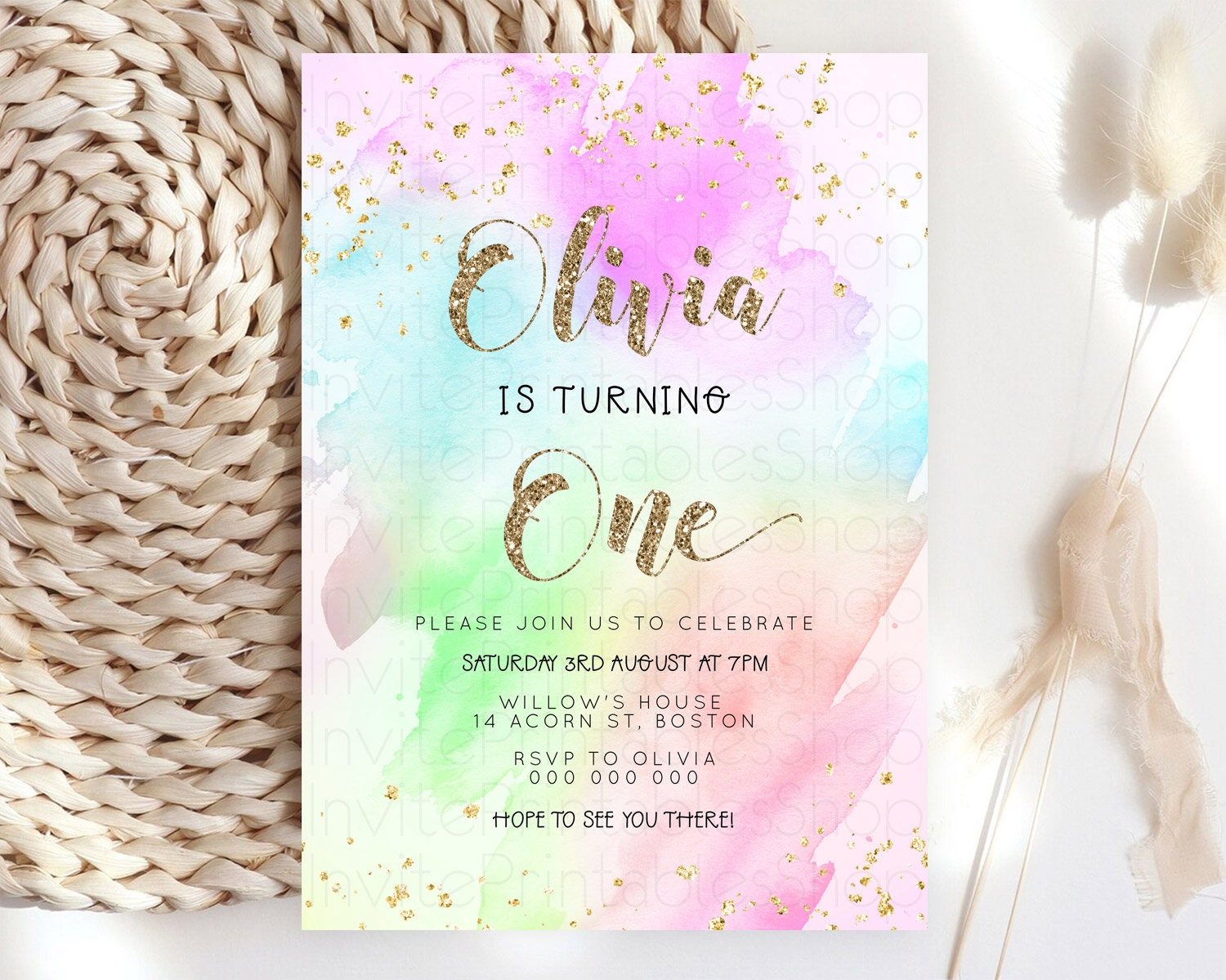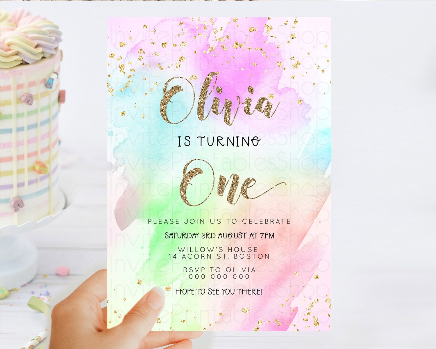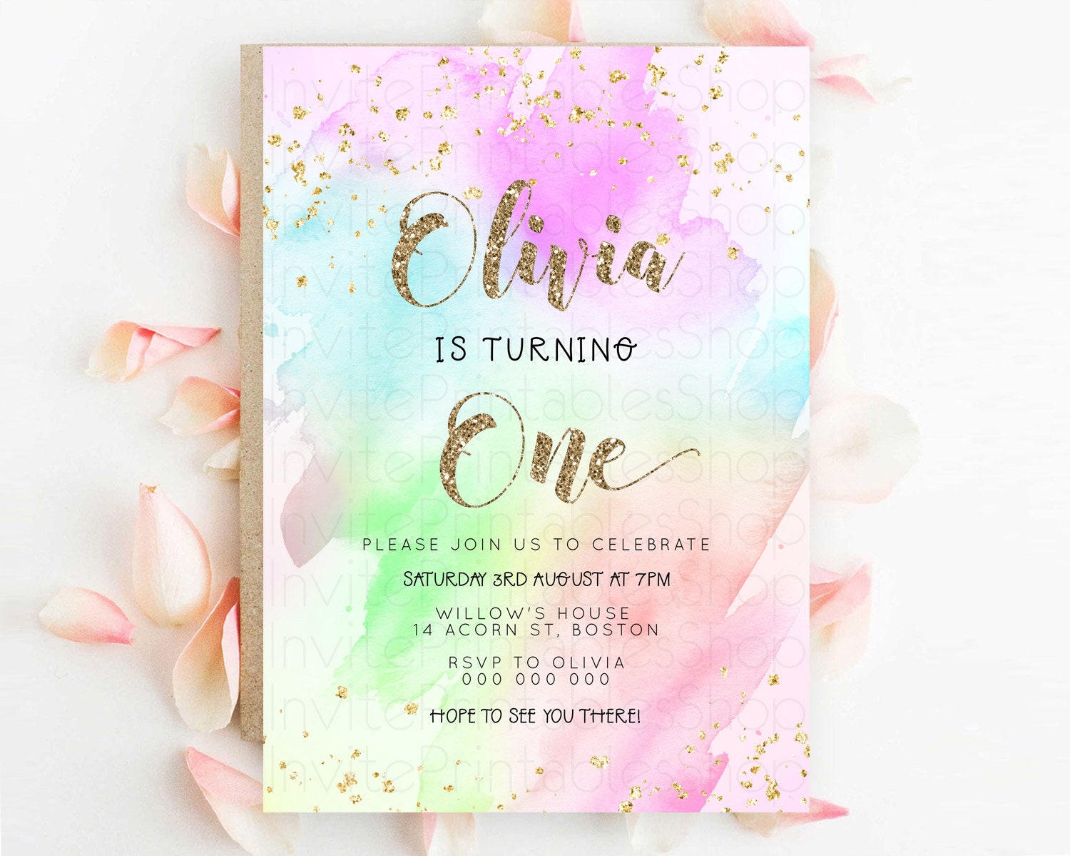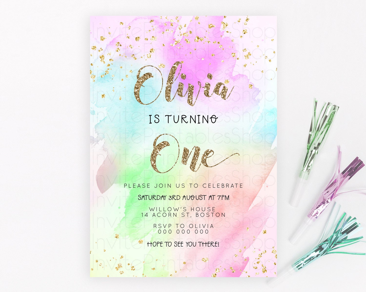Rainbow Birthday Invitation Colorful Pastel Watercolor Invitation Gold Glitter Sprinkles Ombre Pastel 1st 2nd 3rd Birthday D23303