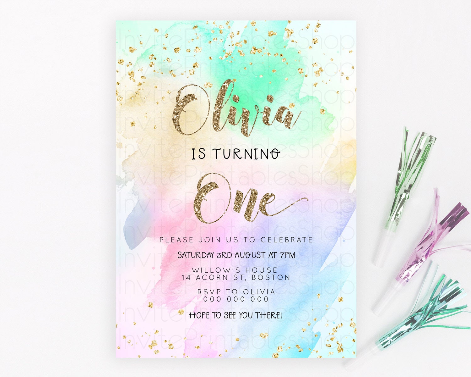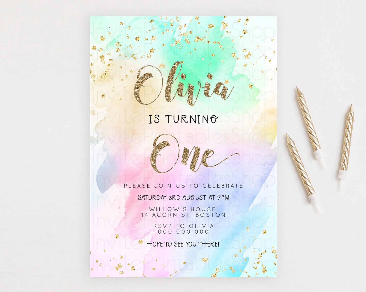 Rainbow Birthday Invitation Colorful Pastel Watercolor Invitation Gold Glitter Sprinkles Ombre Pastel 1st 2nd 3rd Birthday D23306