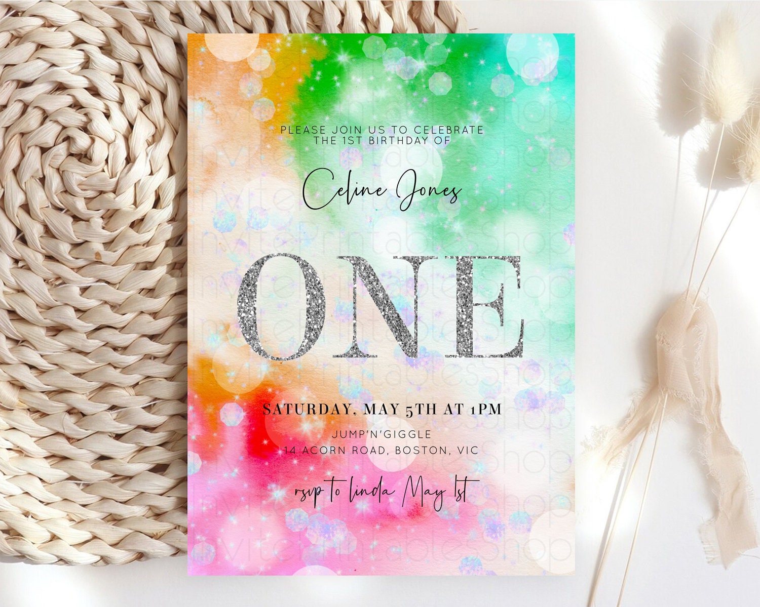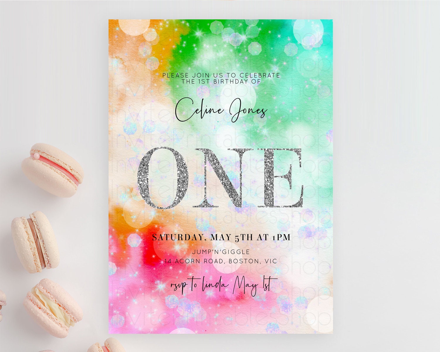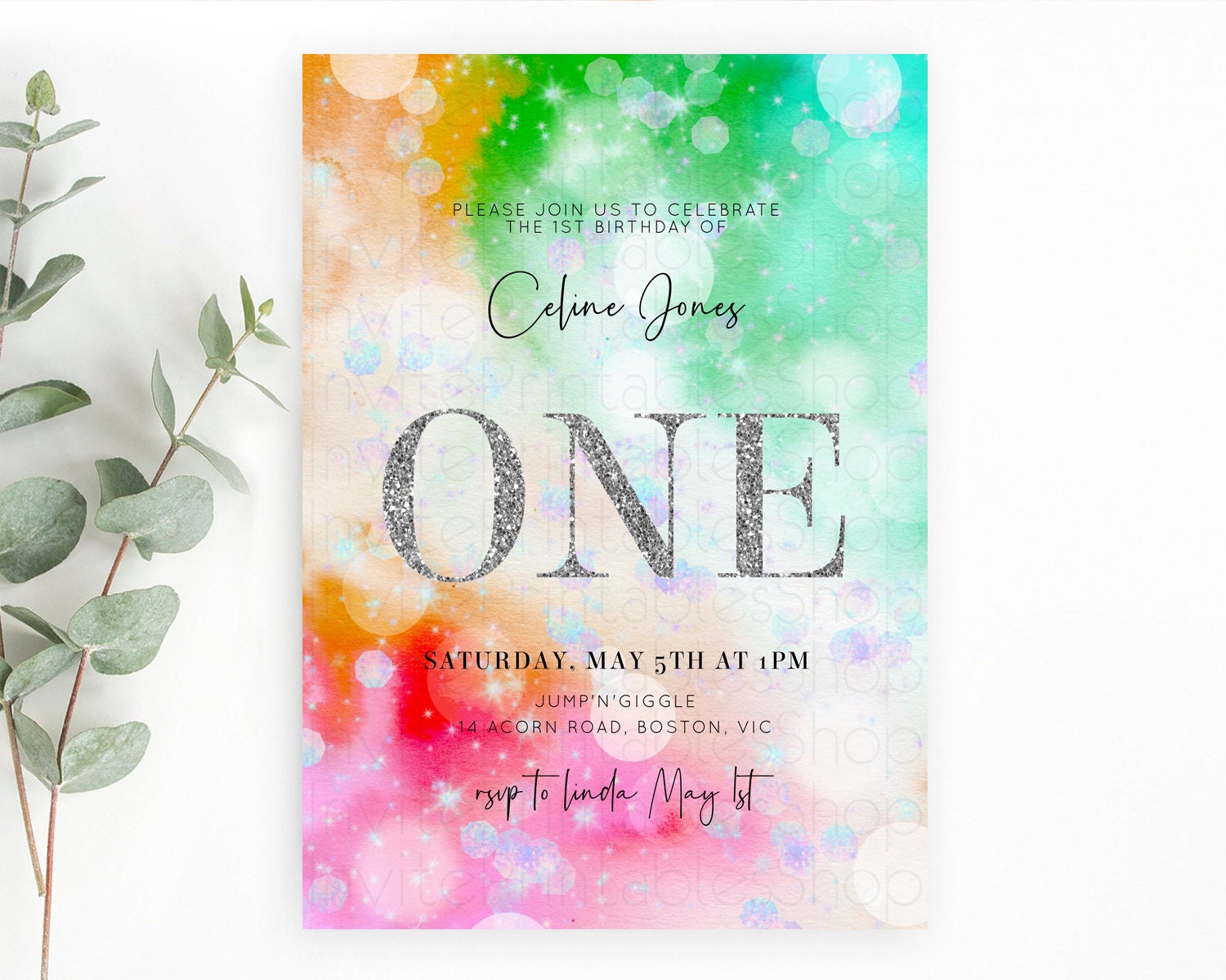 Rainbow Birthday Invitation Colorful Pastel Watercolor Silver Glitter Sprinkles Ombre Pastel Invitation 1st 2nd 3rd First Birthday D10691