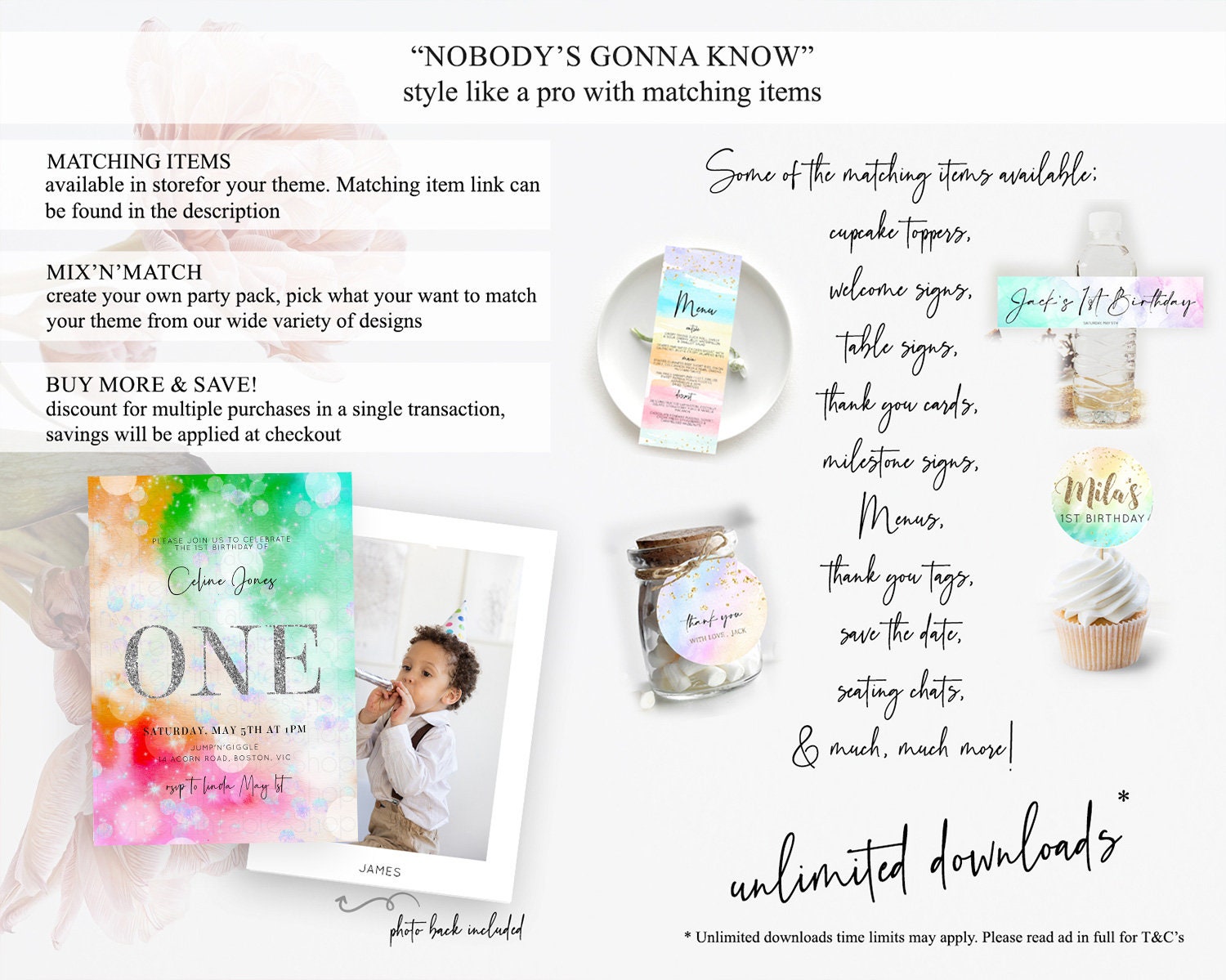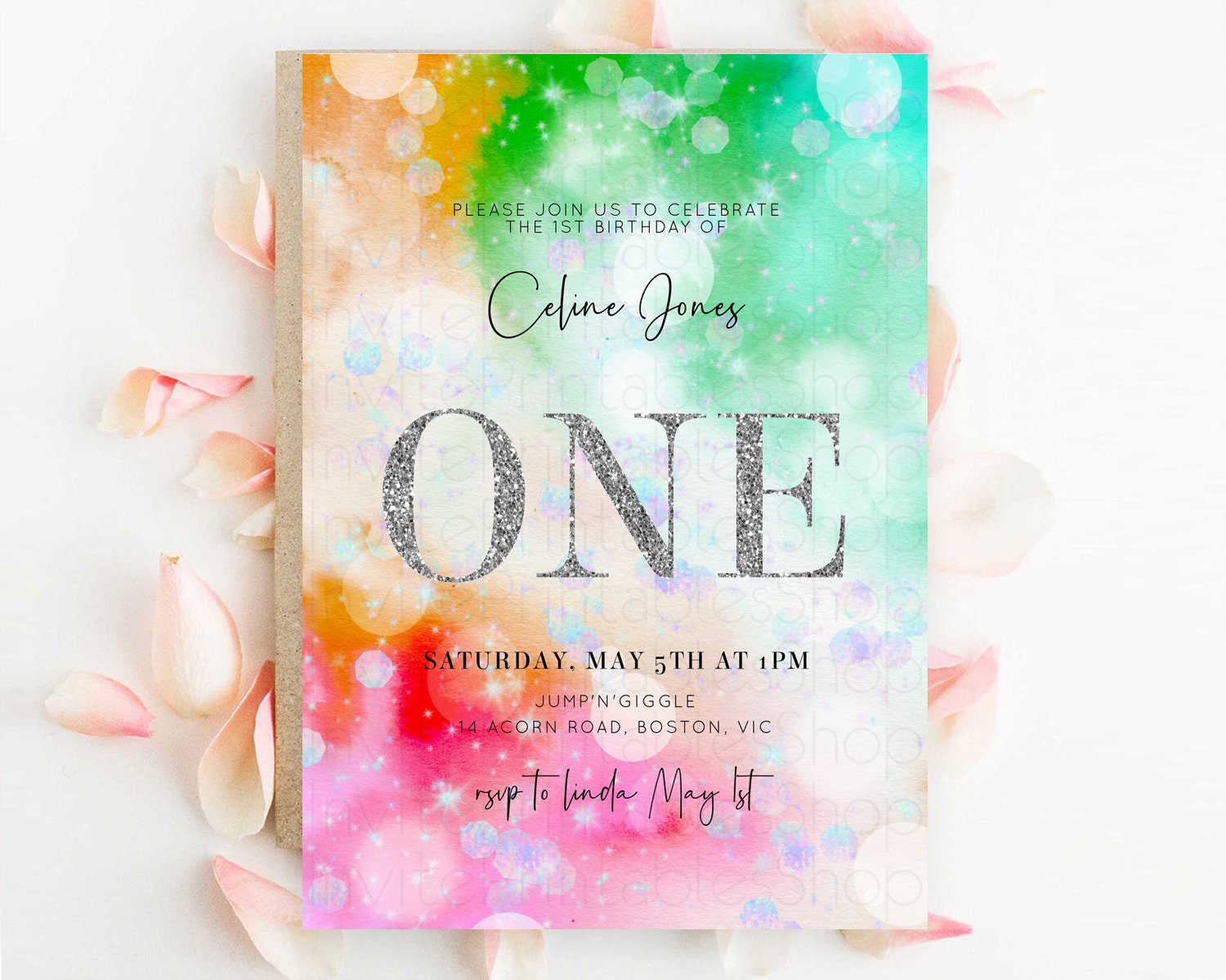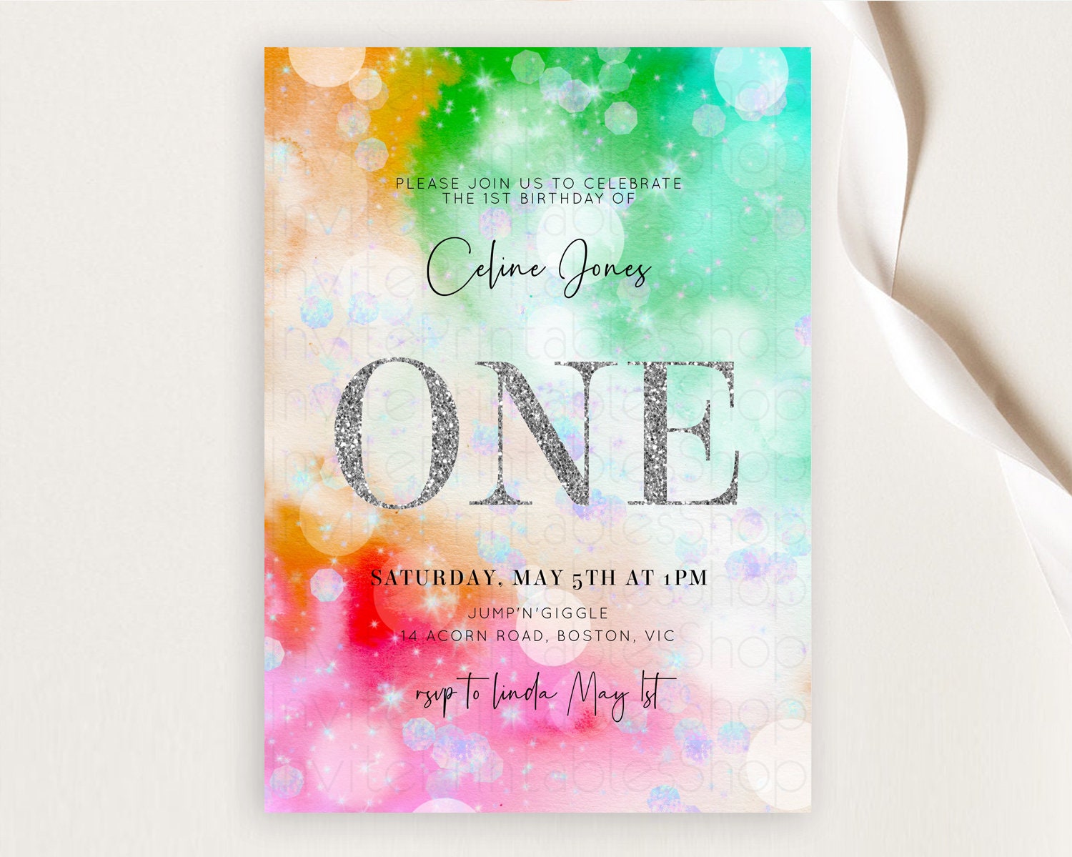 Rainbow Birthday Invitation Colorful Pastel Watercolor Silver Glitter Sprinkles Ombre Pastel Invitation 1st 2nd 3rd First Birthday D10691