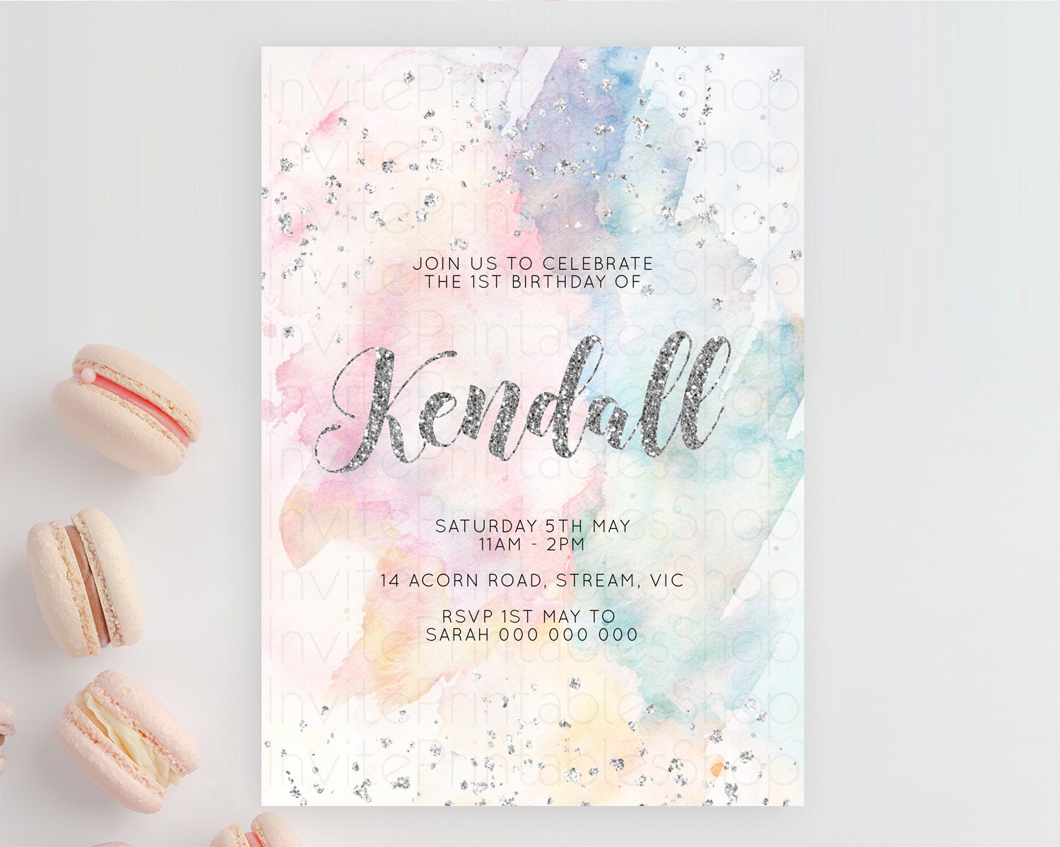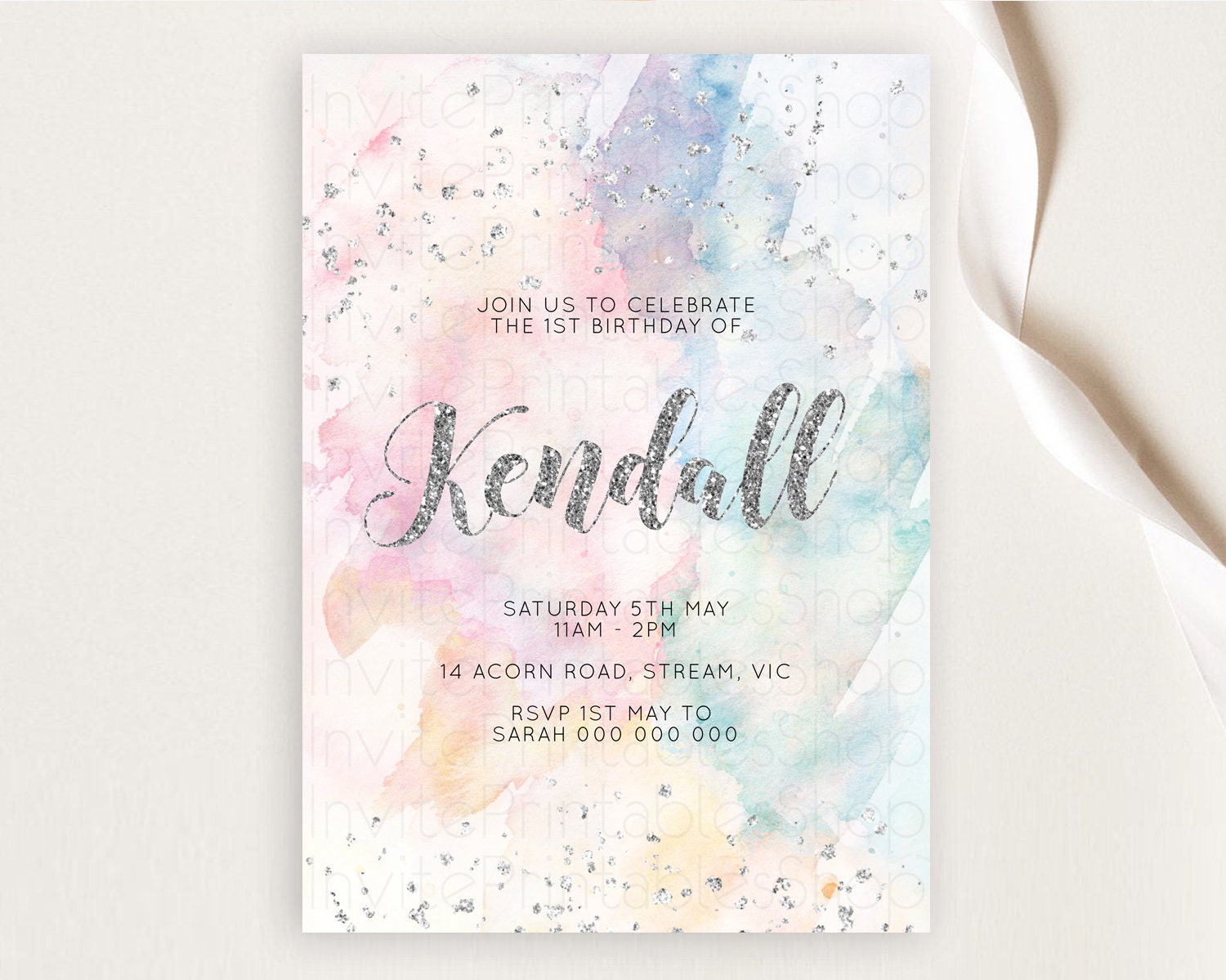 Rainbow Birthday Invitation Colorful Pastel Watercolor Silver Glitter Sprinkles Ombre Pastel Invitation 1st 2nd 3rd First Birthday D10944
