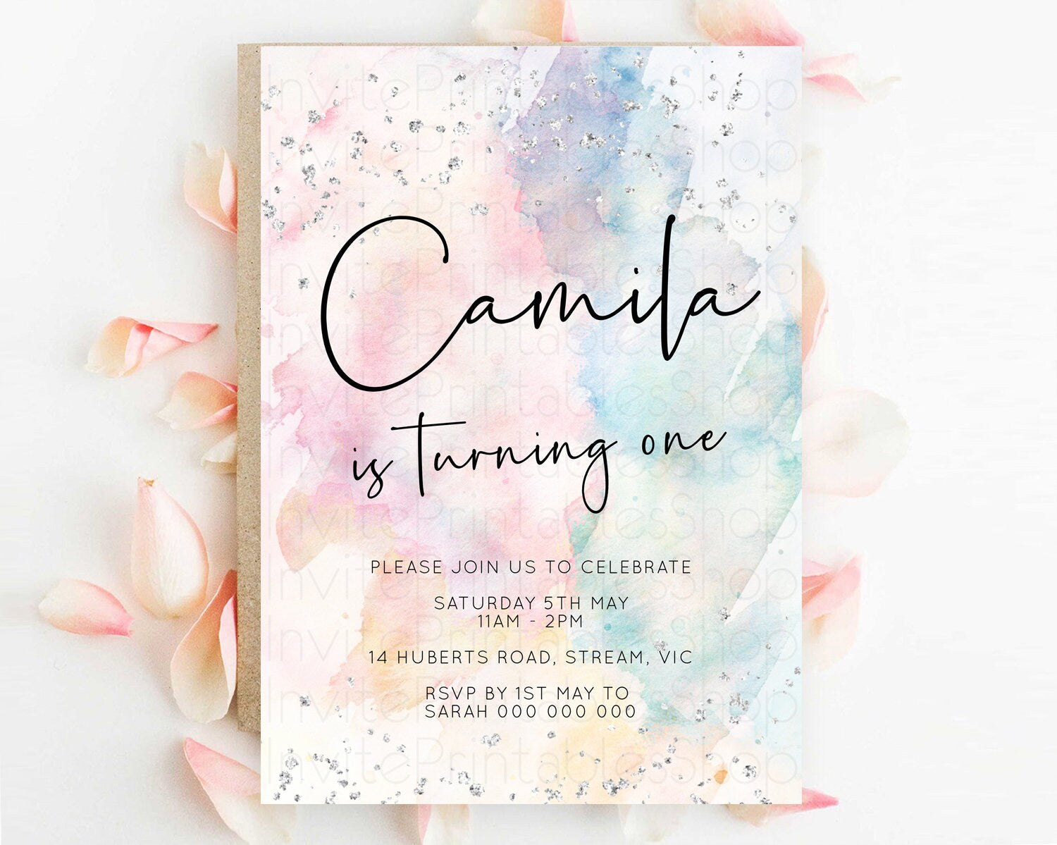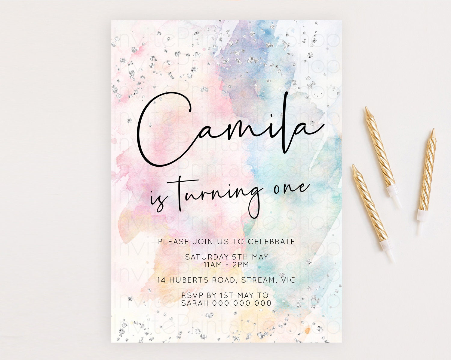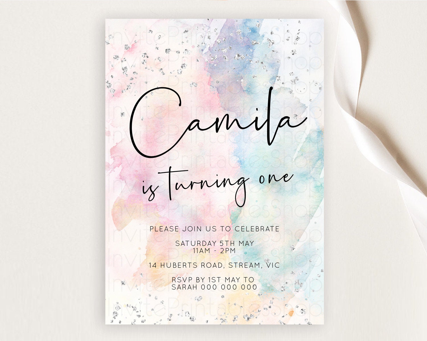 Rainbow Birthday Invitation Colorful Pastel Watercolor Silver Glitter Sprinkles Ombre Pastel Invitation 1st 2nd 3rd First Birthday D10945