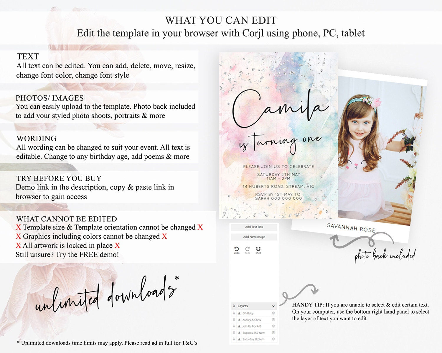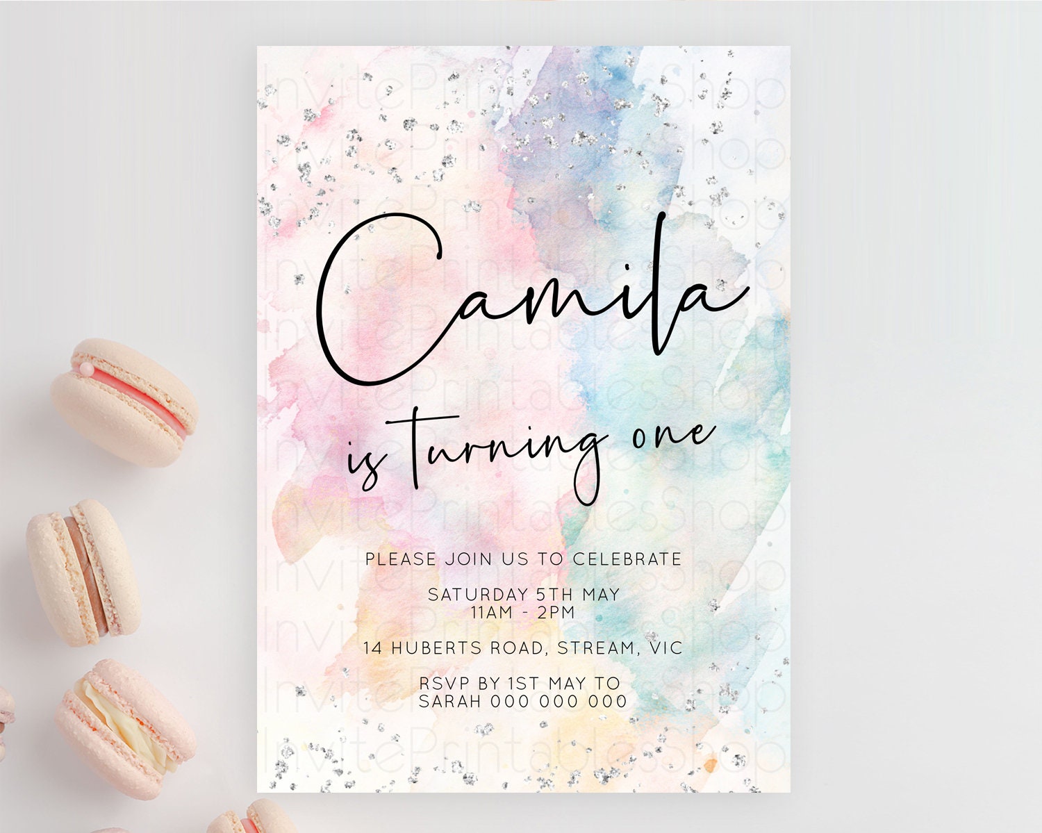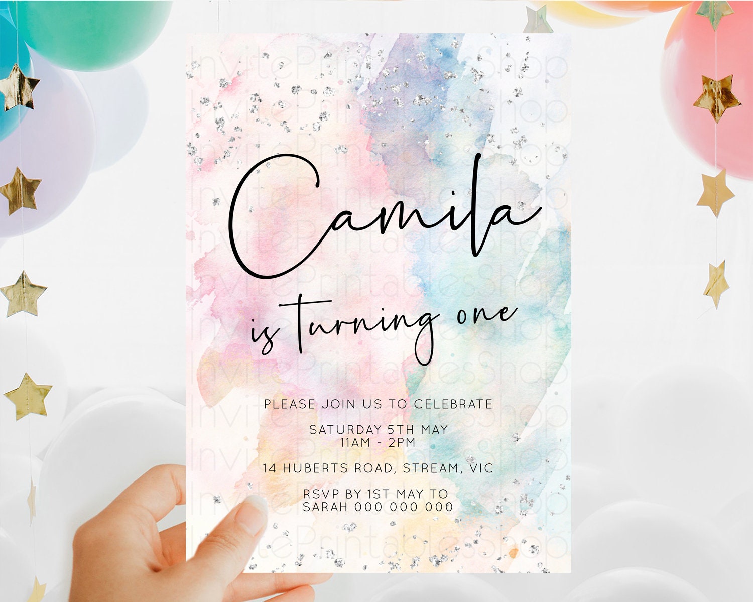 Rainbow Birthday Invitation Colorful Pastel Watercolor Silver Glitter Sprinkles Ombre Pastel Invitation 1st 2nd 3rd First Birthday D10945