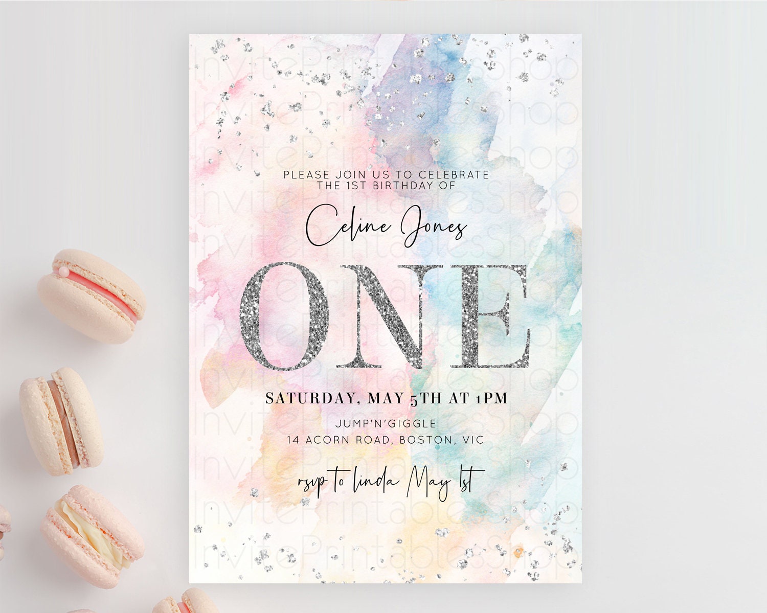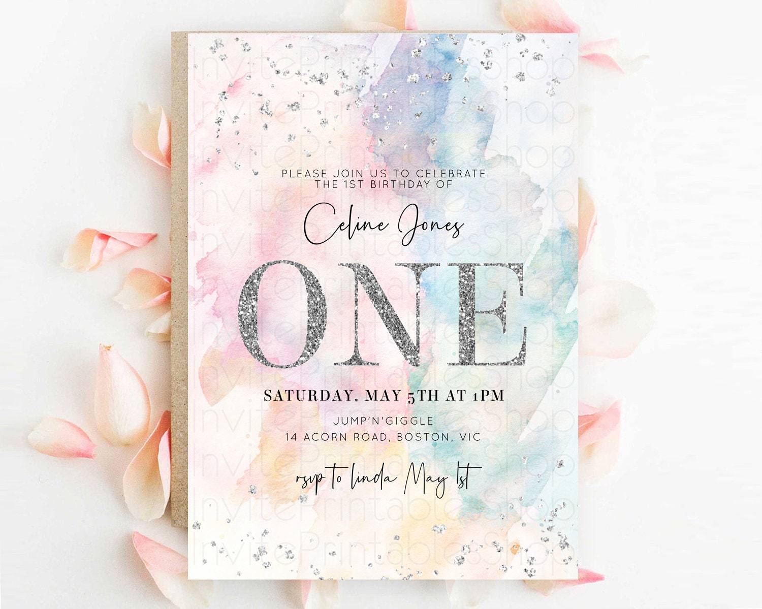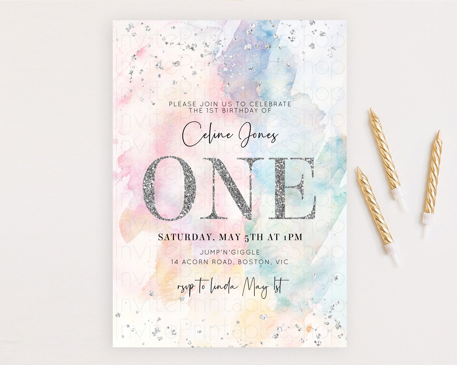 Rainbow Birthday Invitation Colorful Pastel Watercolor Silver Glitter Sprinkles Ombre Pastel Invitation 1st 2nd 3rd First Birthday D10945