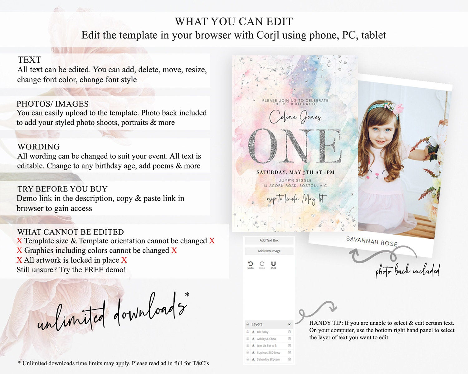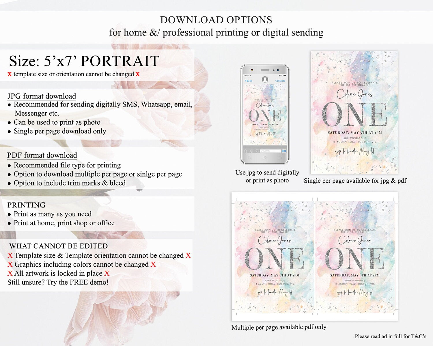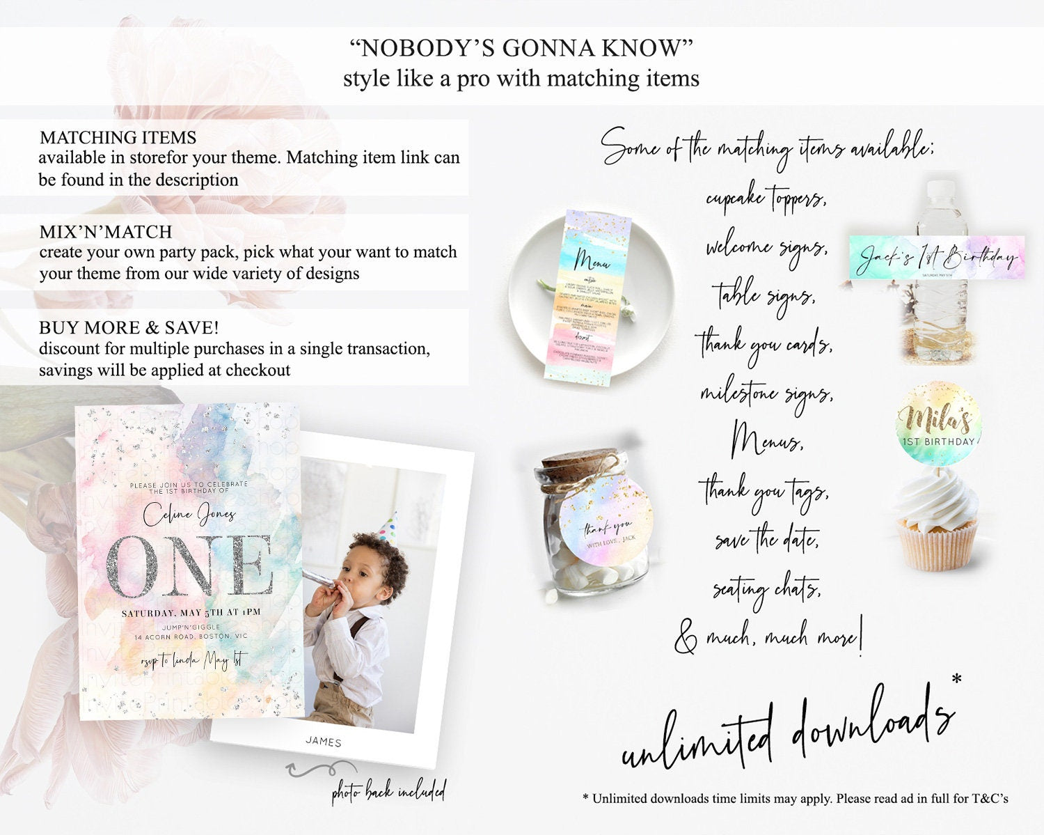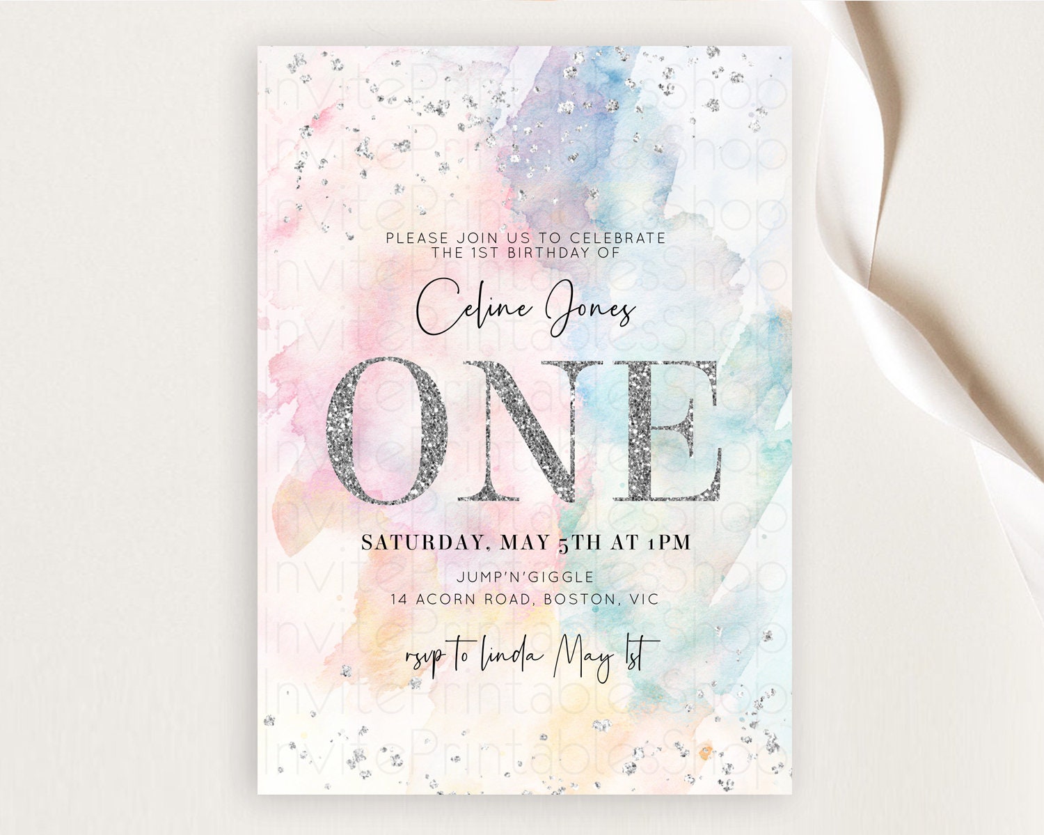 Rainbow Birthday Invitation Colorful Pastel Watercolor Silver Glitter Sprinkles Ombre Pastel Invitation 1st 2nd 3rd First Birthday D10945