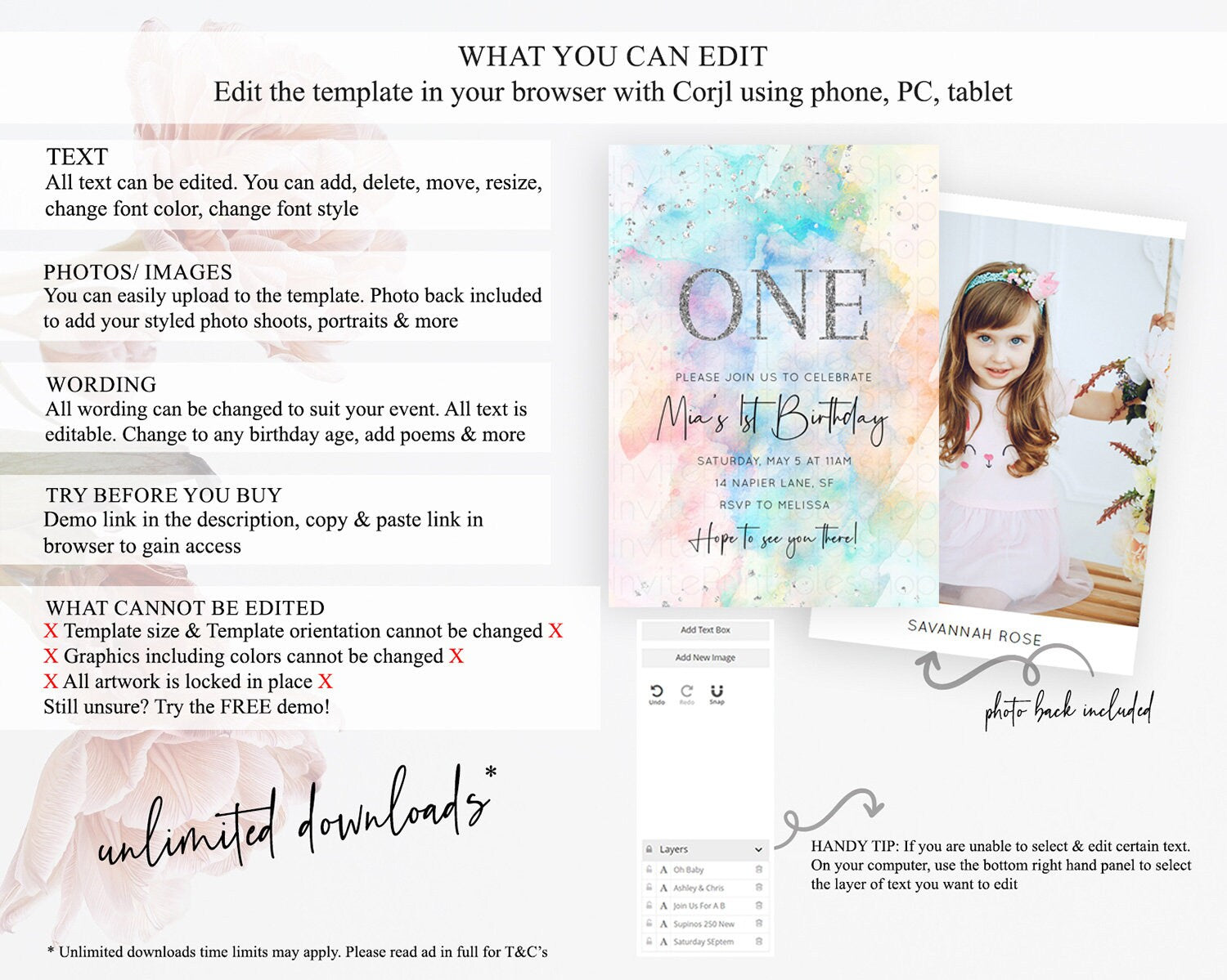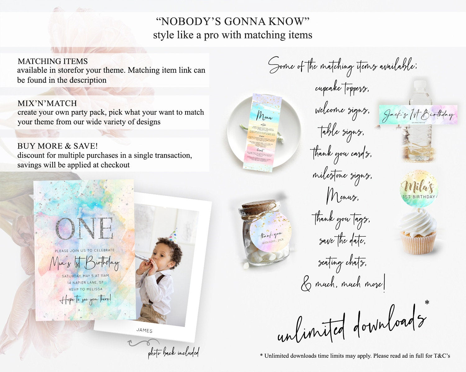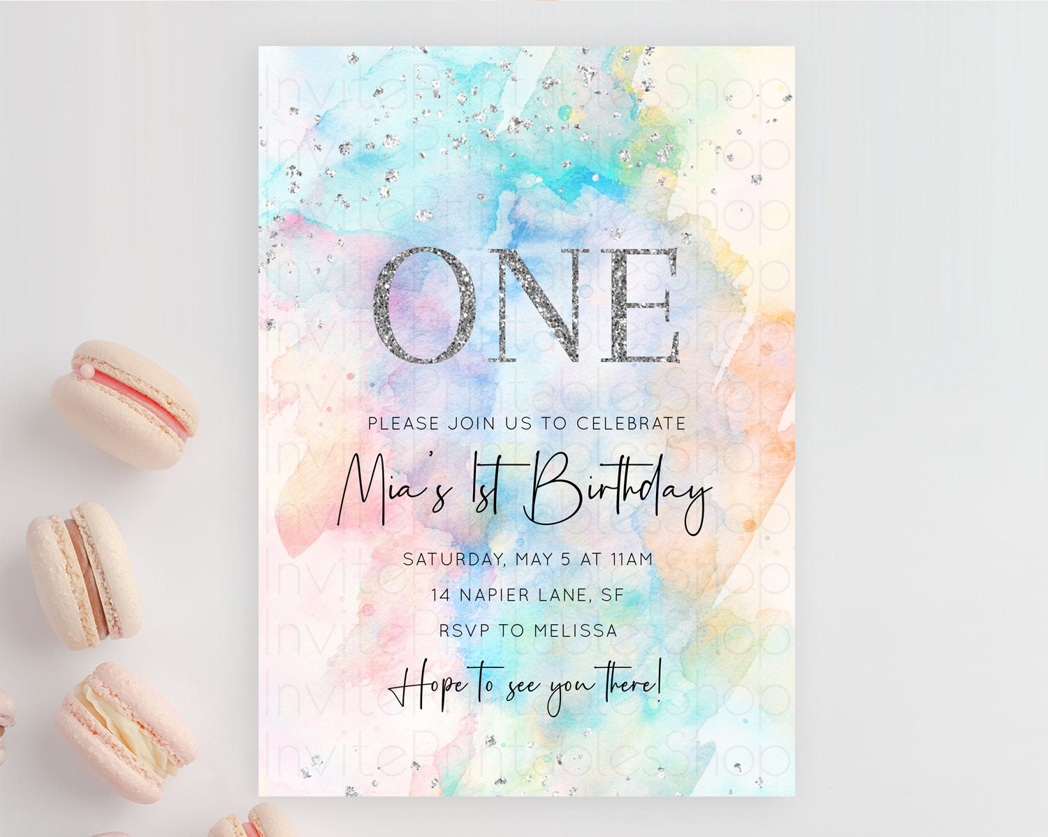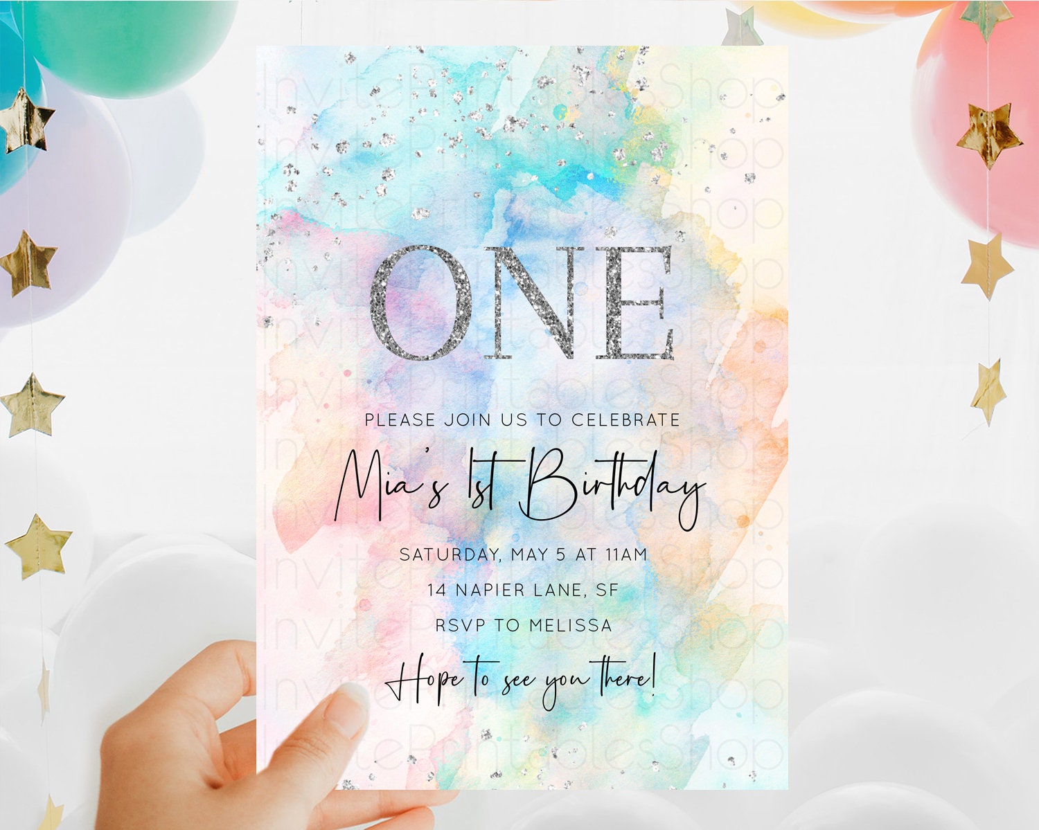 Rainbow Birthday Invitation Colorful Pastel Watercolor Silver Glitter Sprinkles Ombre Pastel Invitation 1st 2nd 3rd First Birthday D11031