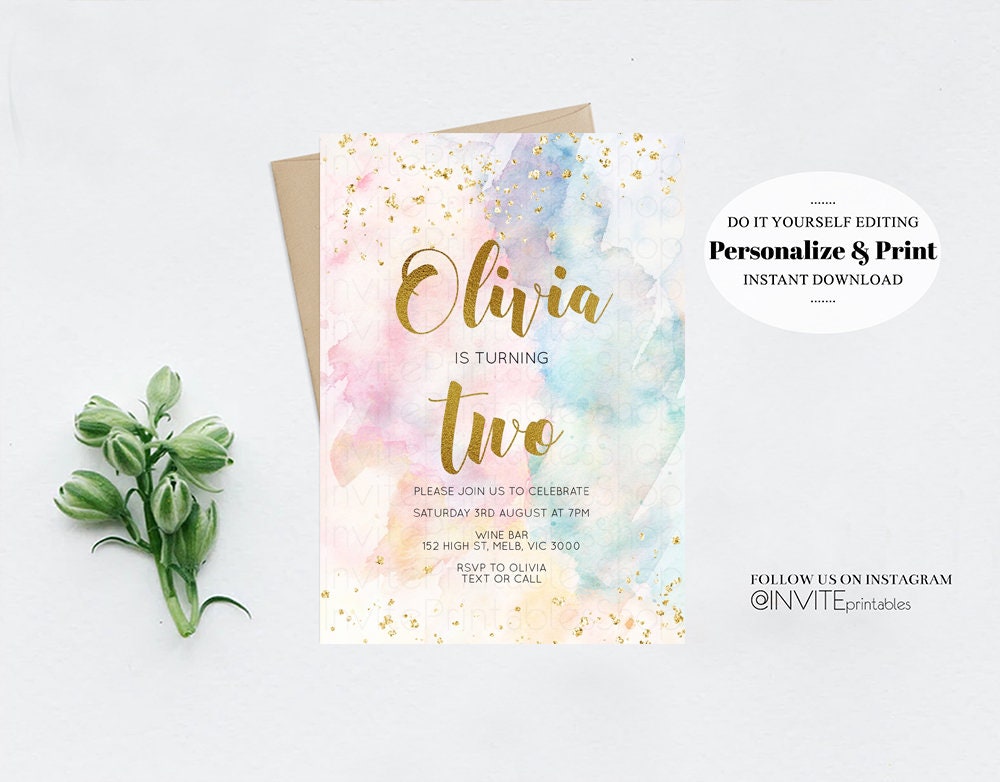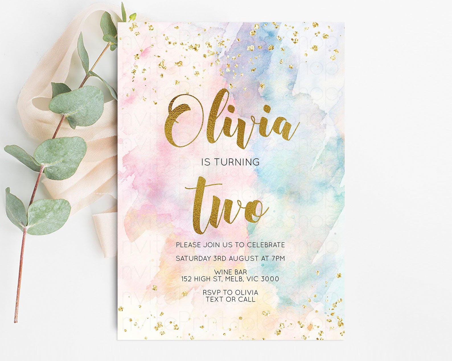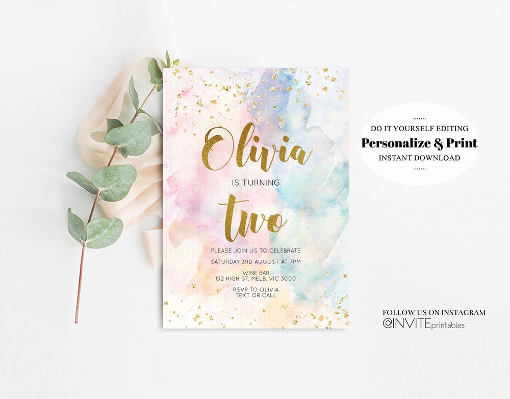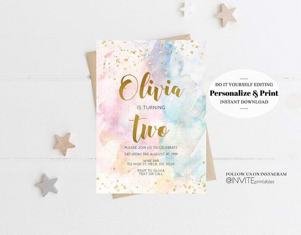Rainbow Birthday Invitation Colorful Watercolor Gold Glitter Sprinkles Ombre Pastel Invitation 1st 2nd 3rd Printable Editable Invite 276