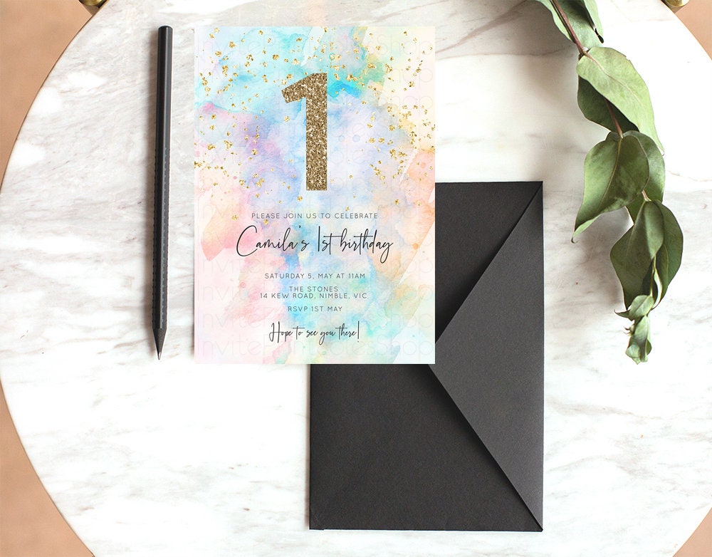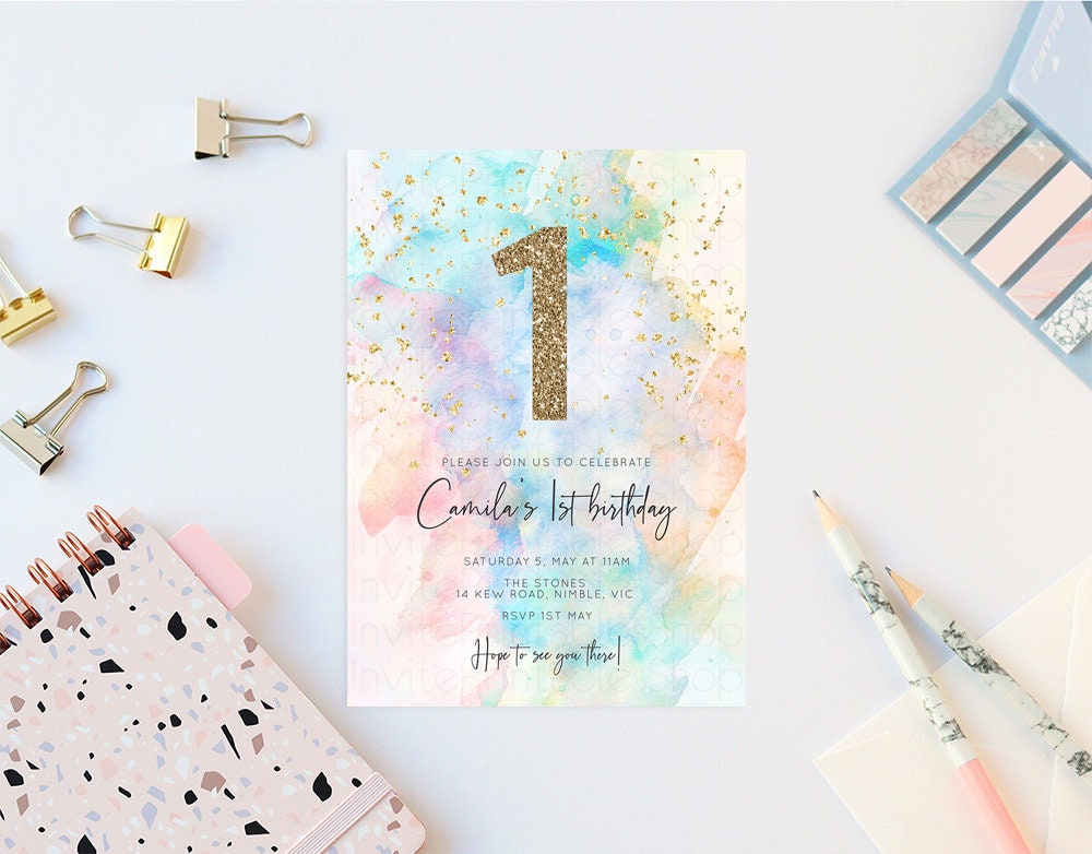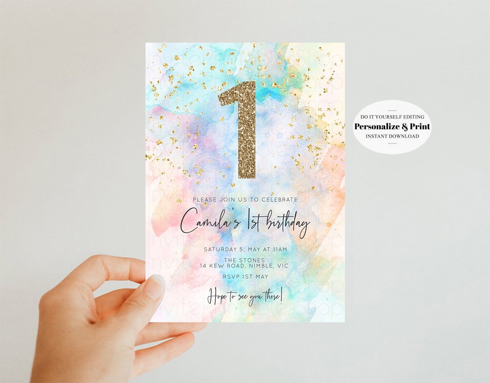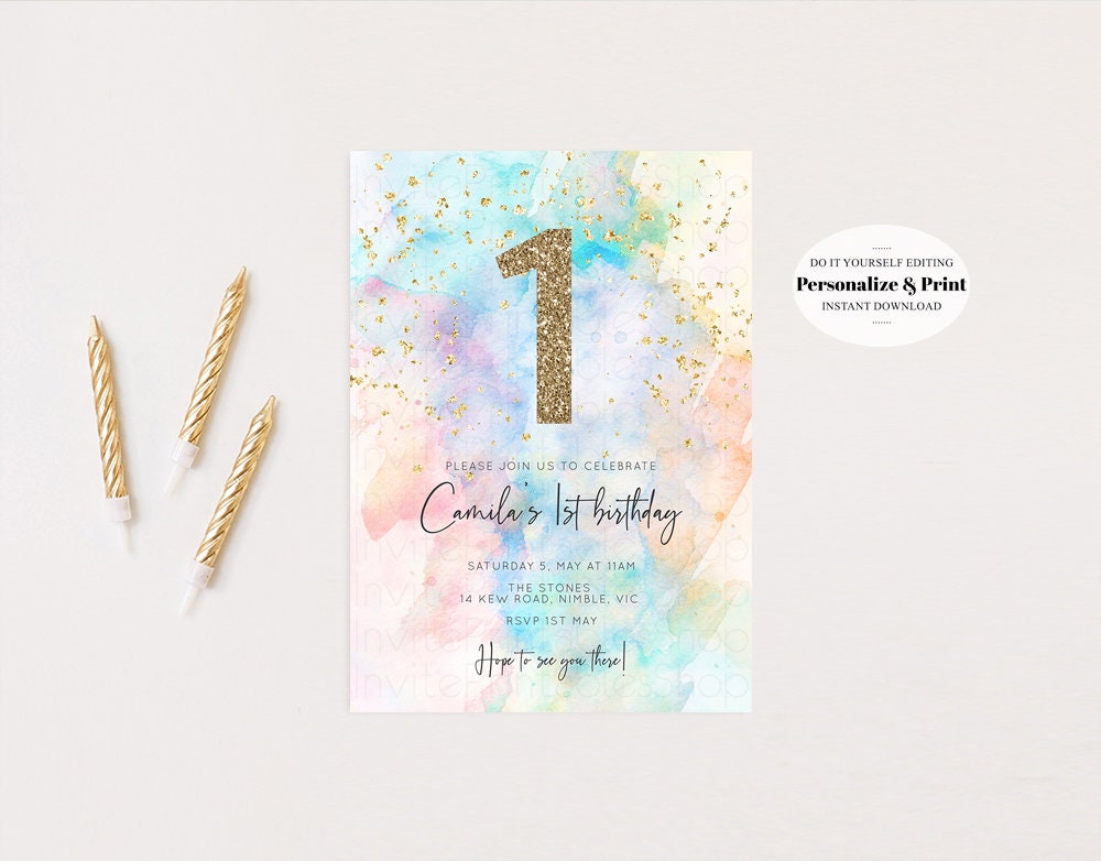 Rainbow Birthday Invitation Colorful Watercolor Gold Glitter Sprinkles Ombre Pastel Invitation 1st 2nd 3rd Printable Editable Invite 276v3
