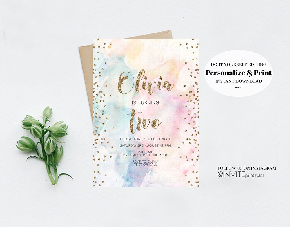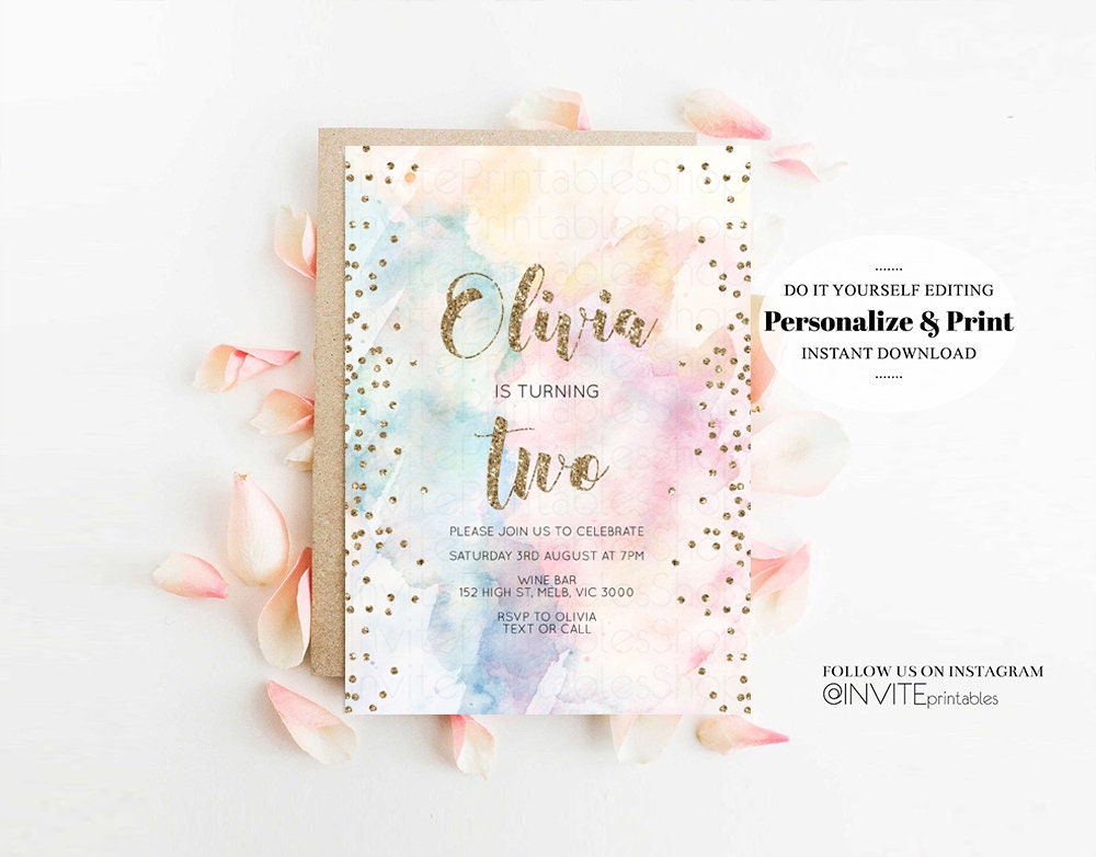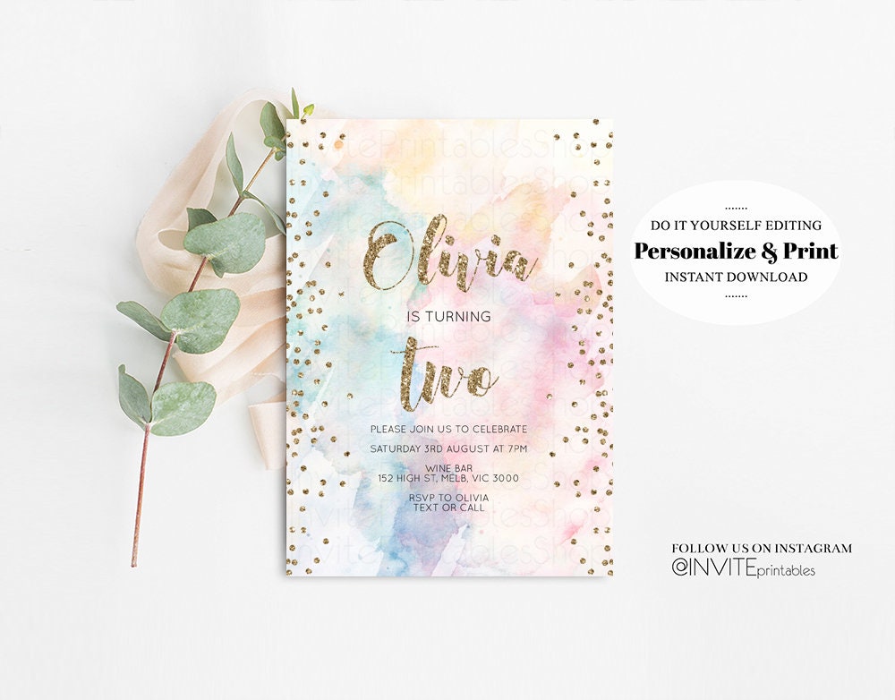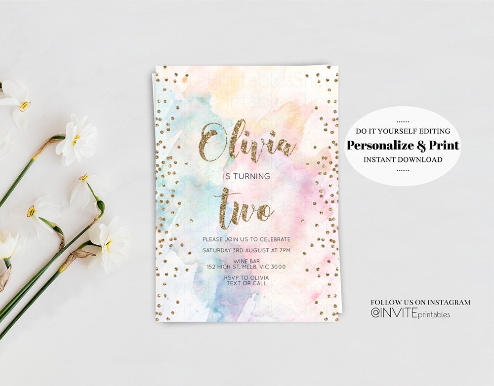 Rainbow Birthday Invitation Colorful Watercolor Gold Glitter Sprinkles Ombre Pastel Invitation 1st 2nd 3rd Printable Editable Invite 455