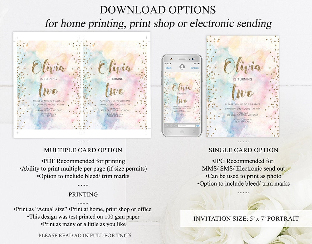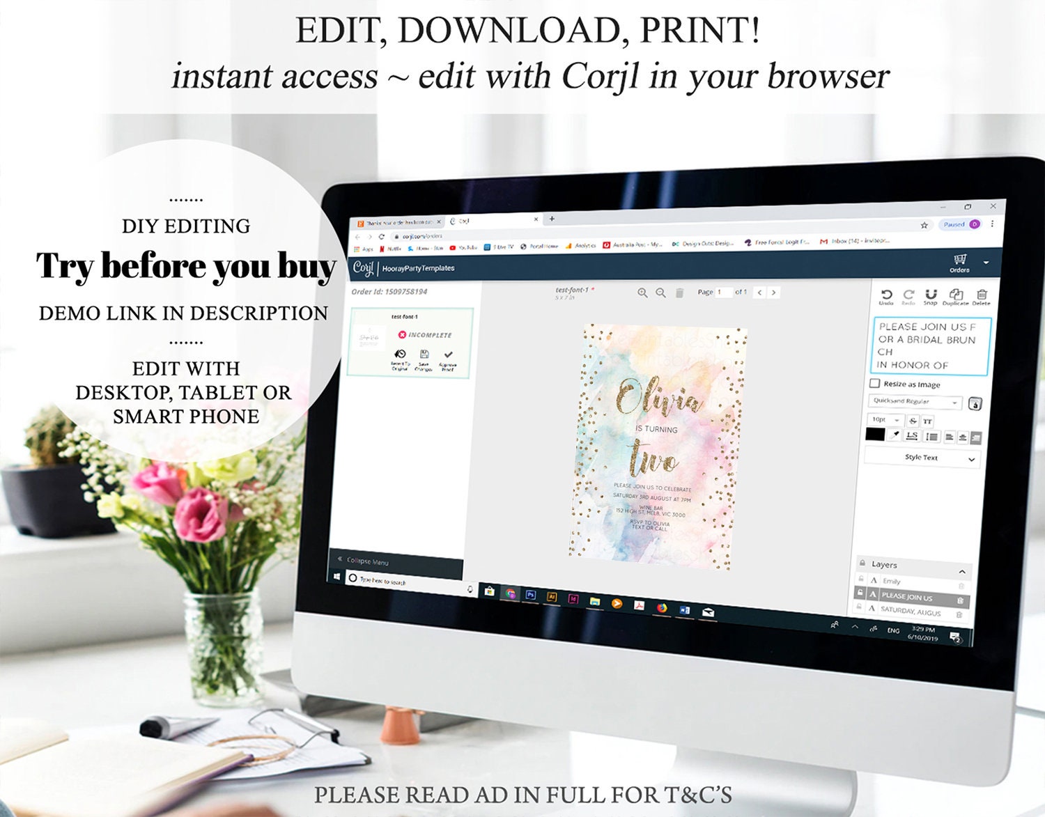 •Try before you buy! • DEMO LINK- https://www.corjl.com/d/1DO61A MATCHING ITEMS: https://etsy.me/3llNMkz PLEASE READ AD IN FULL!! •Digital file. No physical item will be shipped •Do it yourself Editing. Edit online with Corjl or Edit with your mobile ITEM DETAILS Invitation size: 5’x7’ File type: PDF, JPEG Resolution: 300DPI PDF FILE OPTIONS: •Recommended for printing •Ability to print multiple per page (if size permits) •Option to include bleed/ trim marks JPG FILE OPTIONS: •Recommended for MMS/ SMS/ Electronic send out •Can be used to print as photo •Option to include bleed/ trim marks EDITING • Do it yourself editing • Mobile editing is available • Google chrome is the recommend browser for Corjl. Please download here for FREE: https://www.google.com/chrome/ • Using other browsers may not show all of Corjl's editing features • Editing on a desktop/ laptop computer is recommended to access all of Corjl features • Mobile editing is available, please use a desktop/ laptop computer to access all of Corjl features DOWNLOADS & EXPIRY •Maximum 3 downloads on the same edit •Link expires 30 days after purchase DOWNLOAD NOTICE •Once you have reached your download limits &/ “approve proof” in Corjl. You will not be able to request further downloads on your design. Further download requests are not permitted WHAT IS EDITABLE •Text - colours, fonts, size, move, delete & rotation. •Please see demo link for what you can and can’t do WHAT YOU CAN’T EDIT •Template size •Template orientation •Graphics CAN NOT BE deleted, moved, or changed in colour •Please see demo link for what you can and can’t do HOW TO 1. Choose design template & checkout on Etsy. 2. Email will be sent from Corjl. Follow link to access template 3. Edit, save & print INSTRUCTIONS •Instructions on how to edit your design have been written by Corjl and will be available with your purchase. PRINTING •Colours can vary depending on the monitor, printer & cardstock •Can be printed at home •Home printing will require you to select the high quality print settings, select appropriate paper thickness & click "Actual size" prior to you printing •This design was test printed on 100 gsm paper •Can be printed at local print shop. Please check printing requirements & any printing restrictions prior to purchase PERSONAL USE ONLY. This item cannot be shared, re-sold, or used commercially for profit. REFUND POLICY •We are unable to provide a refund/ exchange on commenced & completed work, instant downloads or self-editing link templates. Please use the demo link to work out if this product is right for you. Copyright © 2018 by InvitePrintablesShop PTY LTD All rights reserved. This file or any portion thereof may not be reproduced or resold without the express written permission of the publisher (including edits to the design). Our files are provided as high-resolution PDFs – the end result is dependent upon the printer and paper used. If using a professional printing company, InvitePrintablesShop are not responsible for their specific printing requirements, paper or colour quality. Any changes required to the template are not included with your purchase – the files come as described in the listing only and cannot be changed. Thank you for visiting Invite Printables Shop:)