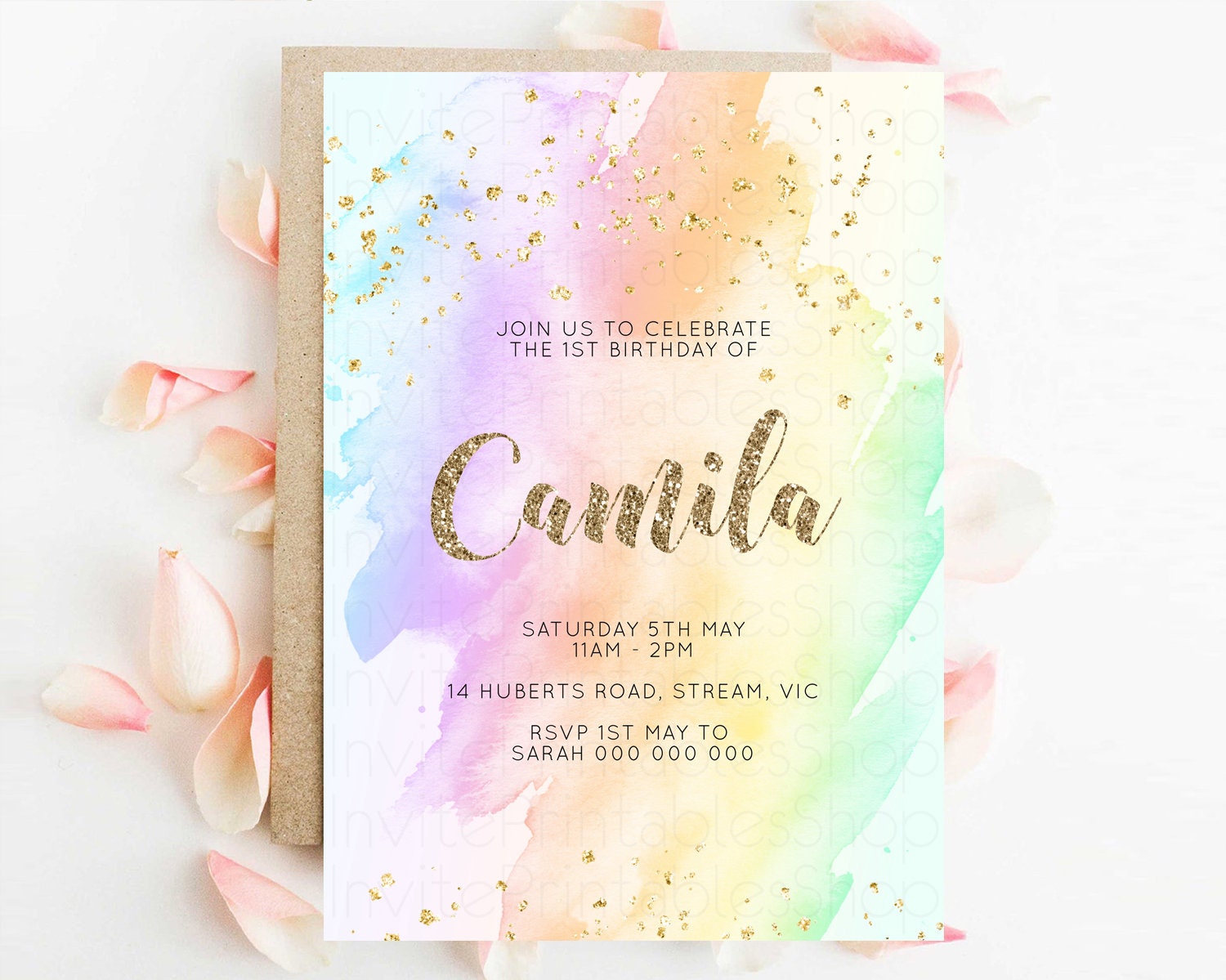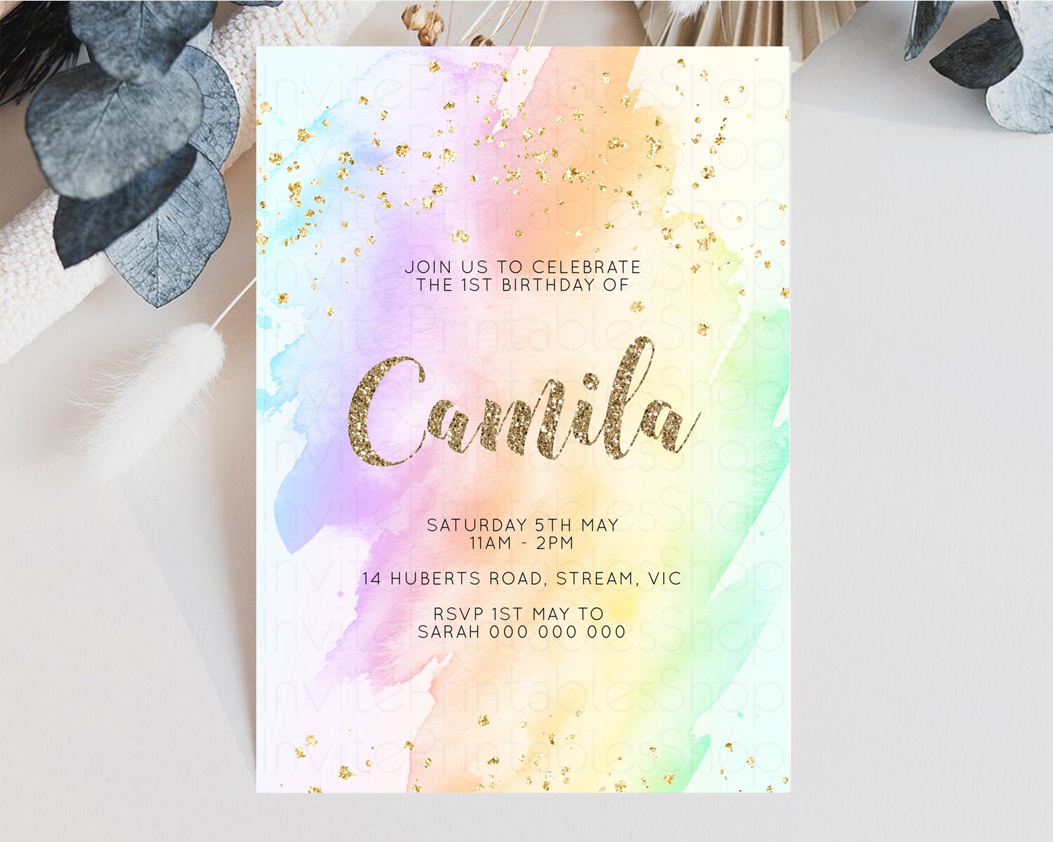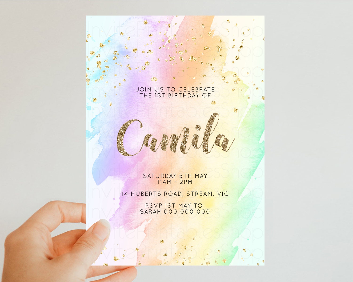 Rainbow Birthday Invitation Glitter Pastel Invitation Colorful Watercolor Gold Foil Splatter Sprinkle Ombre 1st 2nd 3rd Birthday Invite g602