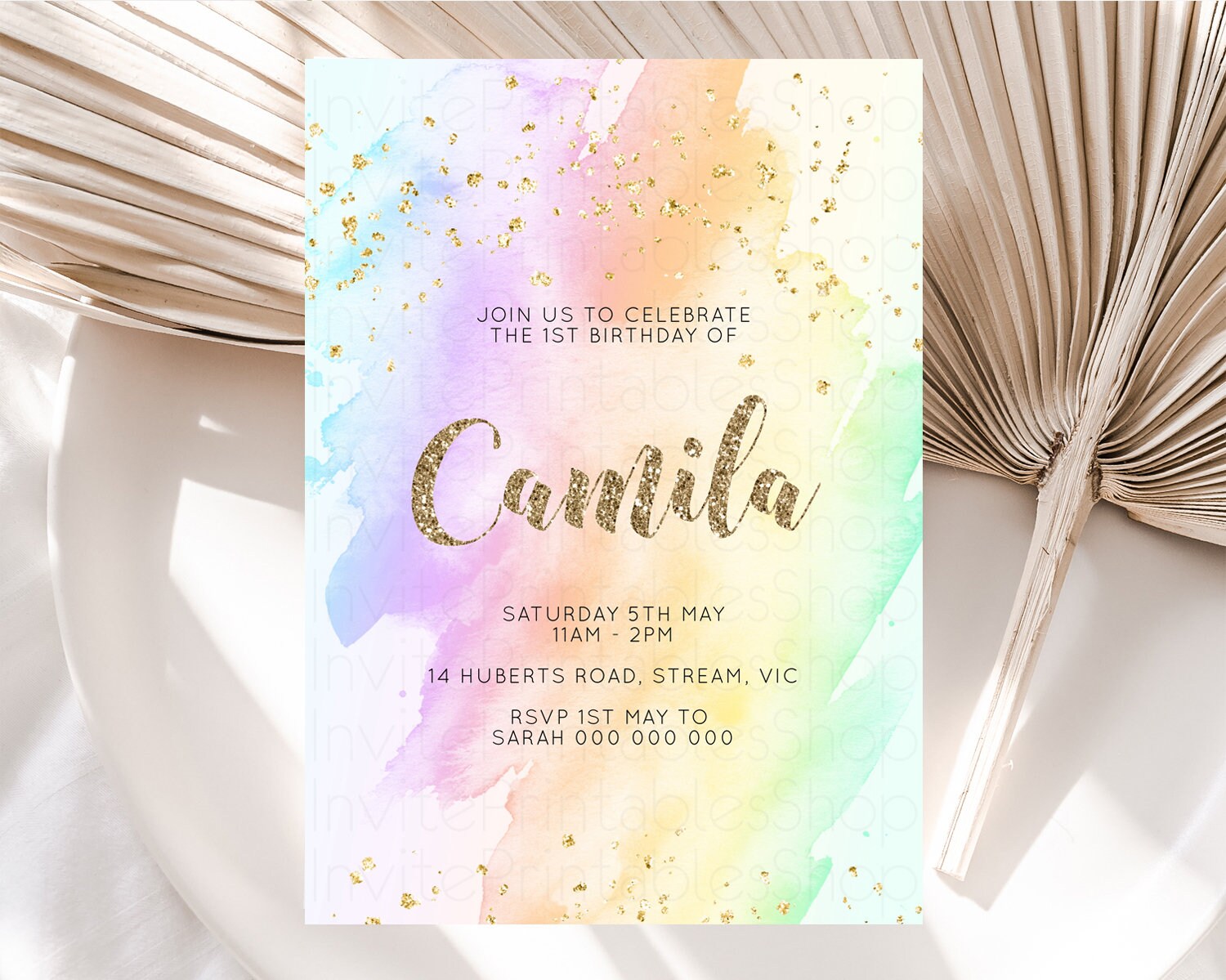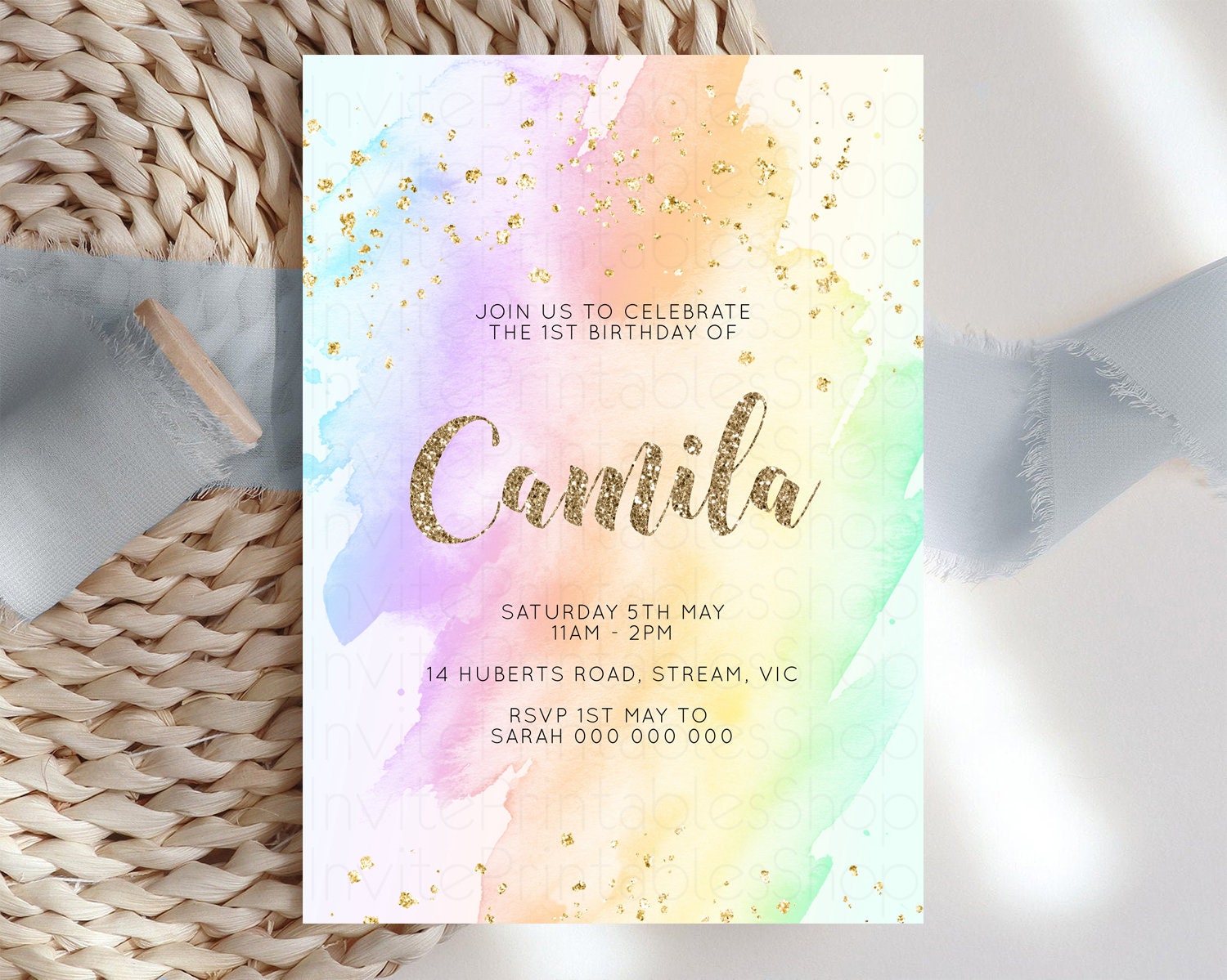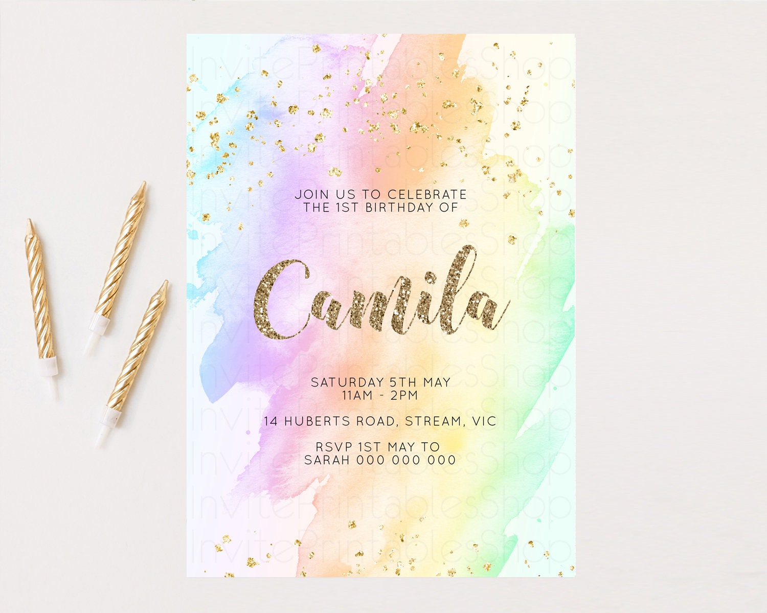 Rainbow Birthday Invitation Glitter Pastel Invitation Colorful Watercolor Gold Foil Splatter Sprinkle Ombre 1st 2nd 3rd Birthday Invite g602