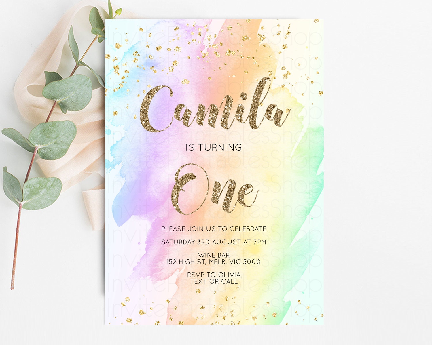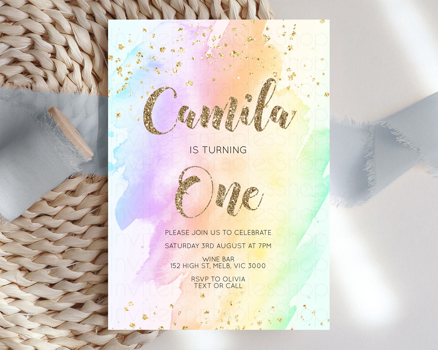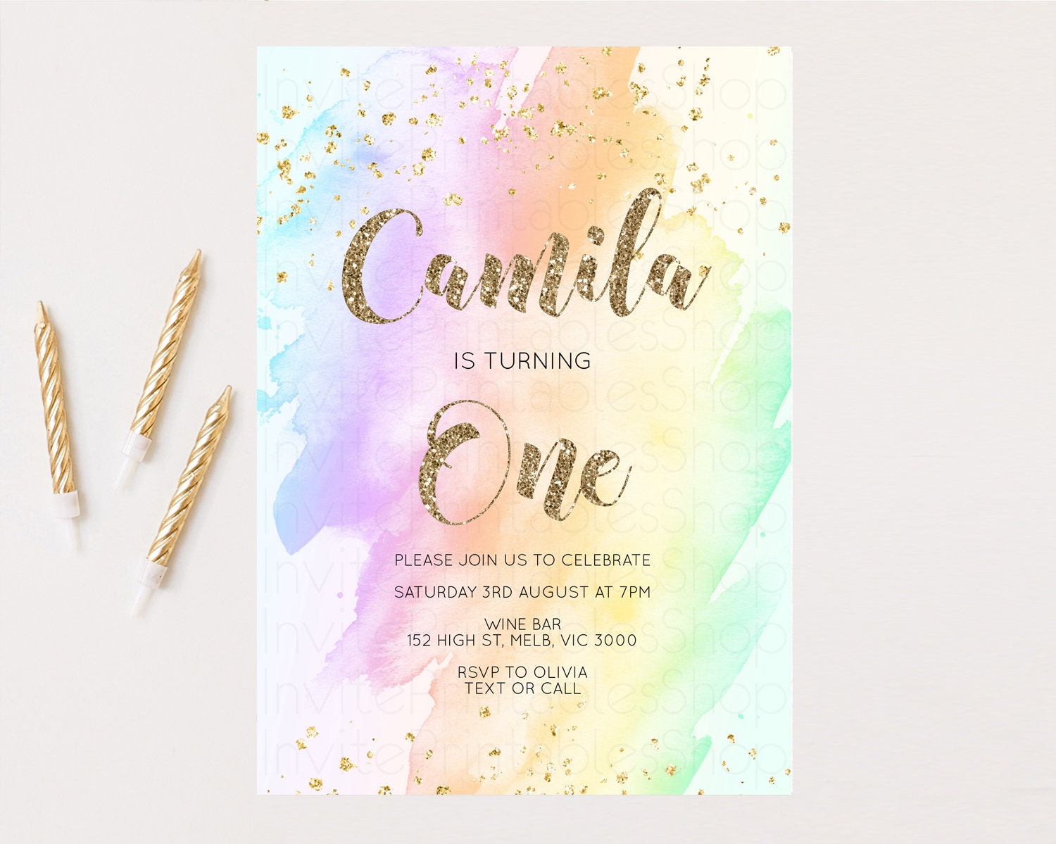 Rainbow Birthday Invitation Glitter Pastel Invitation Colorful Watercolor Gold Foil Splatter Sprinkle Ombre 1st 2nd 3rd Birthday Invite g602