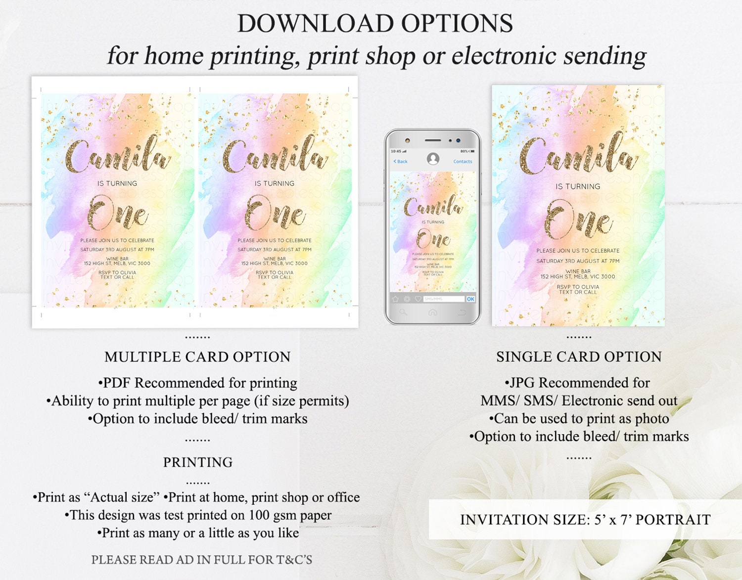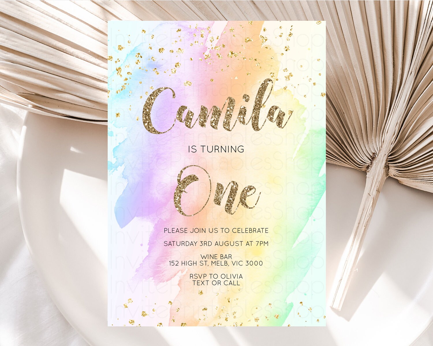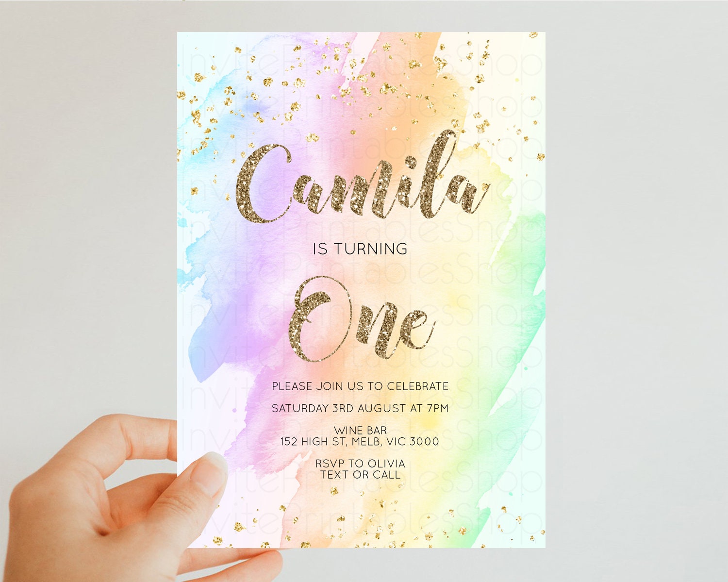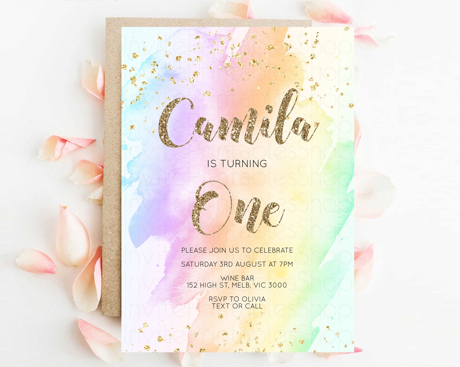 Rainbow Birthday Invitation Glitter Pastel Invitation Colorful Watercolor Gold Foil Splatter Sprinkle Ombre 1st 2nd 3rd Birthday Invite g602