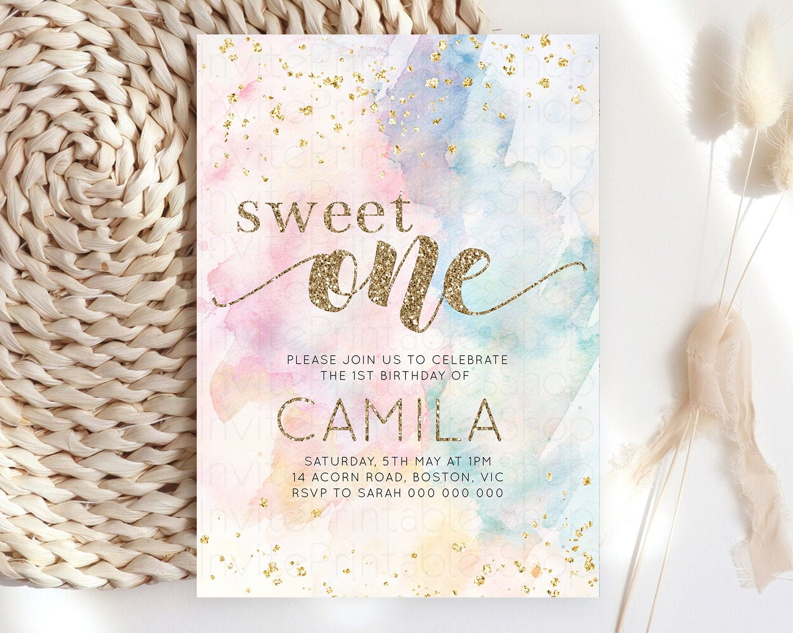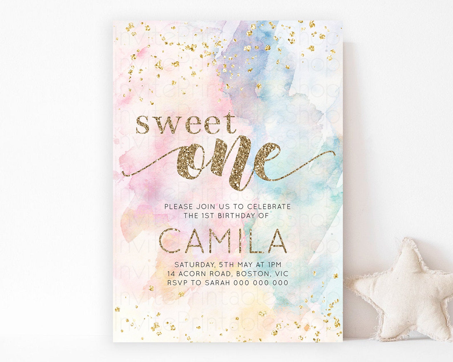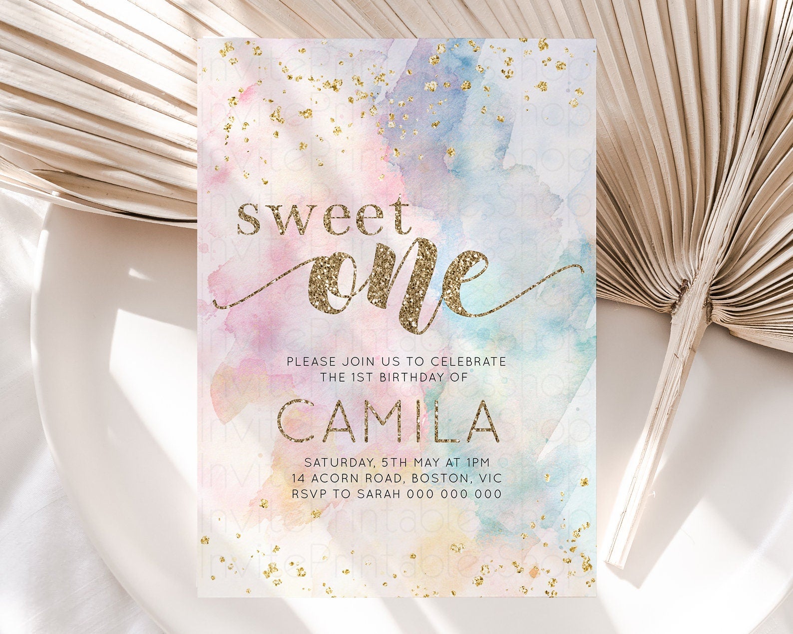 Rainbow Birthday Invitation Glitter Pastel Invitation Colorful Watercolor Gold Foil Splatter Sprinkle Ombre 1st 2nd 3rd Sweet One Invite 276