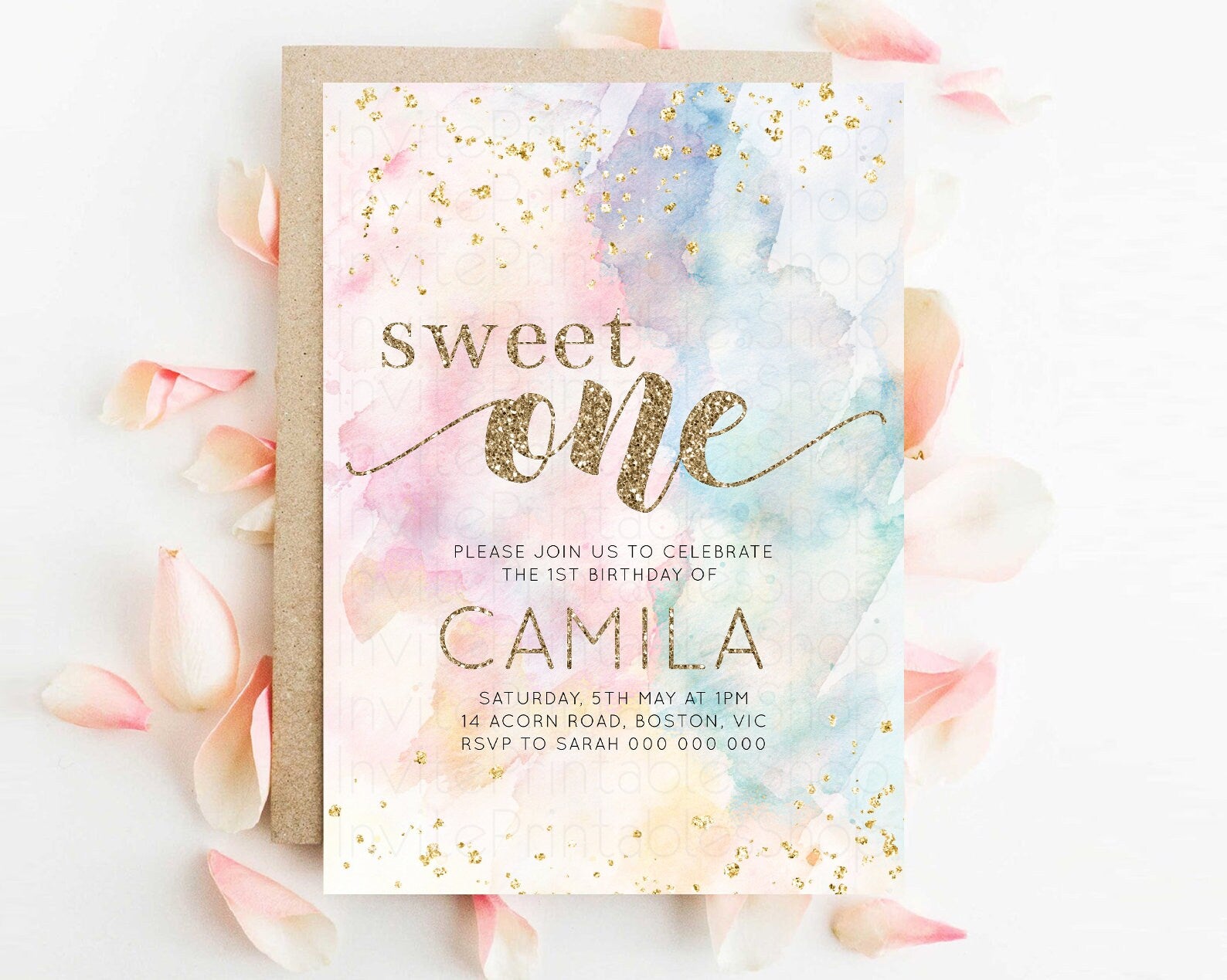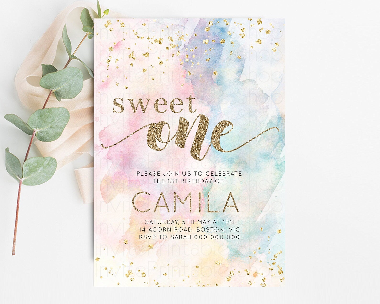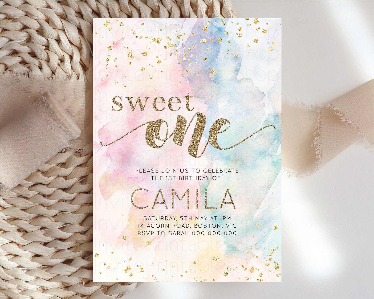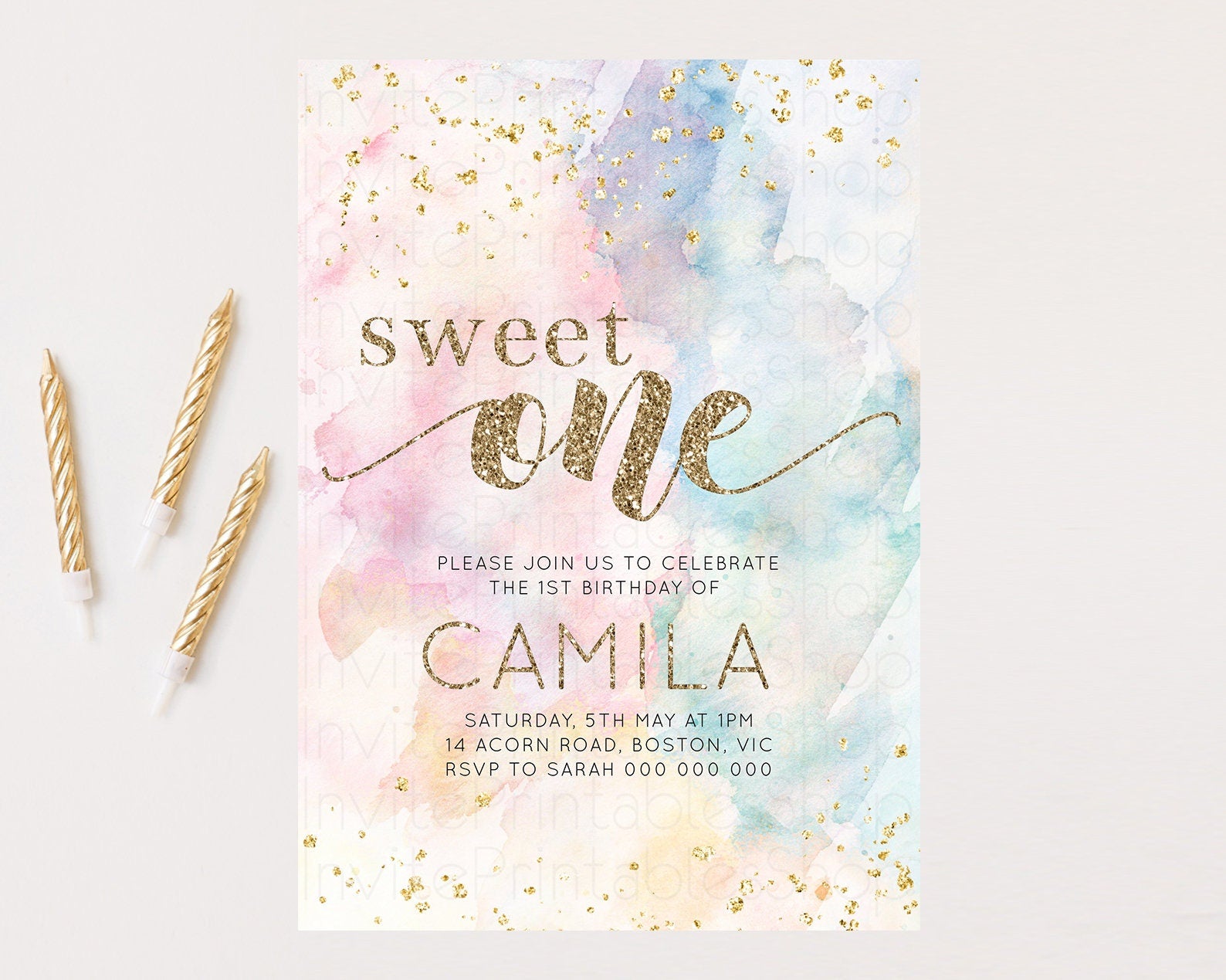 Rainbow Birthday Invitation Glitter Pastel Invitation Colorful Watercolor Gold Foil Splatter Sprinkle Ombre 1st 2nd 3rd Sweet One Invite 276