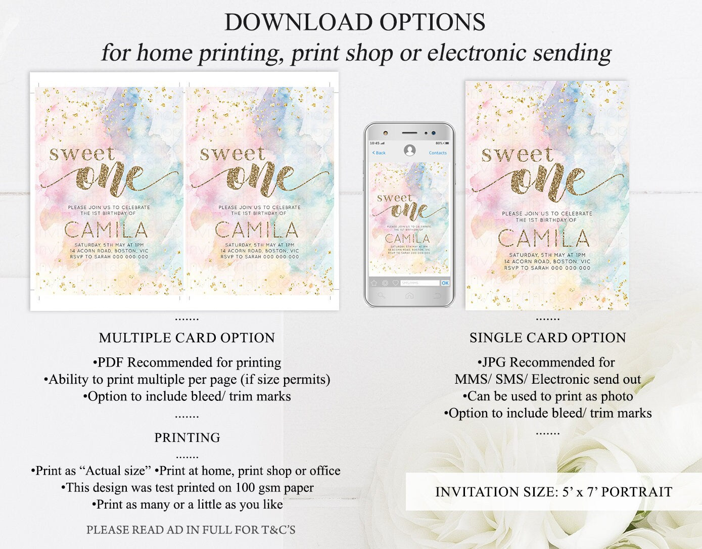 •Try before you buy! • DEMO LINK- https://www.corjl.com/d/1POOFH MATCHING ITEMS: https://etsy.me/3llNMkz PLEASE READ AD IN FULL!! •Digital file. No physical item will be shipped •Do it yourself Editing. Edit online with Corjl or Edit with your mobile ITEM DETAILS Invitation size: 5’x7’ File type: PDF, JPEG Resolution: 300DPI PDF FILE OPTIONS: •Recommended for printing •Ability to print multiple per page (if size permits) •Option to include bleed/ trim marks JPG FILE OPTIONS: •Recommended for MMS/ SMS/ Electronic send out •Can be used to print as photo •Option to include bleed/ trim marks EDITING • Do it yourself editing • Mobile editing is available • Google chrome is the recommend browser for Corjl. Please download here for FREE: https://www.google.com/chrome/ • Using other browsers may not show all of Corjl's editing features • Editing on a desktop/ laptop computer is recommended to access all of Corjl features • Mobile editing is available, please use a desktop/ laptop computer to access all of Corjl features DOWNLOADS & EXPIRY •Maximum 10 downloads on the same edit •Link expires 60 days after purchase DOWNLOAD NOTICE •Once you have reached your download limits &/ “approve proof” in Corjl. You will not be able to request further downloads on your design. Further download requests are not permitted WHAT IS EDITABLE •Text - colours, fonts, size, move, delete & rotation. •Please see demo link for what you can and can’t do WHAT YOU CAN’T EDIT •Template size •Template orientation •Graphics CAN NOT BE deleted, moved, or changed in colour •Please see demo link for what you can and can’t do HOW TO 1. Choose design template & checkout on Etsy. 2. Email will be sent from Corjl. Follow link to access template 3. Edit, save & print INSTRUCTIONS •Instructions on how to edit your design have been written by Corjl and will be available with your purchase. PRINTING •Colours can vary depending on the monitor, printer & cardstock •Can be printed at home •Home printing will require you to select the high quality print settings, select appropriate paper thickness & click "Actual size" prior to you printing •This design was test printed on 100 gsm paper •Can be printed at local print shop. Please check printing requirements & any printing restrictions prior to purchase PERSONAL USE ONLY. This item cannot be shared, re-sold, or used commercially for profit. REFUND POLICY •We are unable to provide a refund/ exchange on commenced & completed work, instant downloads or self-editing link templates. Please use the demo link to work out if this product is right for you. Copyright © 2018 by InvitePrintablesShop PTY LTD All rights reserved. This file or any portion thereof may not be reproduced or resold without the express written permission of the publisher (including edits to the design). Our files are provided as high-resolution PDFs – the end result is dependent upon the printer and paper used. If using a professional printing company, InvitePrintablesShop are not responsible for their specific printing requirements, paper or colour quality. Any changes required to the template are not included with your purchase – the files come as described in the listing only and cannot be changed. Thank you for visiting Invite Printables Shop:)