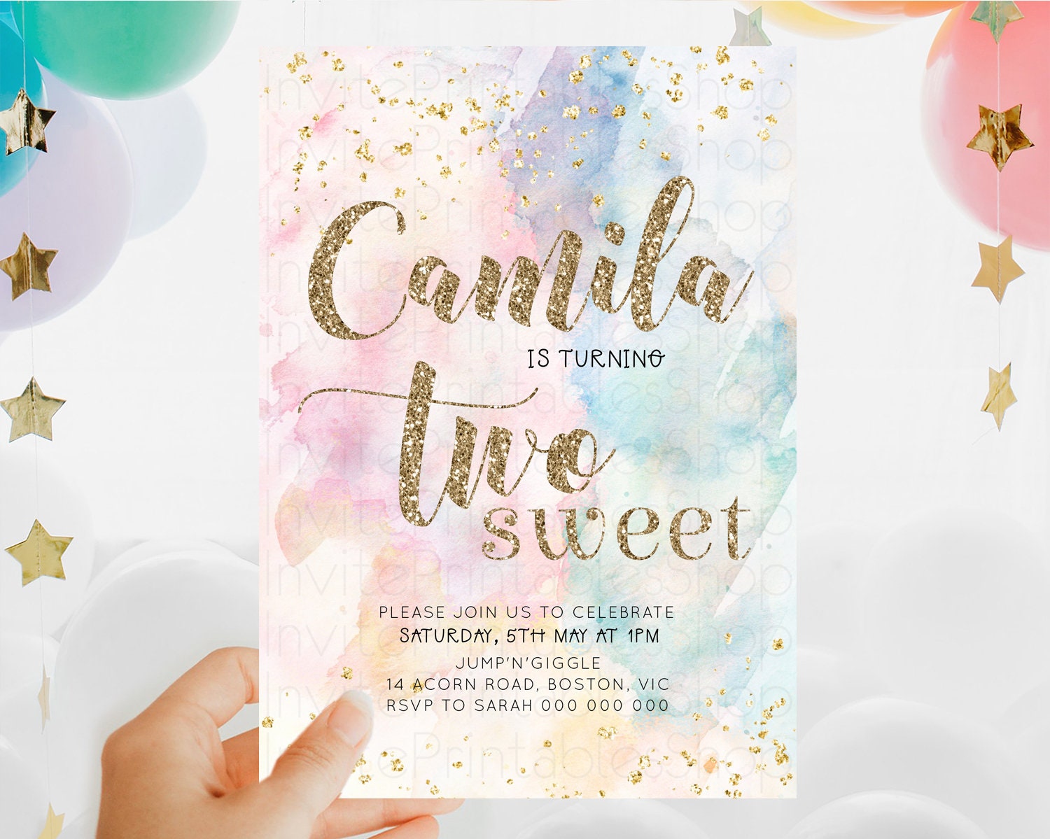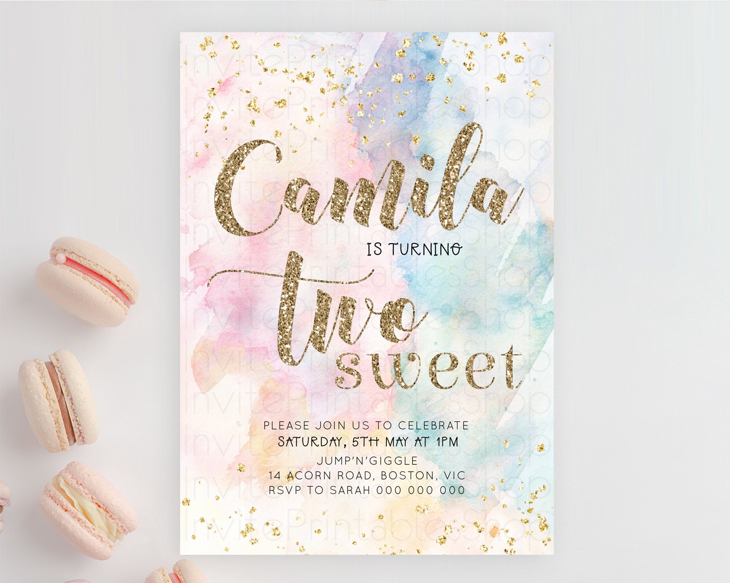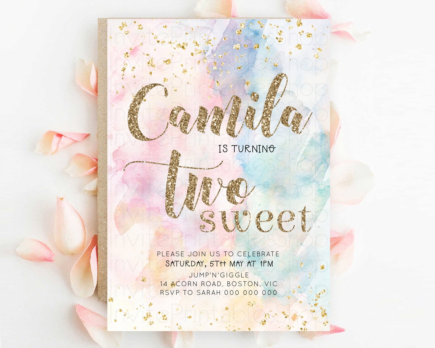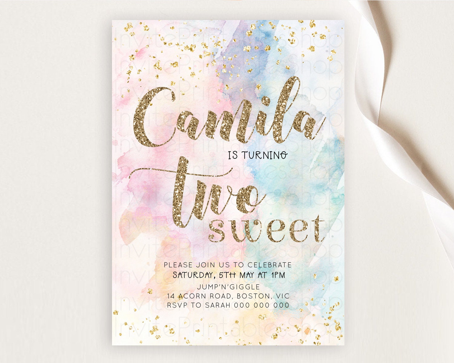 Rainbow Birthday Invitation Glitter Pastel Invitation Colorful Watercolor Gold Foil Splatter Sprinkle Ombre Two Sweet Invitation D10264