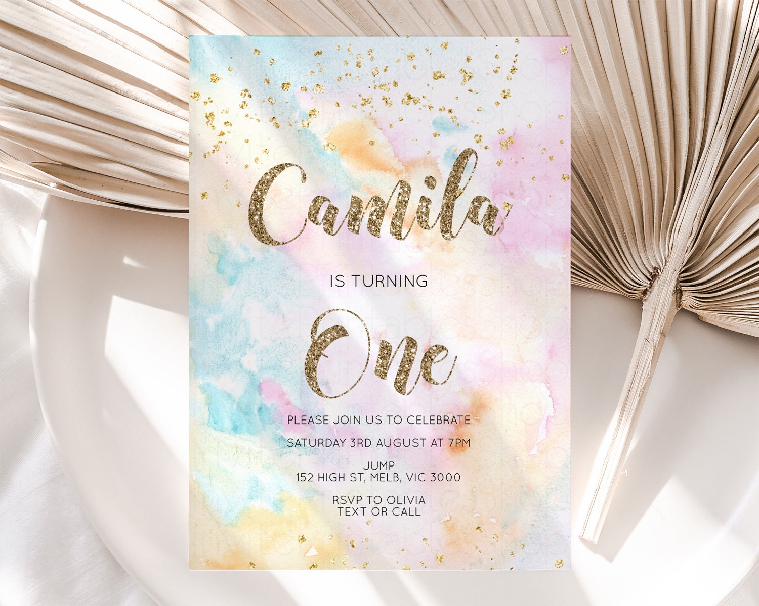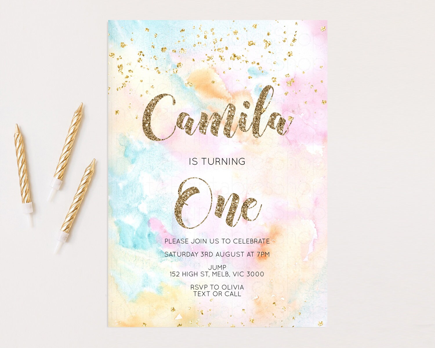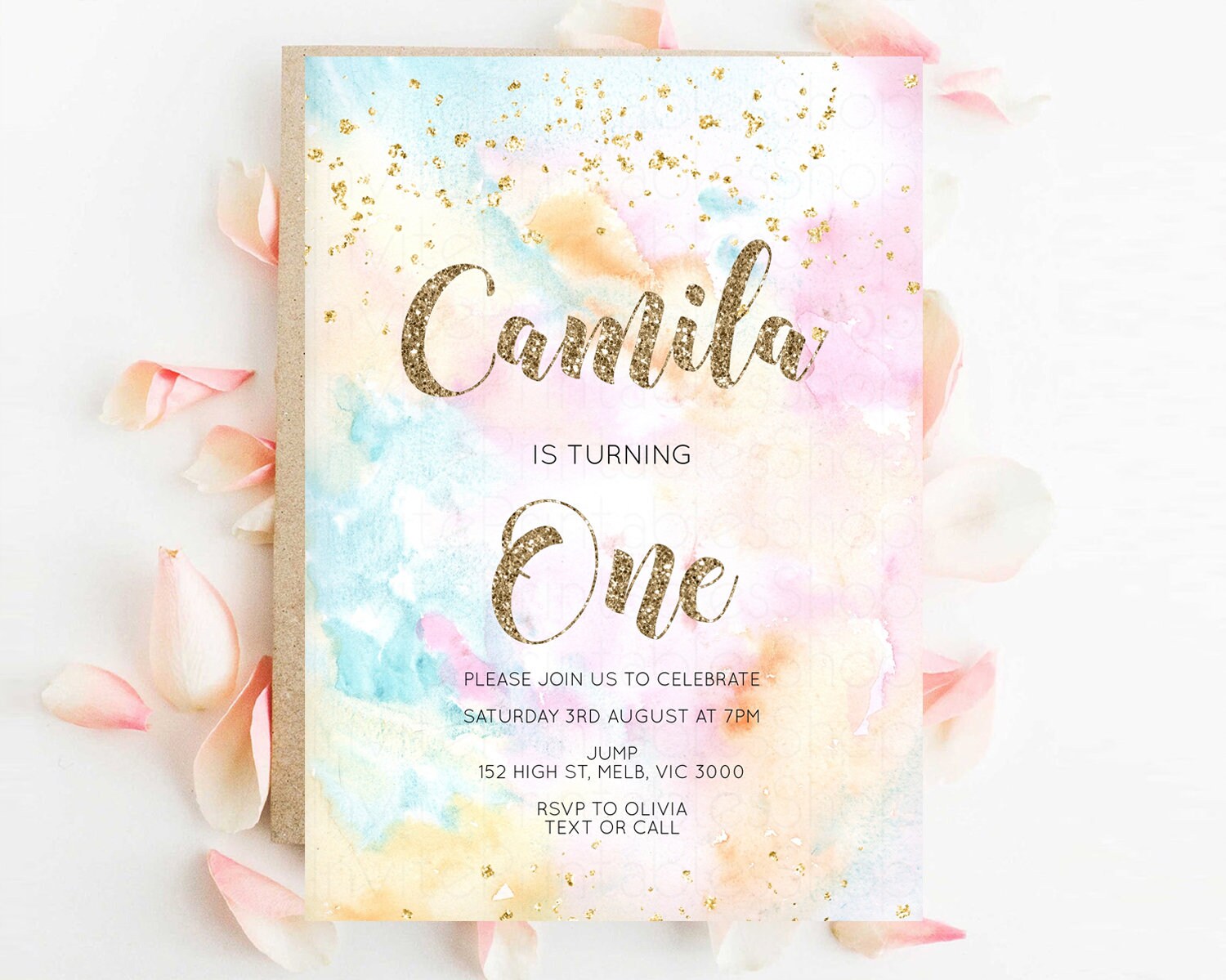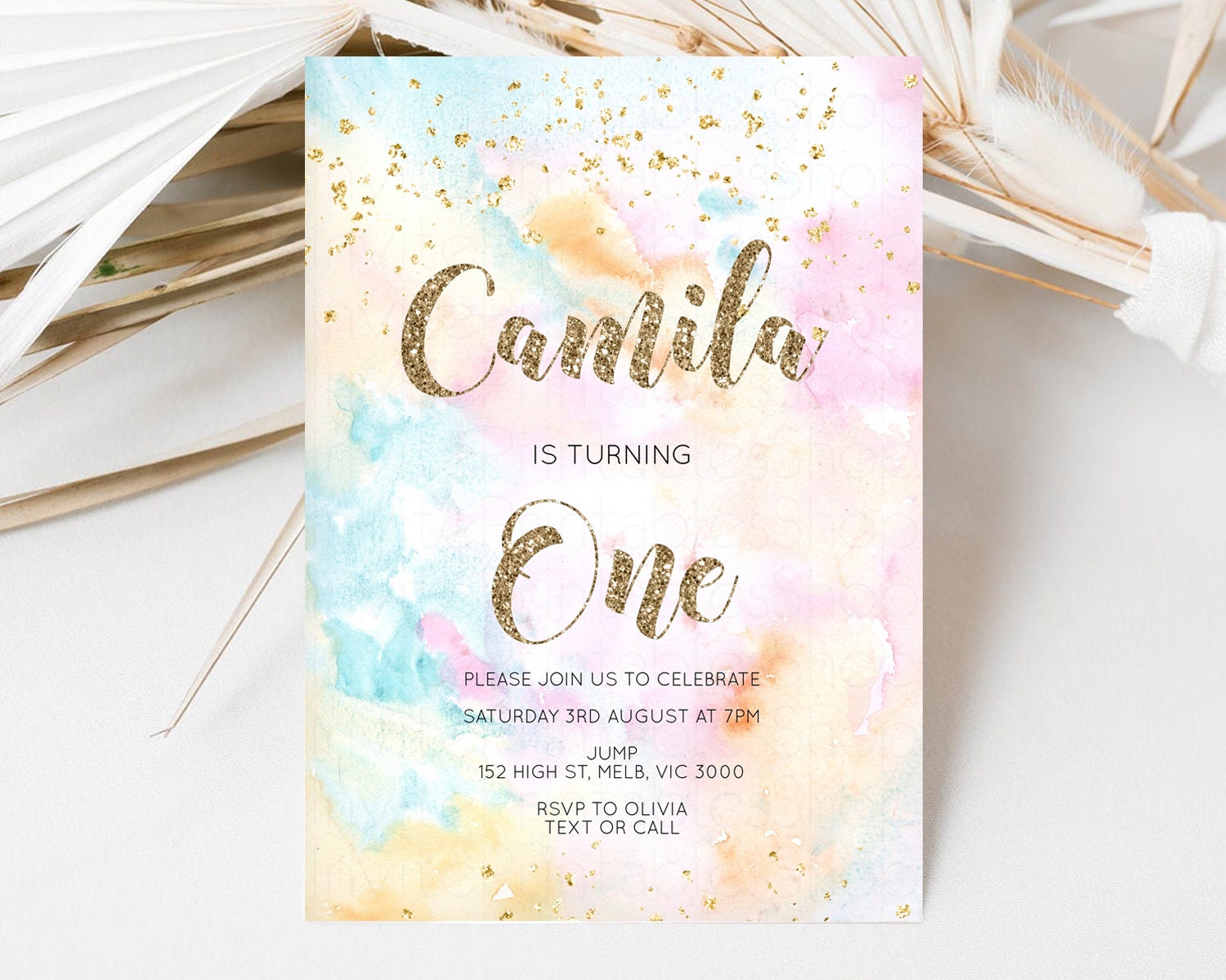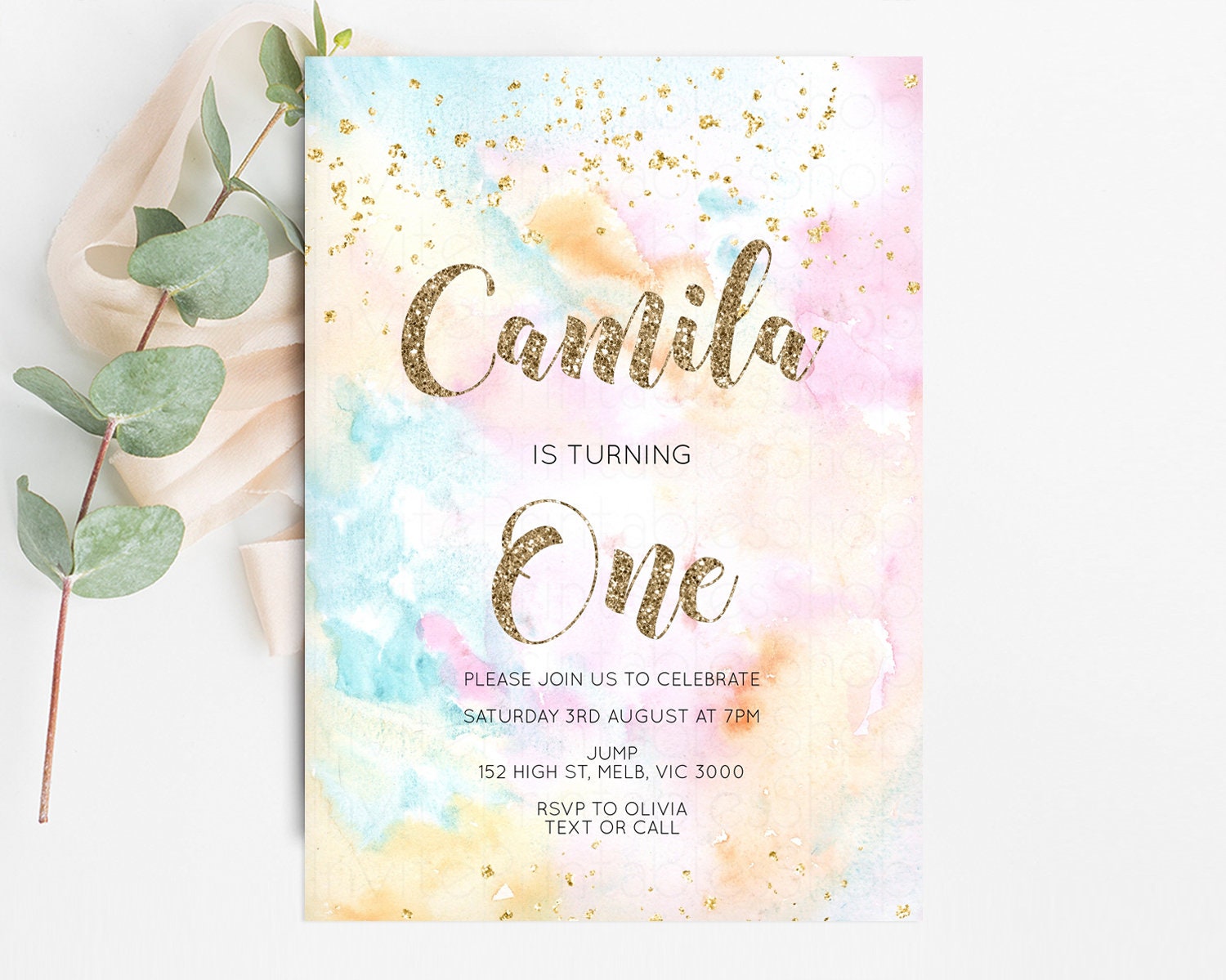 Rainbow Birthday Invitation Glitter Pastel Invitation Colorful Watercolor Gold Foil Splatter Sprinkles Ombre Glitter Invite 1st 2nd 3rd G566