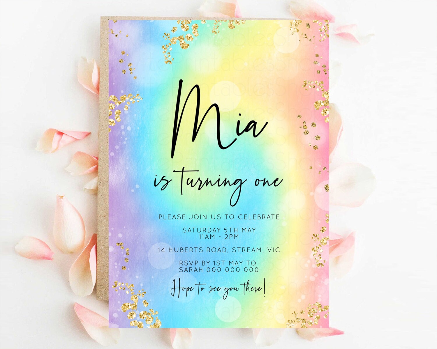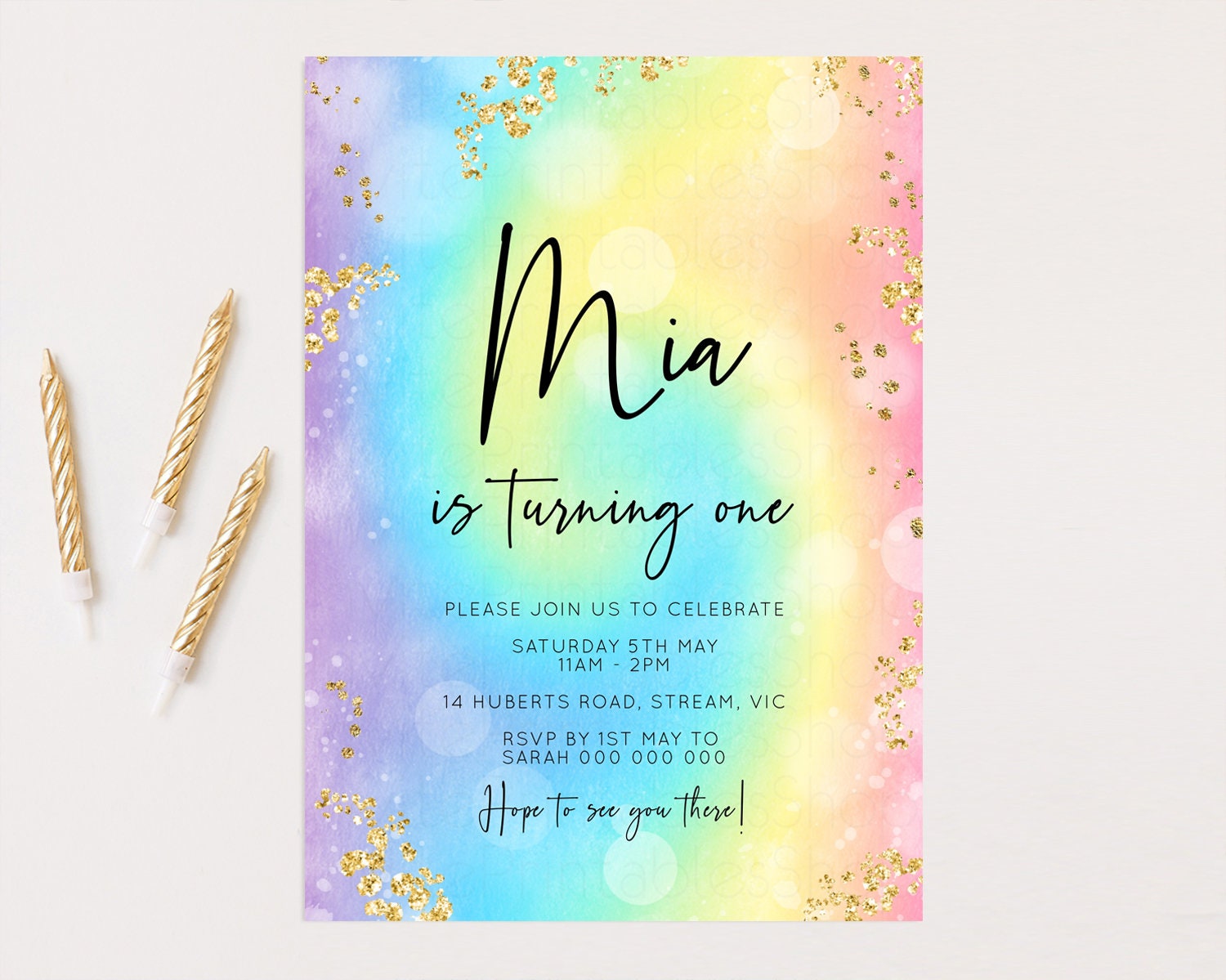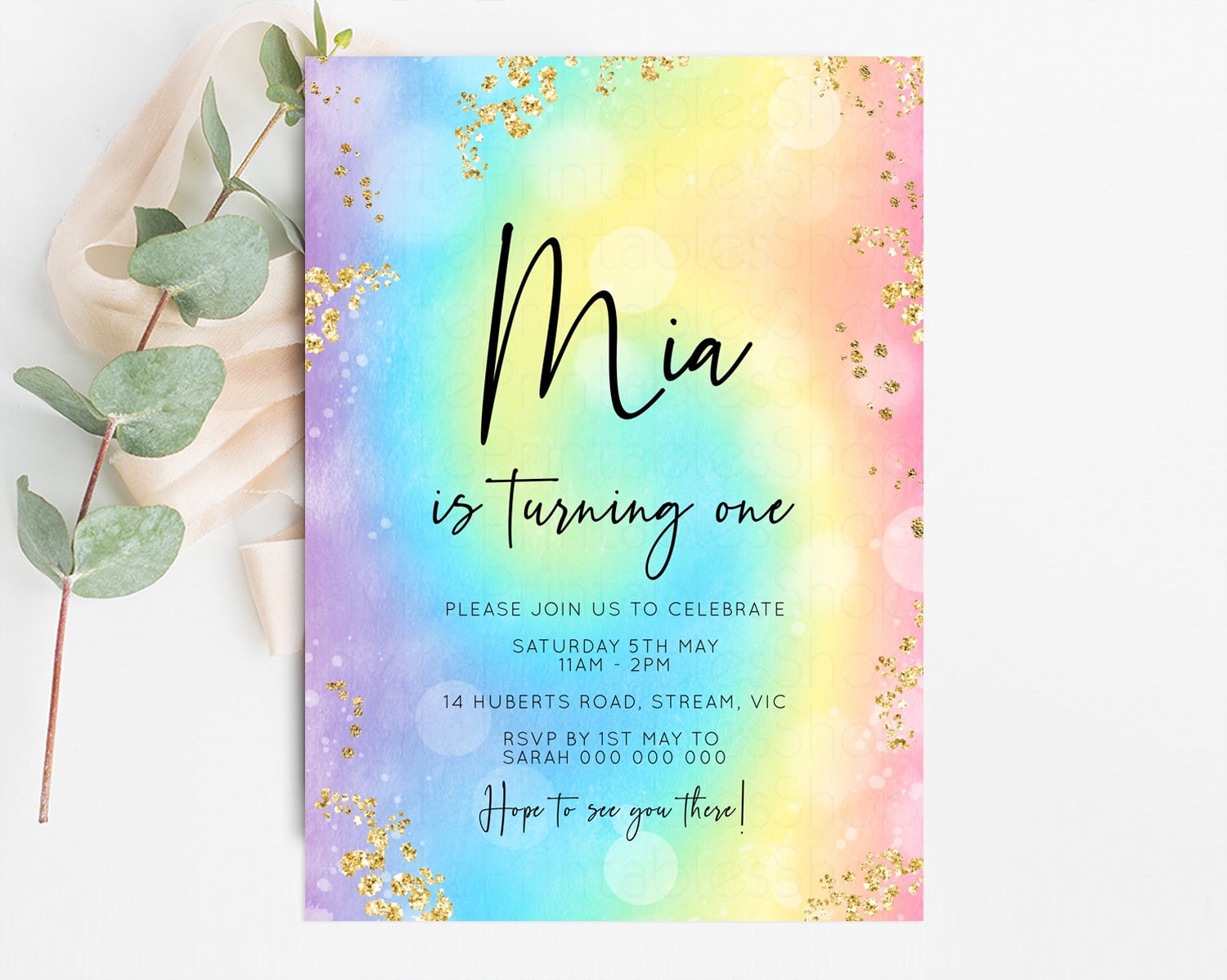 Rainbow Birthday Invitation Glitter Pastel Invitation Colorful Watercolor Gold Foil Splatter Sprinkles Ombre Glitter Invite 1st 2nd 3rd t571
