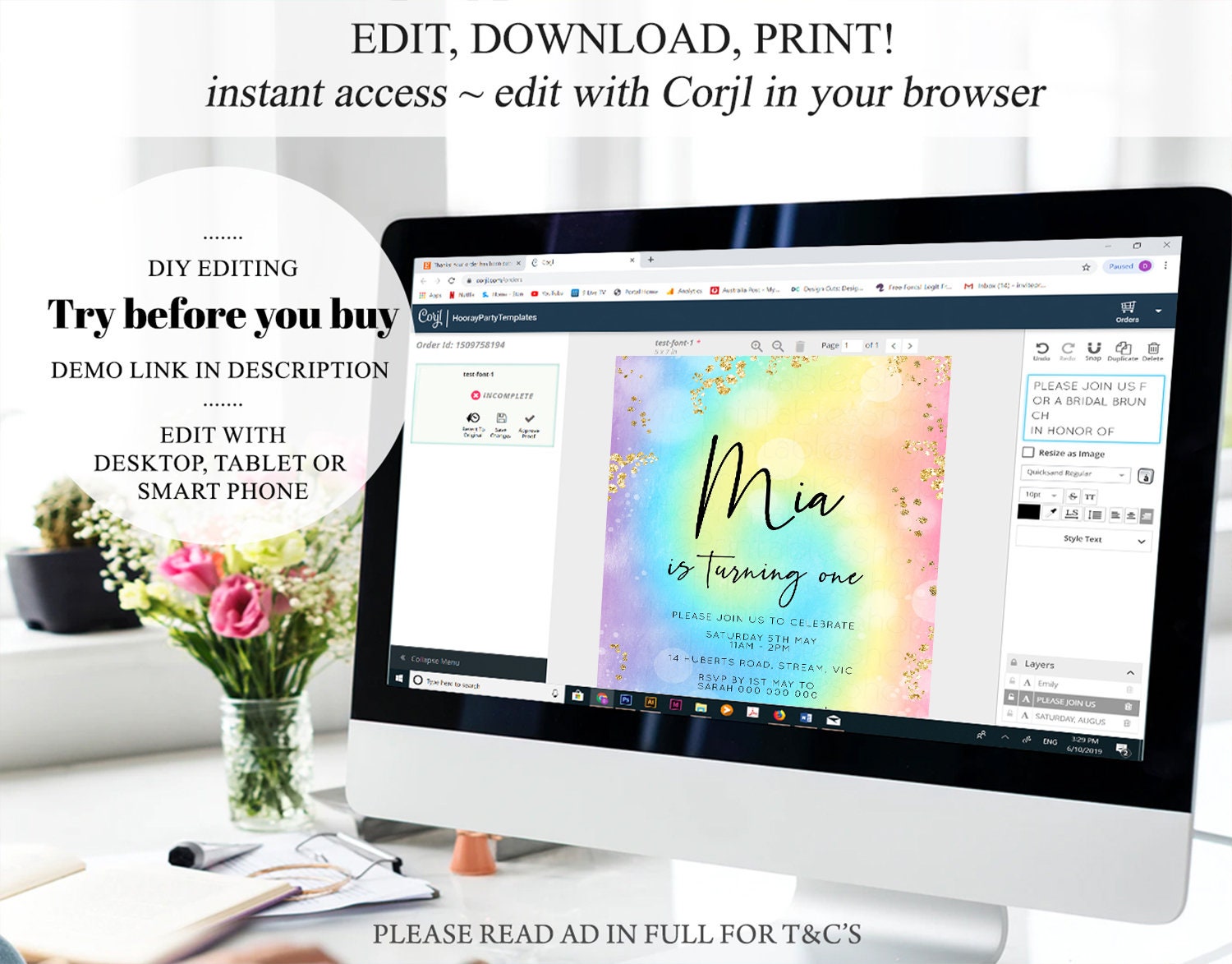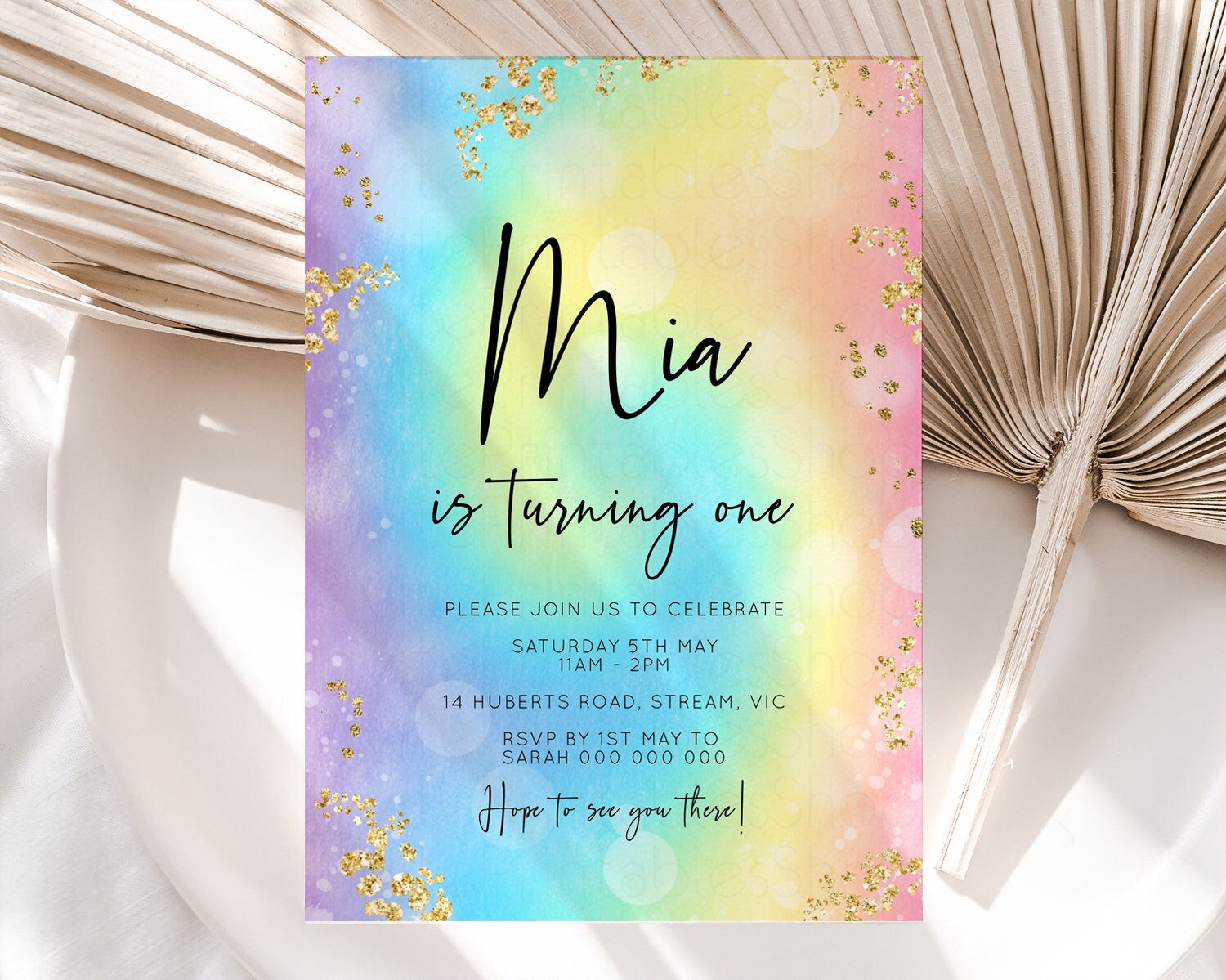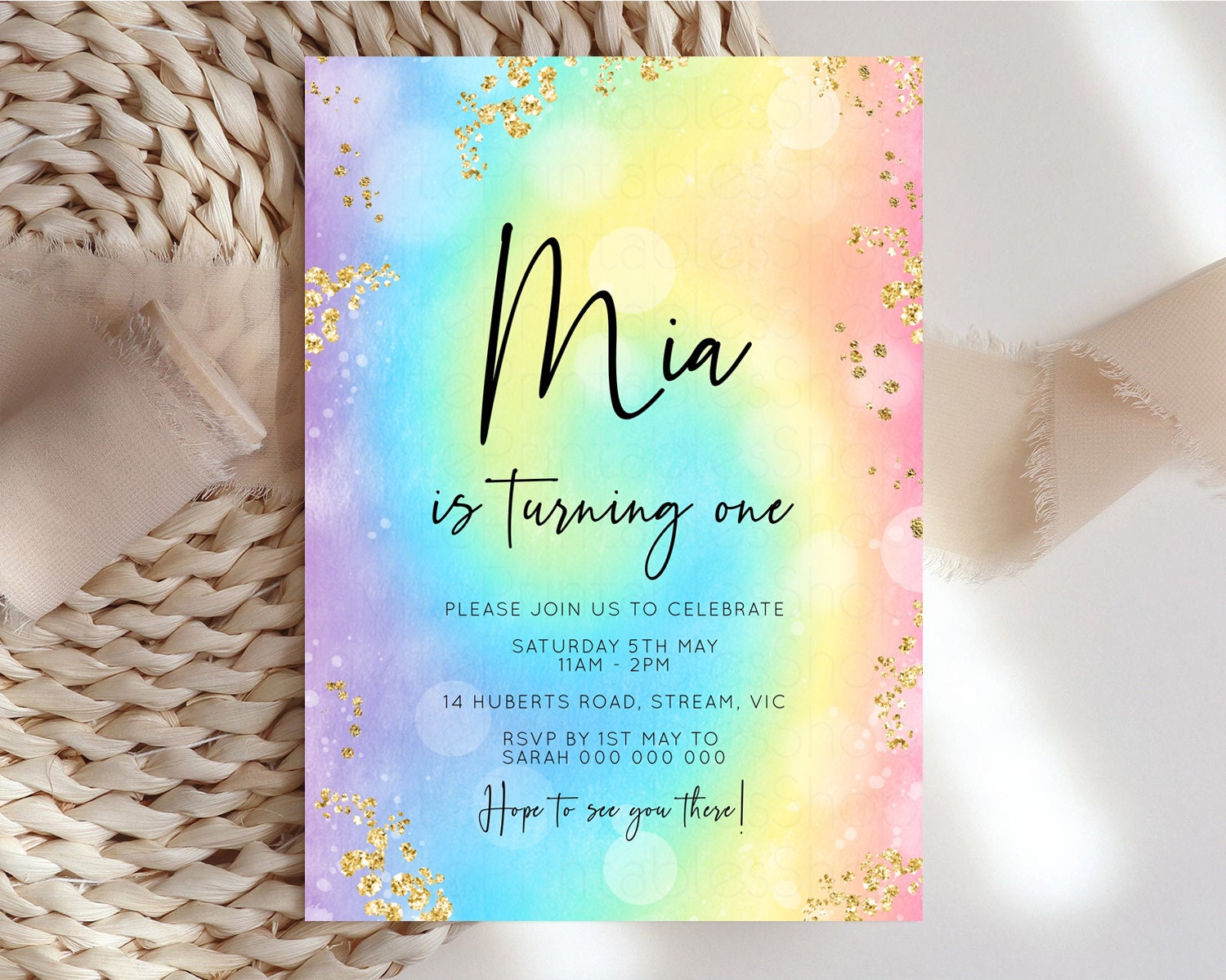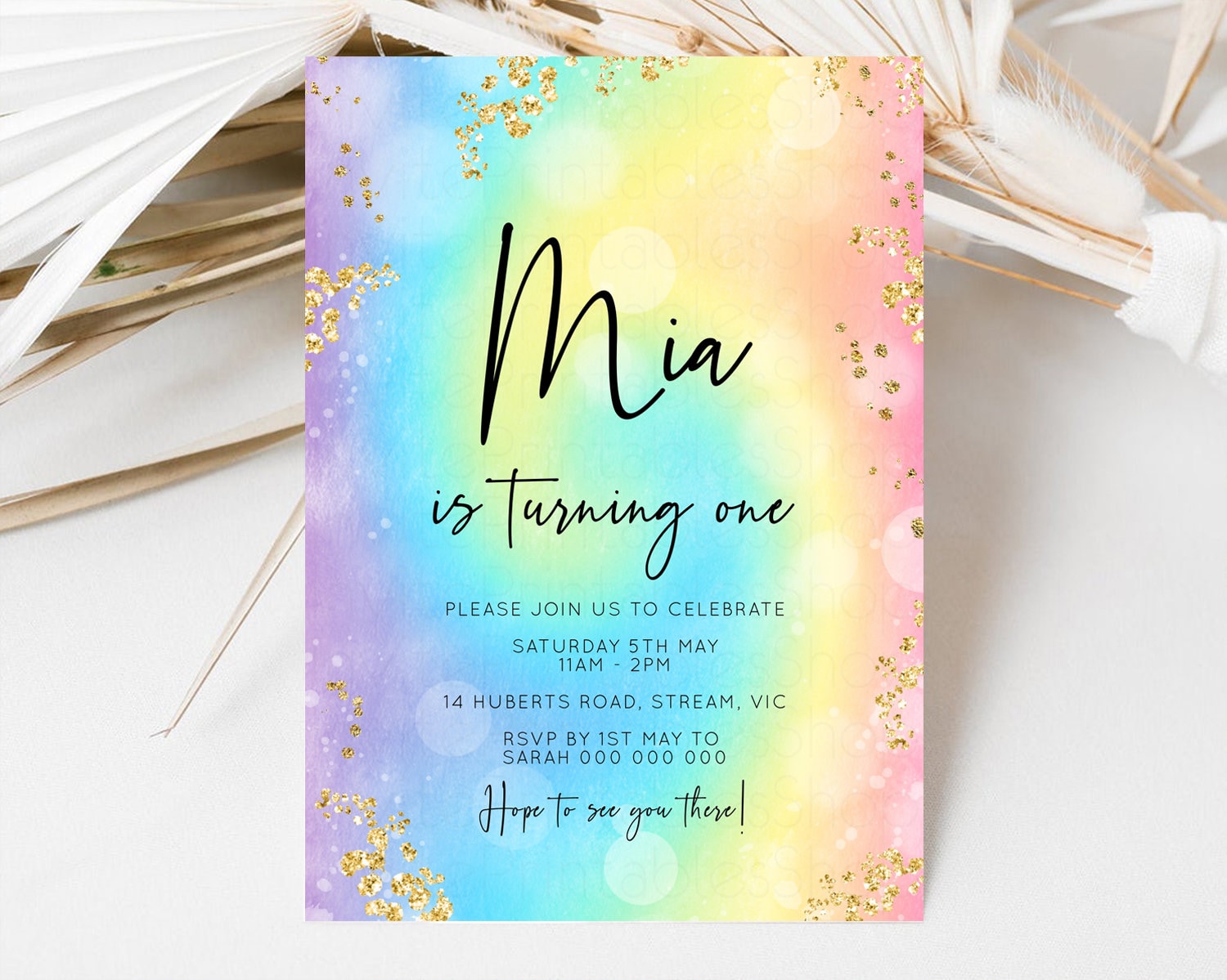 Rainbow Birthday Invitation Glitter Pastel Invitation Colorful Watercolor Gold Foil Splatter Sprinkles Ombre Glitter Invite 1st 2nd 3rd t571