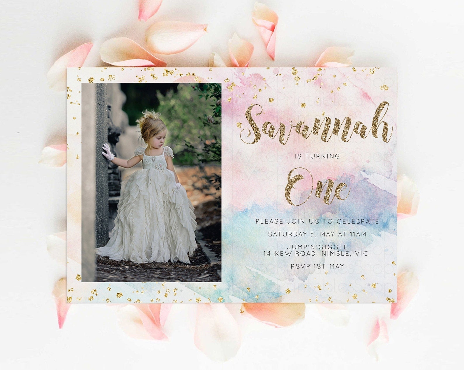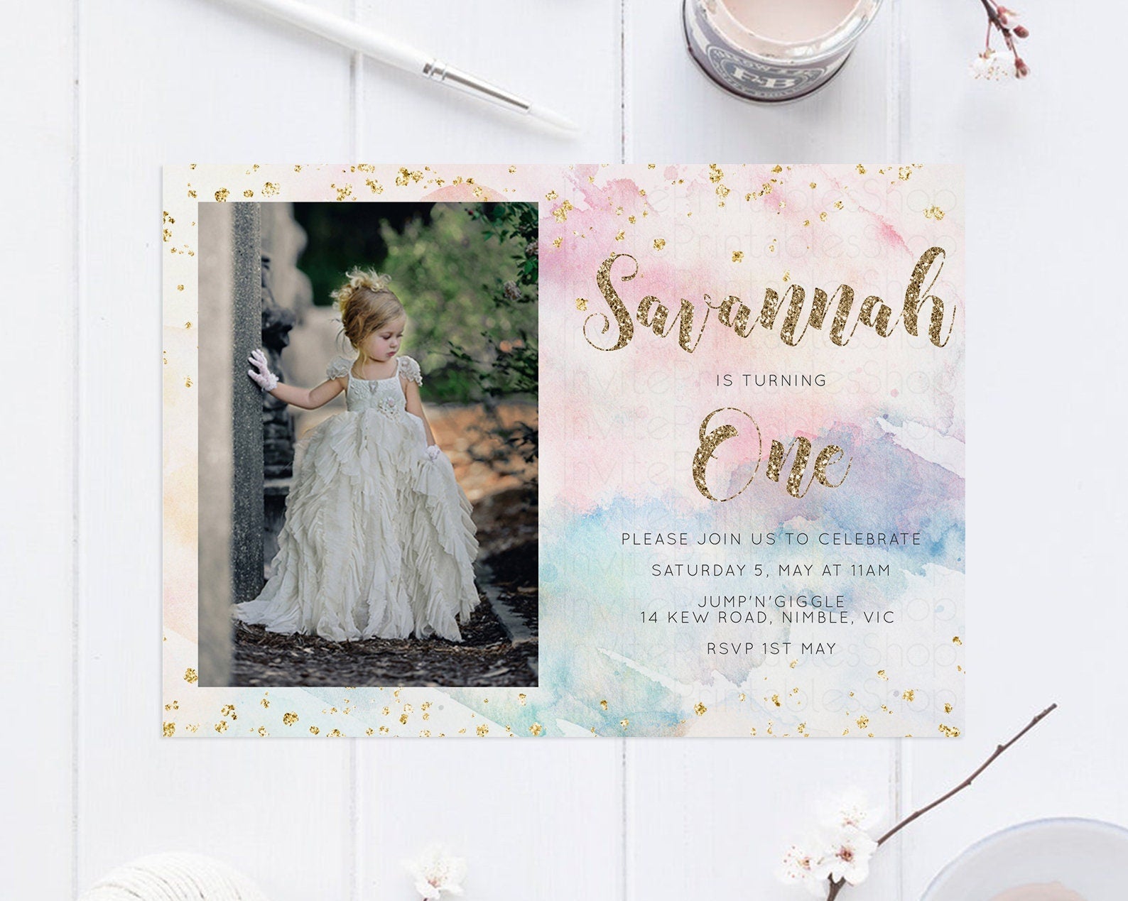 Rainbow Birthday Invitation Glitter Pastel Invitation Colorful Watercolor Photo Invite Gold Foil Splatter Sprinkles Ombre 1st 2nd 3rd D10264