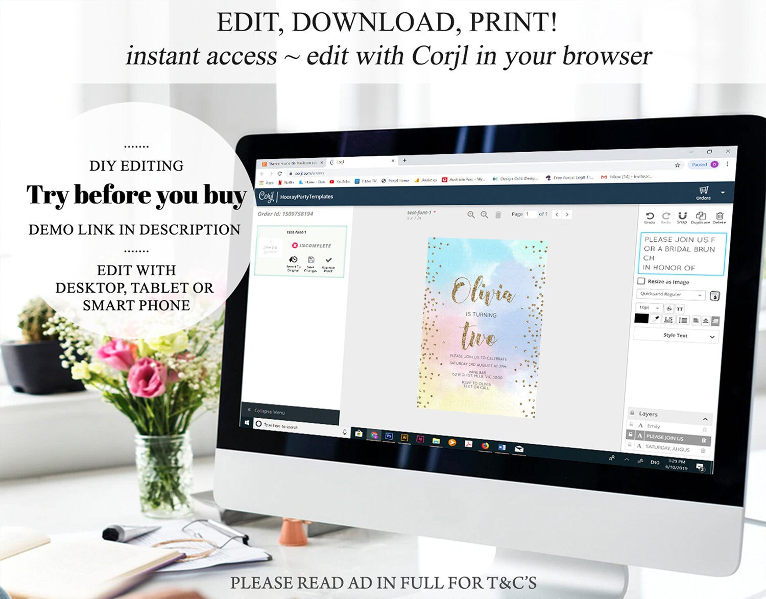•Try before you buy! • DEMO LINK- https://www.corjl.com/d/21NJ3F PLEASE READ AD IN FULL!! •Digital file. No physical item will be shipped •Do it yourself Editing. Edit online with Corjl or Edit with your mobile ITEM DETAILS Invitation size: 5’x7’ File type: PDF, JPEG Resolution: 300DPI PDF FILE OPTIONS: •Recommended for printing •Ability to print multiple per page (if size permits) •Option to include bleed/ trim marks JPG FILE OPTIONS: •Recommended for MMS/ SMS/ Electronic send out •Can be used to print as photo •Option to include bleed/ trim marks EDITING • Do it yourself editing • Mobile editing is available • Google chrome is the recommend browser for Corjl. Please download here for FREE: https://www.google.com/chrome/ • Using other browsers may not show all of Corjl's editing features • Editing on a desktop/ laptop computer is recommended to access all of Corjl features • Mobile editing is available, please use a desktop/ laptop computer to access all of Corjl features DOWNLOADS & EXPIRY •Maximum 3 downloads on the same edit •Link expires 30 days after purchase DOWNLOAD NOTICE •Once you have reached your download limits &/ “approve proof” in Corjl. You will not be able to request further downloads on your design. Further download requests are not permitted WHAT IS EDITABLE •Text - colours, fonts, size, move, delete & rotation. •Please see demo link for what you can and can’t do WHAT YOU CAN’T EDIT •Template size •Template orientation •Graphics CAN NOT BE deleted, moved, or changed in colour •Please see demo link for what you can and can’t do HOW TO 1. Choose design template & checkout on Etsy. 2. Email will be sent from Corjl. Follow link to access template 3. Edit, save & print INSTRUCTIONS •Instructions on how to edit your design have been written by Corjl and will be available with your purchase. PRINTING •Colours can vary depending on the monitor, printer & cardstock •Can be printed at home •Home printing will require you to select the high quality print settings, select appropriate paper thickness & click "Actual size" prior to you printing •This design was test printed on 100 gsm paper •Can be printed at local print shop. Please check printing requirements & any printing restrictions prior to purchase PERSONAL USE ONLY. This item cannot be shared, re-sold, or used commercially for profit. REFUND POLICY •We are unable to provide a refund/ exchange on commenced & completed work, instant downloads or self-editing link templates. Please use the demo link to work out if this product is right for you. Copyright © 2018 by InvitePrintablesShop PTY LTD All rights reserved. This file or any portion thereof may not be reproduced or resold without the express written permission of the publisher (including edits to the design). Our files are provided as high-resolution PDFs – the end result is dependent upon the printer and paper used. If using a professional printing company, InvitePrintablesShop are not responsible for their specific printing requirements, paper or colour quality. Any changes required to the template are not included with your purchase – the files come as described in the listing only and cannot be changed. Thank you for visiting Invite Printables Shop:)