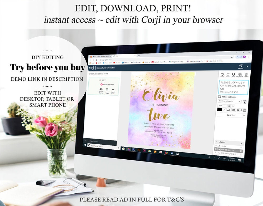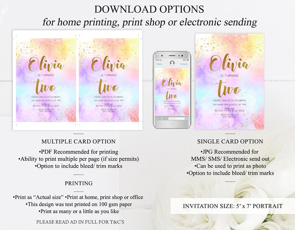 •Try before you buy! • DEMO LINK- https://www.corjl.com/d/NGLDL Matching items: https://etsy.me/3qLed6u PLEASE READ AD IN FULL!! •Digital file. No physical item will be shipped •Do it yourself Editing. Edit online with Corjl or Edit with your mobile ITEM DETAILS Invitation size: 5’x7’ File type: PDF, JPEG Resolution: 300DPI PDF FILE OPTIONS: •Recommended for printing •Ability to print multiple per page (if size permits) •Option to include bleed/ trim marks JPG FILE OPTIONS: •Recommended for MMS/ SMS/ Electronic send out •Can be used to print as photo •Option to include bleed/ trim marks EDITING • Do it yourself editing • Mobile editing is available • Google chrome is the recommend browser for Corjl. Please download here for FREE: https://www.google.com/chrome/ • Using other browsers may not show all of Corjl's editing features • Editing on a desktop/ laptop computer is recommended to access all of Corjl features • Mobile editing is available, please use a desktop/ laptop computer to access all of Corjl features DOWNLOADS & EXPIRY •Maximum 3 downloads on the same edit •Link expires 30 days after purchase DOWNLOAD NOTICE •Once you have reached your download limits &/ “approve proof” in Corjl. You will not be able to request further downloads on your design. Further download requests are not permitted WHAT IS EDITABLE •Text - colours, fonts, size, move, delete & rotation. •Please see demo link for what you can and can’t do WHAT YOU CAN’T EDIT •Template size •Template orientation •Graphics CAN NOT BE deleted, moved, or changed in colour •Please see demo link for what you can and can’t do HOW TO 1. Choose design template & checkout on Etsy. 2. Email will be sent from Corjl. Follow link to access template 3. Edit, save & print INSTRUCTIONS •Instructions on how to edit your design have been written by Corjl and will be available with your purchase. PRINTING •Colours can vary depending on the monitor, printer & cardstock •Can be printed at home •Home printing will require you to select the high quality print settings, select appropriate paper thickness & click "Actual size" prior to you printing •This design was test printed on 100 gsm paper •Can be printed at local print shop. Please check printing requirements & any printing restrictions prior to purchase PERSONAL USE ONLY. This item cannot be shared, re-sold, or used commercially for profit. REFUND POLICY •We are unable to provide a refund/ exchange on commenced & completed work, instant downloads or self-editing link templates. Please use the demo link to work out if this product is right for you. Copyright © 2018 by InvitePrintablesShop PTY LTD All rights reserved. This file or any portion thereof may not be reproduced or resold without the express written permission of the publisher (including edits to the design). Our files are provided as high-resolution PDFs – the end result is dependent upon the printer and paper used. If using a professional printing company, InvitePrintablesShop are not responsible for their specific printing requirements, paper or colour quality. Any changes required to the template are not included with your purchase – the files come as described in the listing only and cannot be changed. Thank you for visiting Invite Printables Shop:)