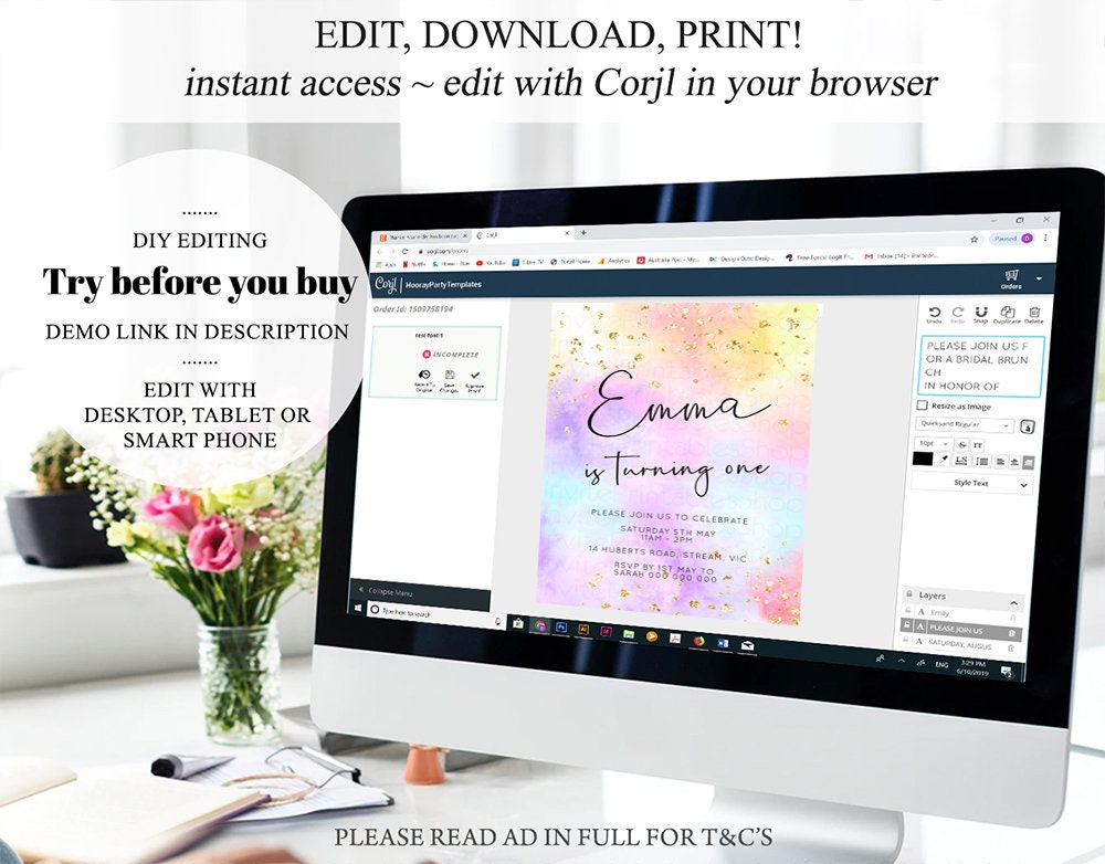 •Try before you buy! • DEMO LINK- https://www.corjl.com/d/1780P2 Matching items: https://etsy.me/3qLed6u PLEASE READ AD IN FULL!! •Digital file. No physical item will be shipped •Do it yourself Editing. Edit online with Corjl or Edit with your mobile ITEM DETAILS Invitation size: 5’x7’ File type: PDF, JPEG Resolution: 300DPI PDF FILE OPTIONS: •Recommended for printing •Ability to print multiple per page (if size permits) •Option to include bleed/ trim marks JPG FILE OPTIONS: •Recommended for MMS/ SMS/ Electronic send out •Can be used to print as photo •Option to include bleed/ trim marks EDITING • Do it yourself editing • Mobile editing is available • Google chrome is the recommend browser for Corjl. Please download here for FREE: https://www.google.com/chrome/ • Using other browsers may not show all of Corjl's editing features • Editing on a desktop/ laptop computer is recommended to access all of Corjl features • Mobile editing is available, please use a desktop/ laptop computer to access all of Corjl features DOWNLOADS & EXPIRY •Maximum 3 downloads on the same edit •Link expires 30 days after purchase DOWNLOAD NOTICE •Once you have reached your download limits &/ “approve proof” in Corjl. You will not be able to request further downloads on your design. Further download requests are not permitted WHAT IS EDITABLE •Text - colours, fonts, size, move, delete & rotation. •Please see demo link for what you can and can’t do WHAT YOU CAN’T EDIT •Template size •Template orientation •Graphics CAN NOT BE deleted, moved, or changed in colour •Please see demo link for what you can and can’t do HOW TO 1. Choose design template & checkout on Etsy. 2. Email will be sent from Corjl. Follow link to access template 3. Edit, save & print INSTRUCTIONS •Instructions on how to edit your design have been written by Corjl and will be available with your purchase. PRINTING •Colours can vary depending on the monitor, printer & cardstock •Can be printed at home •Home printing will require you to select the high quality print settings, select appropriate paper thickness & click "Actual size" prior to you printing •This design was test printed on 100 gsm paper •Can be printed at local print shop. Please check printing requirements & any printing restrictions prior to purchase PERSONAL USE ONLY. This item cannot be shared, re-sold, or used commercially for profit. REFUND POLICY •We are unable to provide a refund/ exchange on commenced & completed work, instant downloads or self-editing link templates. Please use the demo link to work out if this product is right for you. Copyright © 2018 by InvitePrintablesShop PTY LTD All rights reserved. This file or any portion thereof may not be reproduced or resold without the express written permission of the publisher (including edits to the design). Our files are provided as high-resolution PDFs – the end result is dependent upon the printer and paper used. If using a professional printing company, InvitePrintablesShop are not responsible for their specific printing requirements, paper or colour quality. Any changes required to the template are not included with your purchase – the files come as described in the listing only and cannot be changed. Thank you for visiting Invite Printables Shop:)