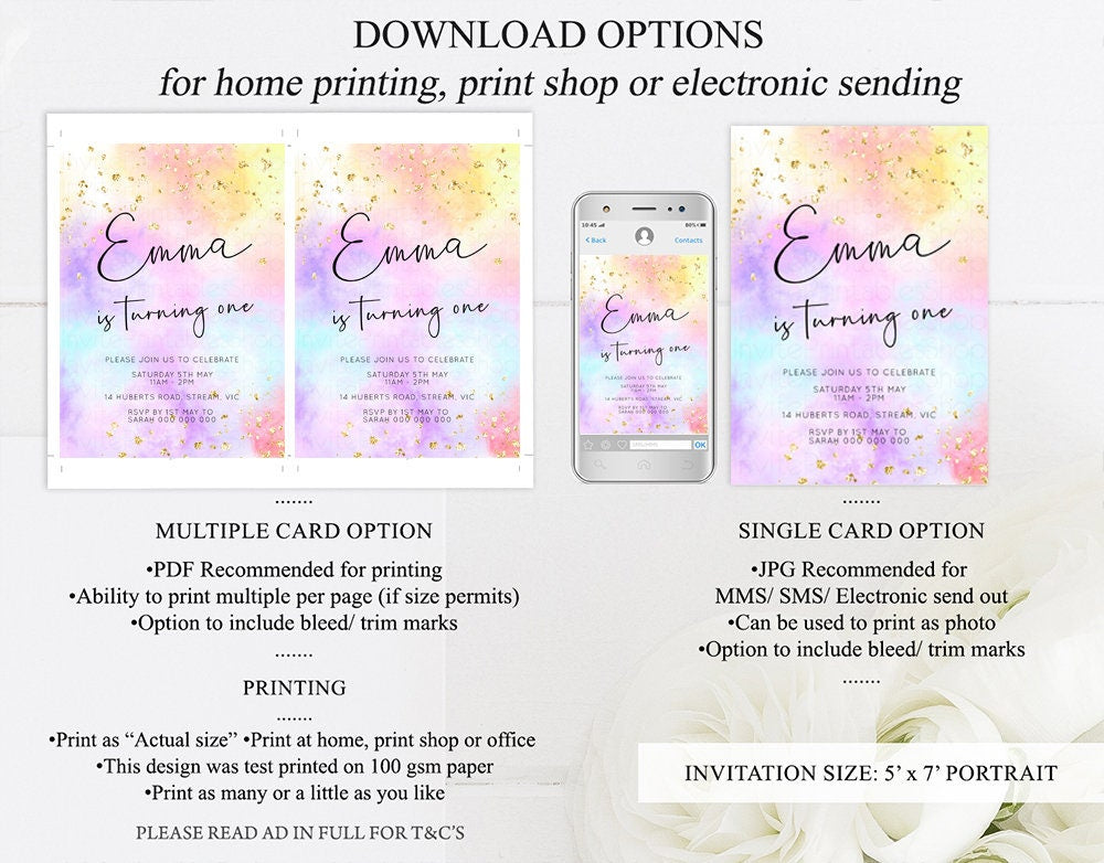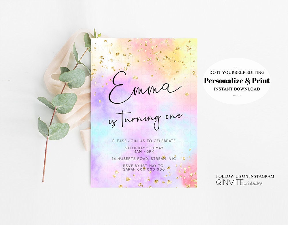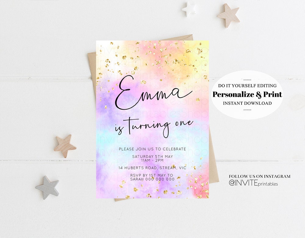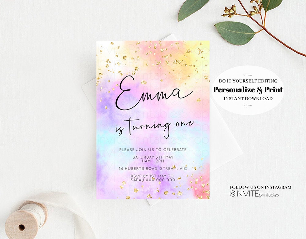 Rainbow Birthday Invitation Ombre Pastel Invitation Colorful Watercolor Splash Invite Gold Glitter Sprinkles Printable Digital Invite 499