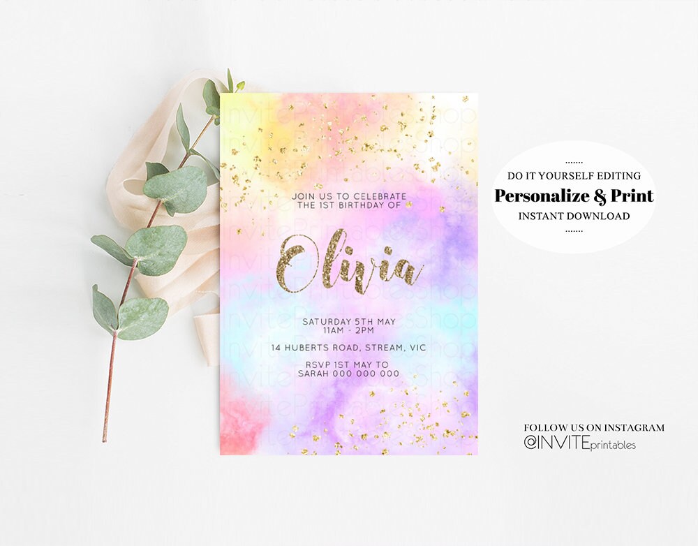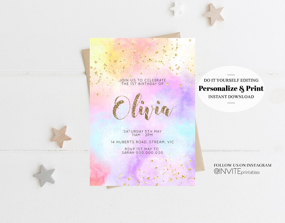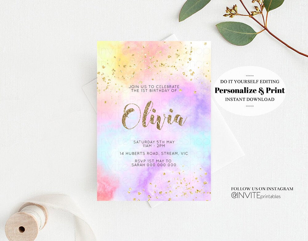 Rainbow Birthday Invitation Ombre Pastel Invitation Colorful Watercolor Splash Invite Gold Glitter Sprinkles Printable Digital Invite 499