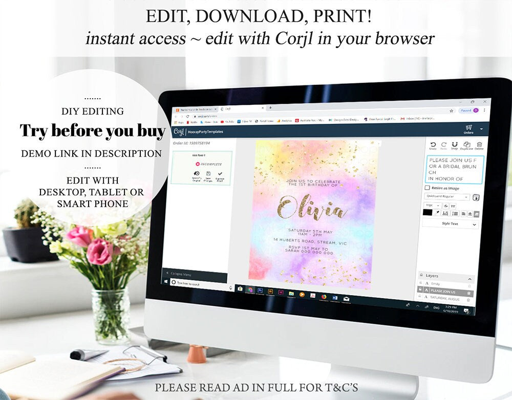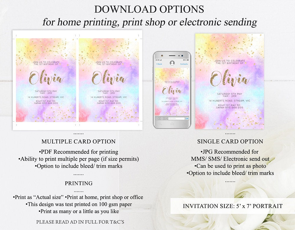 •Try before you buy! • DEMO LINK- https://www.corjl.com/d/3HGIFH Matching items: https://etsy.me/3qLed6u PLEASE READ AD IN FULL!! •Digital file. No physical item will be shipped •Do it yourself Editing. Edit online with Corjl or Edit with your mobile ITEM DETAILS Invitation size: 5’x7’ File type: PDF, JPEG Resolution: 300DPI PDF FILE OPTIONS: •Recommended for printing •Ability to print multiple per page (if size permits) •Option to include bleed/ trim marks JPG FILE OPTIONS: •Recommended for MMS/ SMS/ Electronic send out •Can be used to print as photo •Option to include bleed/ trim marks EDITING • Do it yourself editing • Mobile editing is available • Google chrome is the recommend browser for Corjl. Please download here for FREE: https://www.google.com/chrome/ • Using other browsers may not show all of Corjl's editing features • Editing on a desktop/ laptop computer is recommended to access all of Corjl features • Mobile editing is available, please use a desktop/ laptop computer to access all of Corjl features DOWNLOADS & EXPIRY •Maximum 3 downloads on the same edit •Link expires 30 days after purchase DOWNLOAD NOTICE •Once you have reached your download limits &/ “approve proof” in Corjl. You will not be able to request further downloads on your design. Further download requests are not permitted WHAT IS EDITABLE •Text - colours, fonts, size, move, delete & rotation. •Please see demo link for what you can and can’t do WHAT YOU CAN’T EDIT •Template size •Template orientation •Graphics CAN NOT BE deleted, moved, or changed in colour •Please see demo link for what you can and can’t do HOW TO 1. Choose design template & checkout on Etsy. 2. Email will be sent from Corjl. Follow link to access template 3. Edit, save & print INSTRUCTIONS •Instructions on how to edit your design have been written by Corjl and will be available with your purchase. PRINTING •Colours can vary depending on the monitor, printer & cardstock •Can be printed at home •Home printing will require you to select the high quality print settings, select appropriate paper thickness & click "Actual size" prior to you printing •This design was test printed on 100 gsm paper •Can be printed at local print shop. Please check printing requirements & any printing restrictions prior to purchase PERSONAL USE ONLY. This item cannot be shared, re-sold, or used commercially for profit. REFUND POLICY •We are unable to provide a refund/ exchange on commenced & completed work, instant downloads or self-editing link templates. Please use the demo link to work out if this product is right for you. Copyright © 2018 by InvitePrintablesShop PTY LTD All rights reserved. This file or any portion thereof may not be reproduced or resold without the express written permission of the publisher (including edits to the design). Our files are provided as high-resolution PDFs – the end result is dependent upon the printer and paper used. If using a professional printing company, InvitePrintablesShop are not responsible for their specific printing requirements, paper or colour quality. Any changes required to the template are not included with your purchase – the files come as described in the listing only and cannot be changed. Thank you for visiting Invite Printables Shop:)