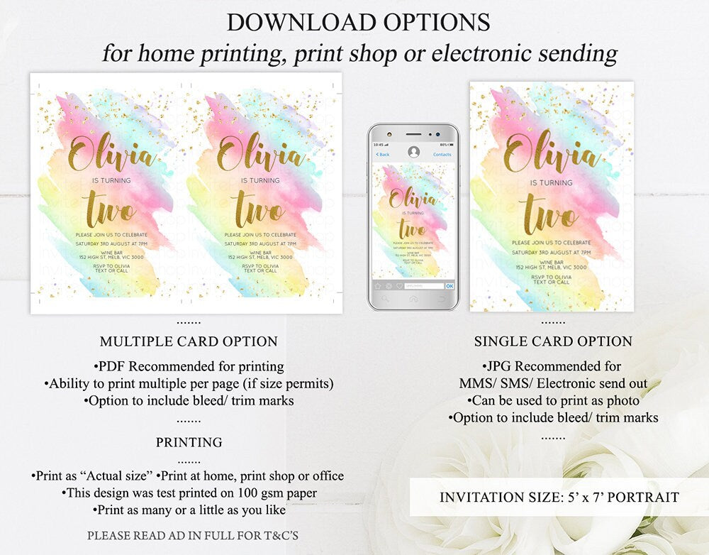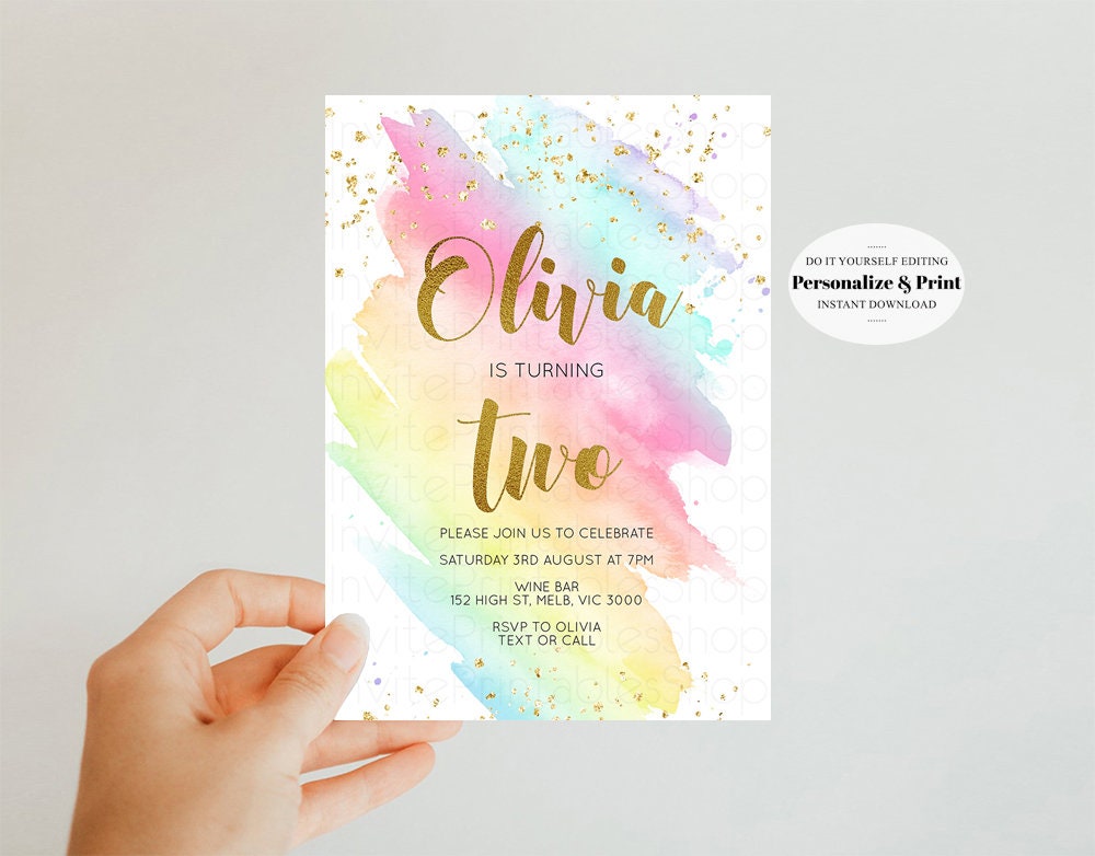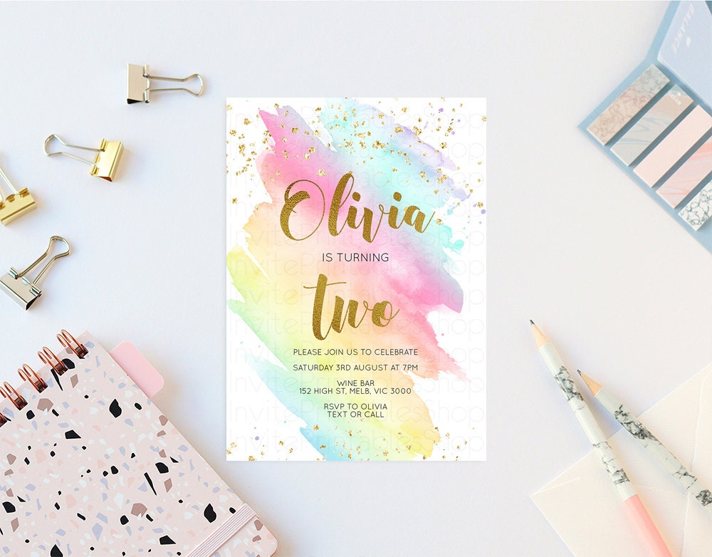 Rainbow Birthday Invitation Pastel Birthday Invitation Colorful Watercolor Invite Ombre Pastel Invitation Gold Glitter Sprinkles Invite G518