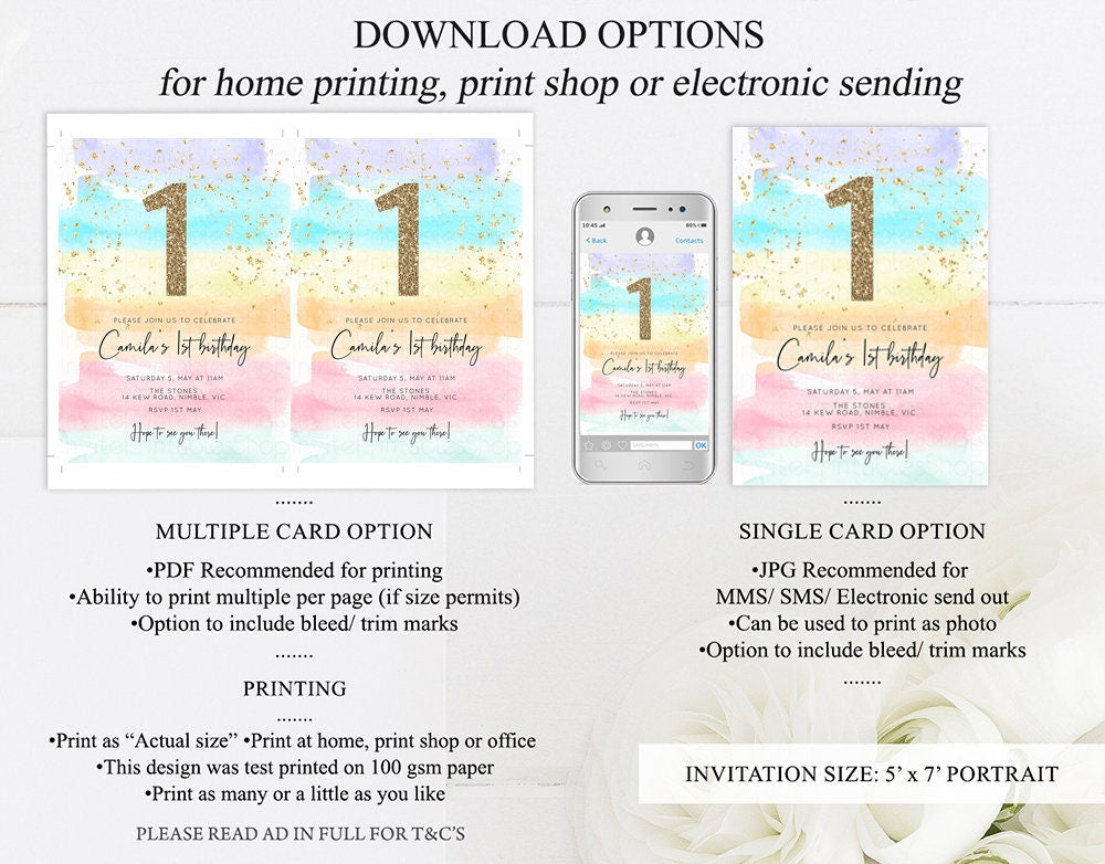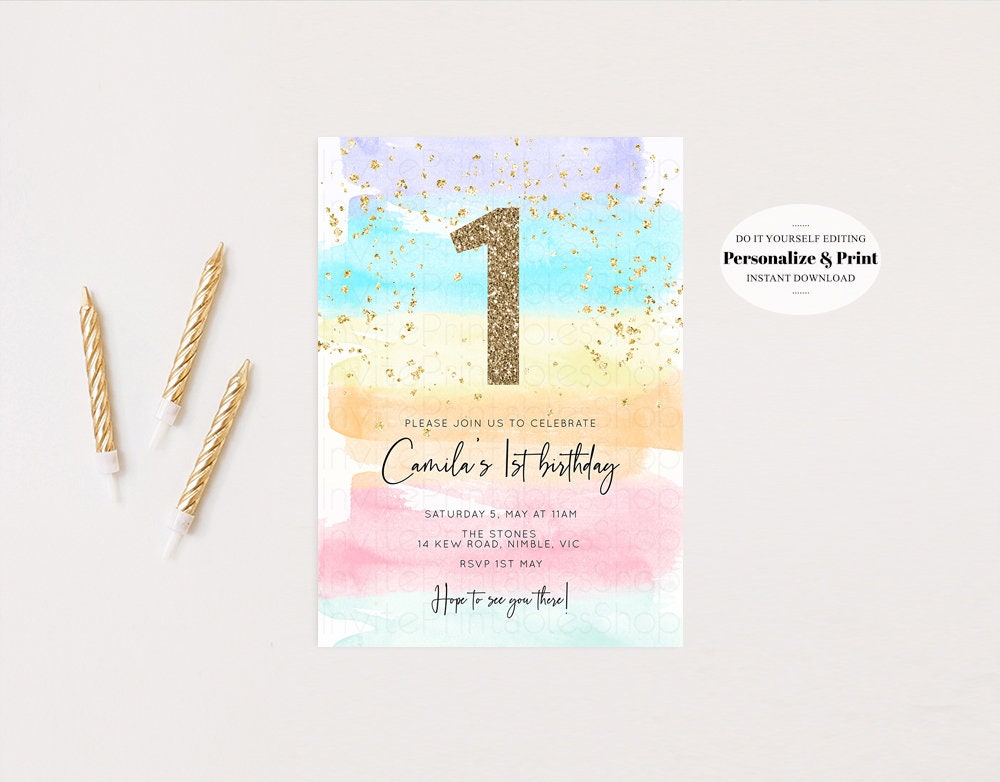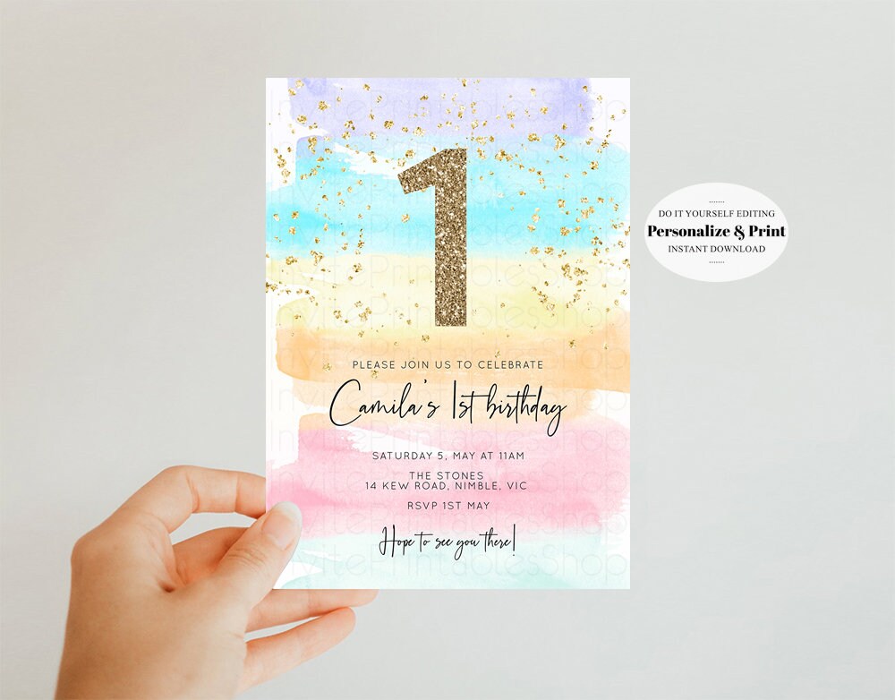 Rainbow Birthday Invitation Pastel Birthday Invitation Colorful Watercolor Invite Ombre Pastel Invitation Gold Glitter Sprinkles Invite t525