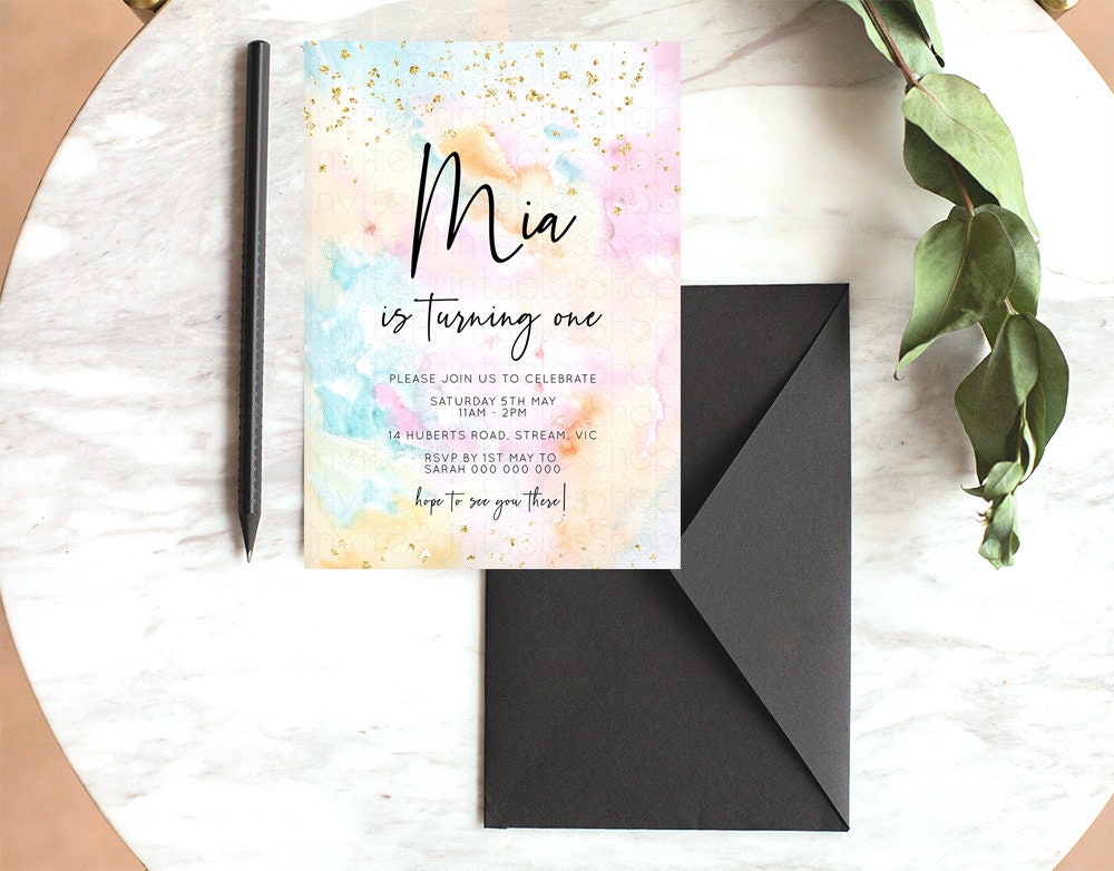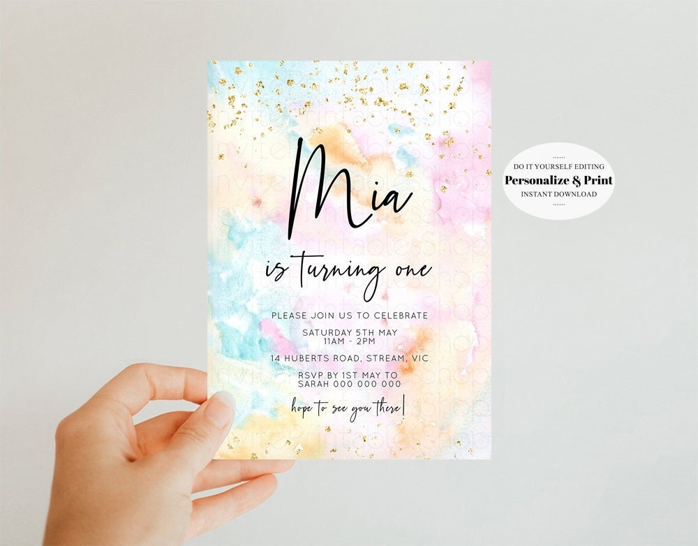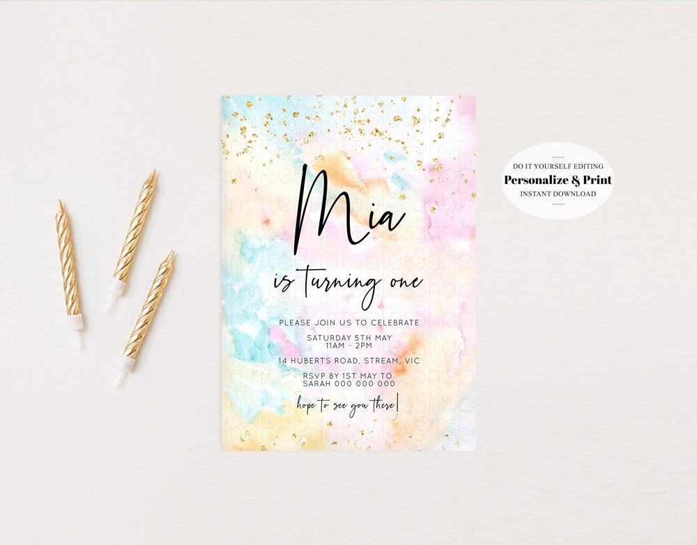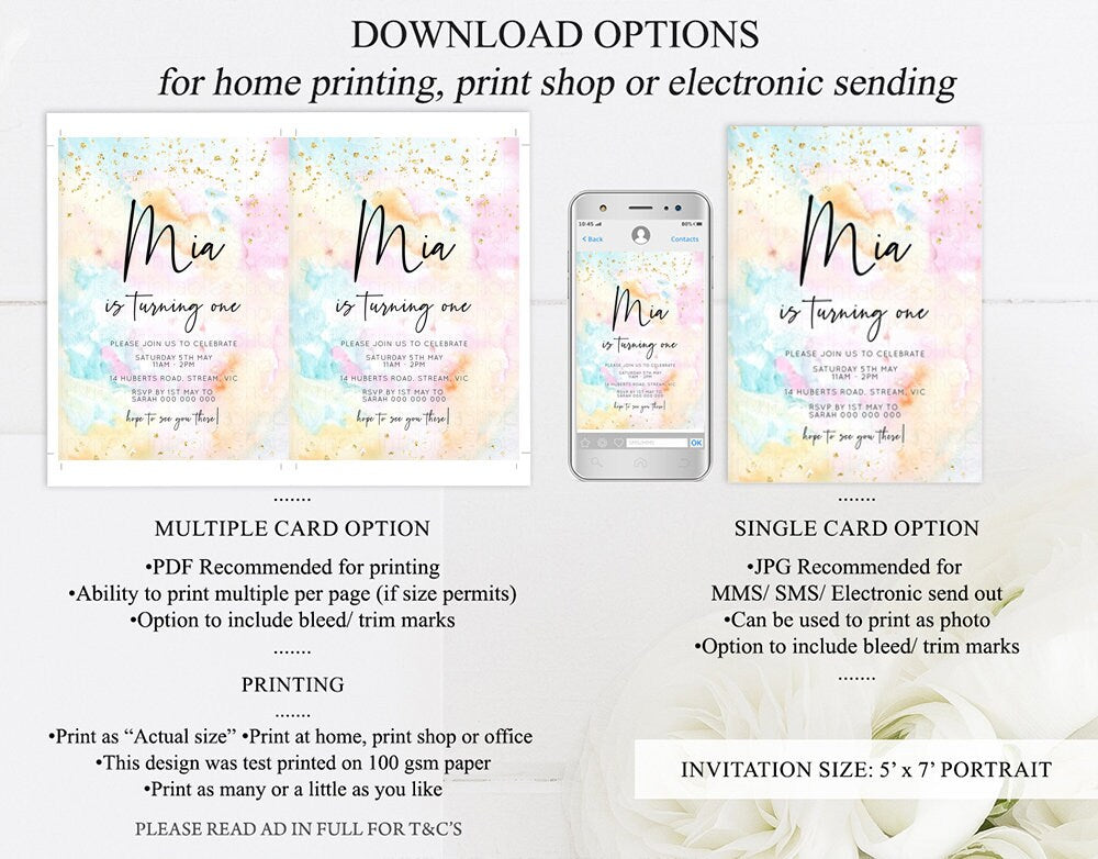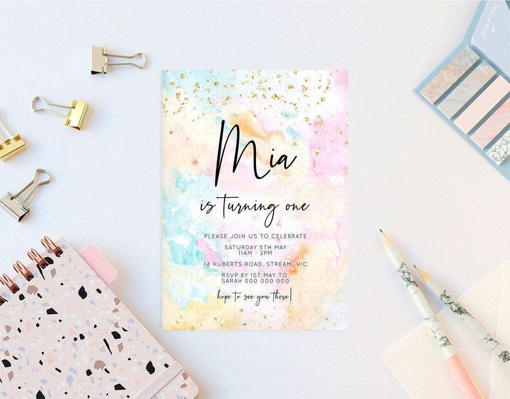 Rainbow Birthday Invitation Pastel Birthday Invitation Colorful Watercolor Invite Ombre Pastel Invite Gold Glitter Sprinkles Invite TC566
