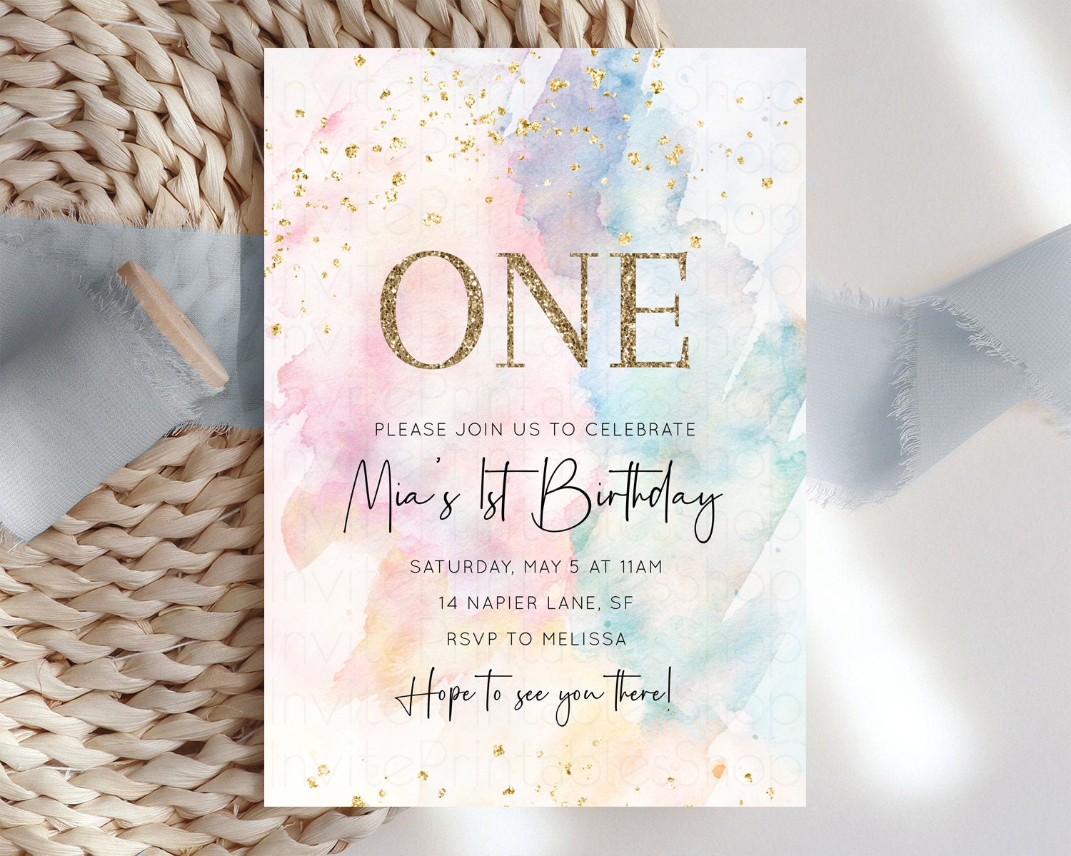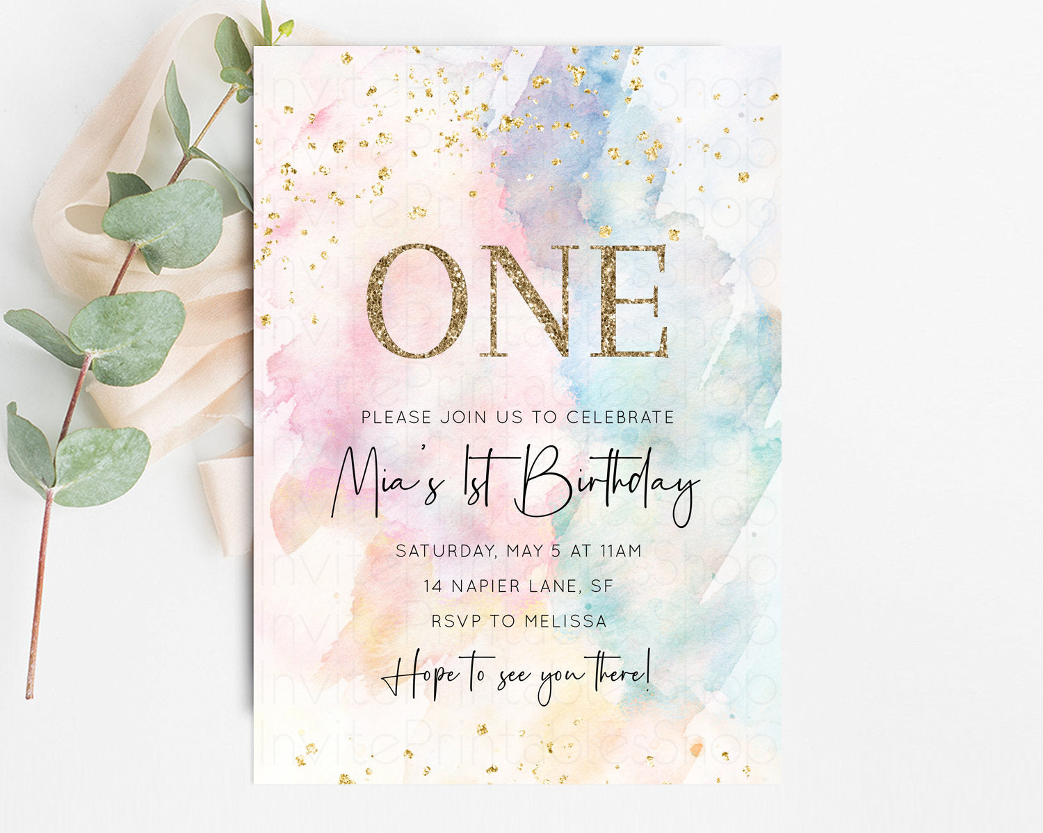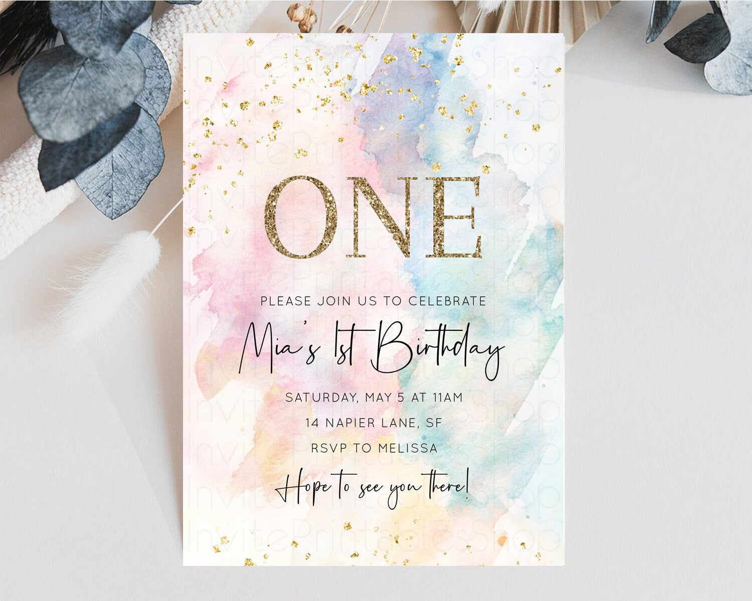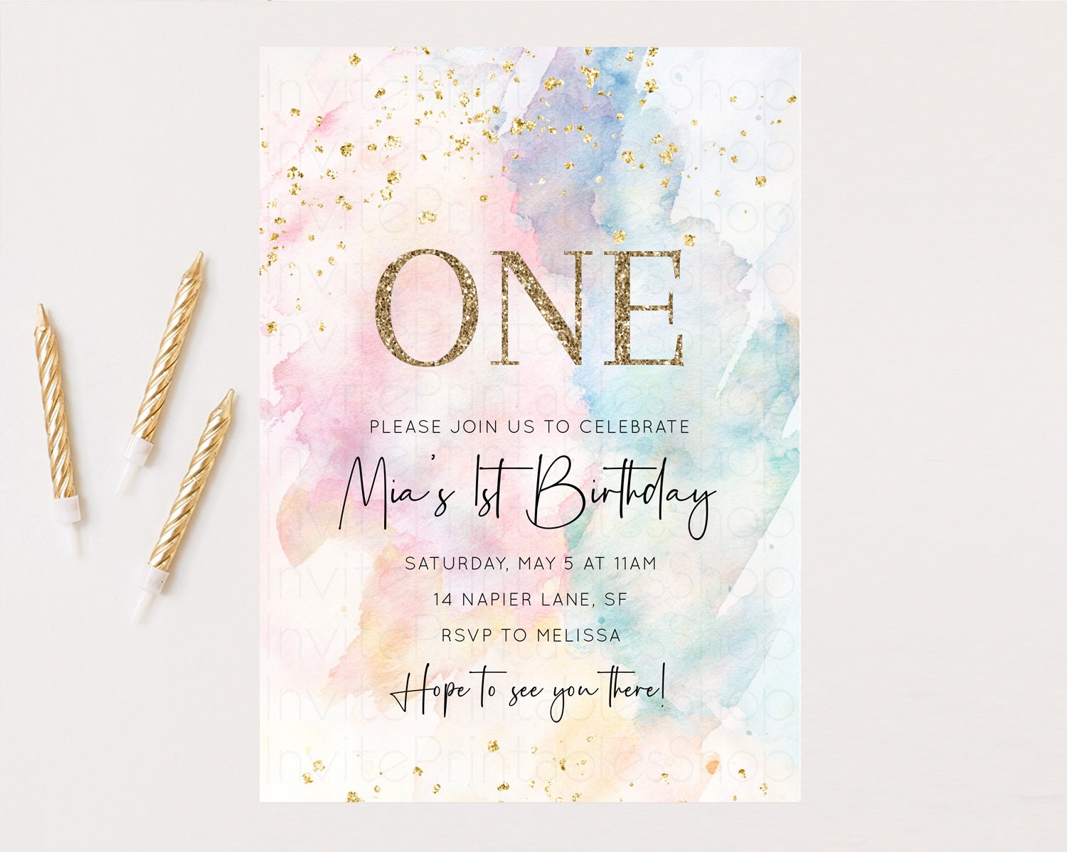 Rainbow Birthday Invitation Pastel Birthday Invitation Ombre Rainbow Invite Colorful Watercolor Invite Glitter Sprinkle 1st 2nd 3rd 276v2