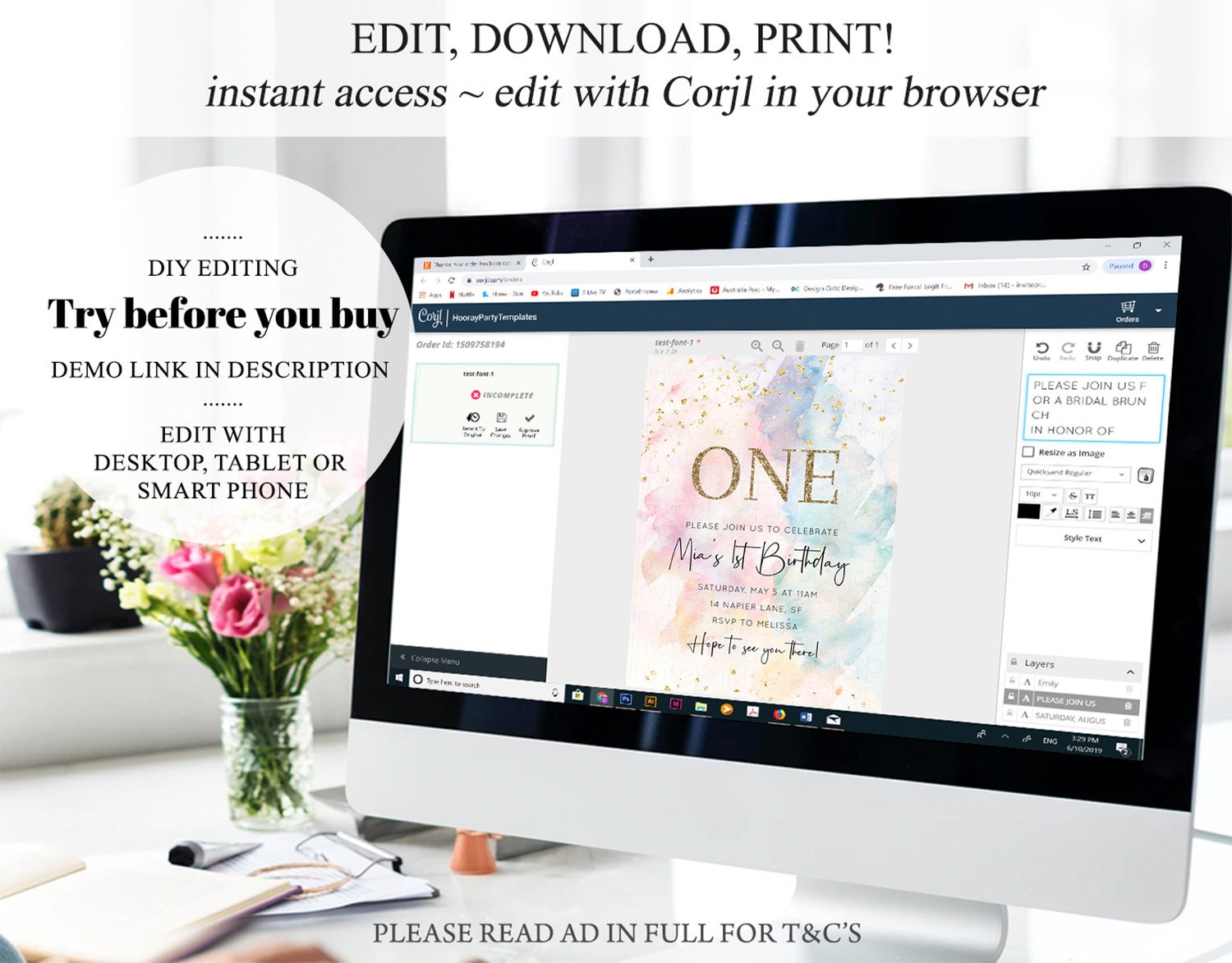 •Try before you buy! • DEMO LINK- https://www.corjl.com/d/OE0I4 PLEASE READ AD IN FULL!! •Digital file. No physical item will be shipped •Do it yourself Editing. Edit online with Corjl or Edit with your mobile ITEM DETAILS Invitation size: 5’x7’ File type: PDF, JPEG Resolution: 300DPI PDF FILE OPTIONS: •Recommended for printing •Ability to print multiple per page (if size permits) •Option to include bleed/ trim marks JPG FILE OPTIONS: •Recommended for MMS/ SMS/ Electronic send out •Can be used to print as photo •Option to include bleed/ trim marks EDITING • Do it yourself editing • Mobile editing is available • Google chrome is the recommend browser for Corjl. Please download here for FREE: https://www.google.com/chrome/ • Using other browsers may not show all of Corjl's editing features • Editing on a desktop/ laptop computer is recommended to access all of Corjl features • Mobile editing is available, please use a desktop/ laptop computer to access all of Corjl features DOWNLOADS & EXPIRY •Maximum 3 downloads on the same edit •Link expires 30 days after purchase DOWNLOAD NOTICE •Once you have reached your download limits &/ “approve proof” in Corjl. You will not be able to request further downloads on your design. Further download requests are not permitted WHAT IS EDITABLE •Text - colours, fonts, size, move, delete & rotation. •Please see demo link for what you can and can’t do WHAT YOU CAN’T EDIT •Template size •Template orientation •Graphics CAN NOT BE deleted, moved, or changed in colour •Please see demo link for what you can and can’t do HOW TO 1. Choose design template & checkout on Etsy. 2. Email will be sent from Corjl. Follow link to access template 3. Edit, save & print INSTRUCTIONS •Instructions on how to edit your design have been written by Corjl and will be available with your purchase. PRINTING •Colours can vary depending on the monitor, printer & cardstock •Can be printed at home •Home printing will require you to select the high quality print settings, select appropriate paper thickness & click "Actual size" prior to you printing •This design was test printed on 100 gsm paper •Can be printed at local print shop. Please check printing requirements & any printing restrictions prior to purchase PERSONAL USE ONLY. This item cannot be shared, re-sold, or used commercially for profit. REFUND POLICY •We are unable to provide a refund/ exchange on commenced & completed work, instant downloads or self-editing link templates. Please use the demo link to work out if this product is right for you. Copyright © 2018 by InvitePrintablesShop PTY LTD All rights reserved. This file or any portion thereof may not be reproduced or resold without the express written permission of the publisher (including edits to the design). Our files are provided as high-resolution PDFs – the end result is dependent upon the printer and paper used. If using a professional printing company, InvitePrintablesShop are not responsible for their specific printing requirements, paper or colour quality. Any changes required to the template are not included with your purchase – the files come as described in the listing only and cannot be changed. Thank you for visiting Invite Printables Shop:)