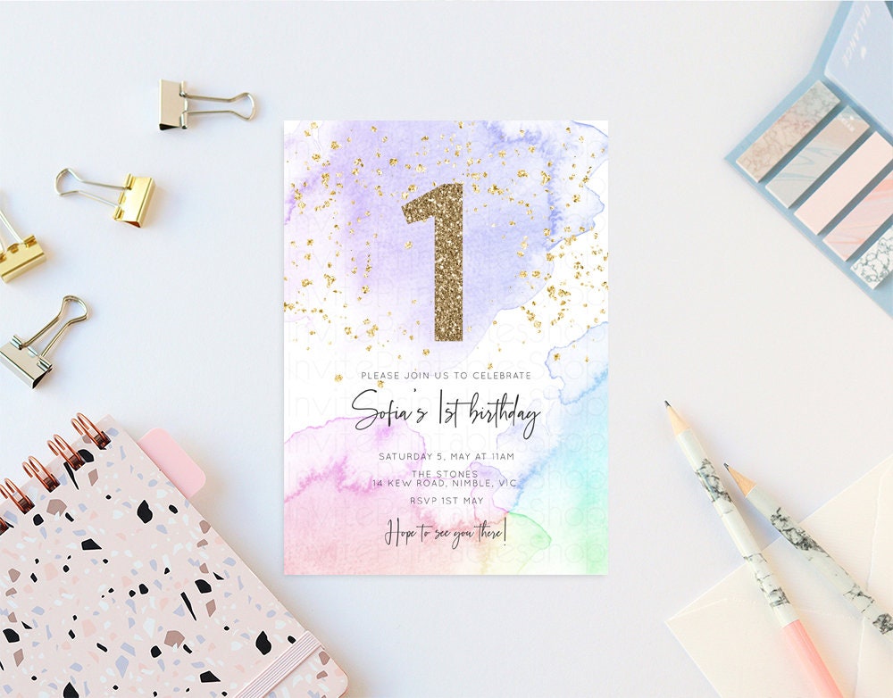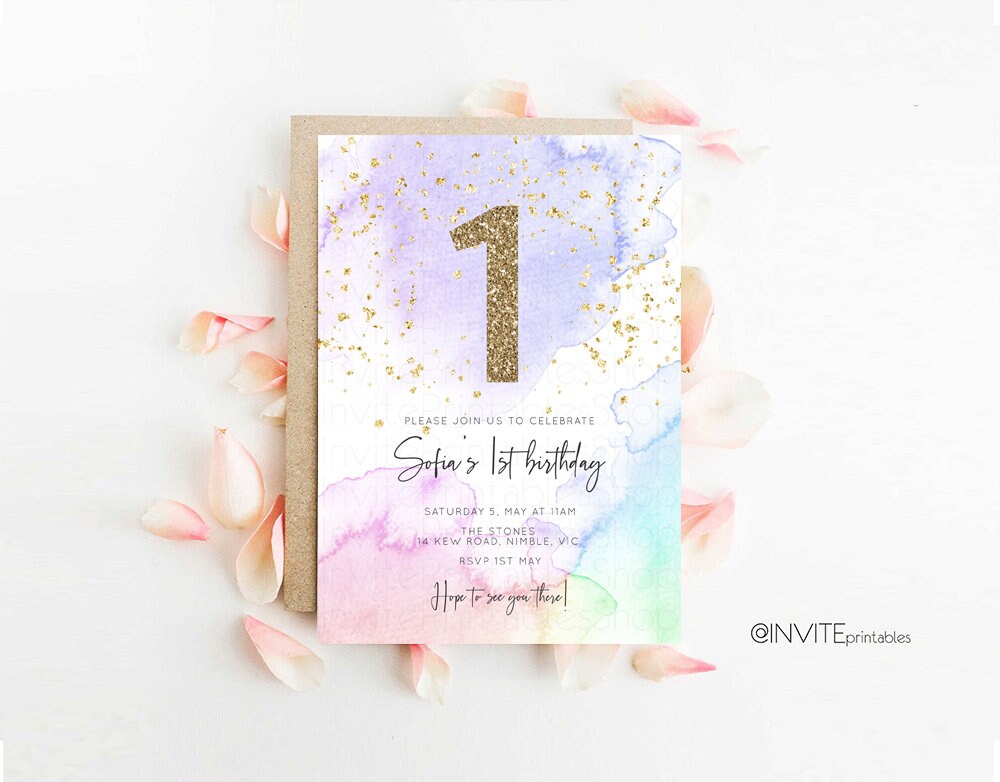 Rainbow Birthday Invitation Pastel Birthday Invitation Ombre Rainbow Invite Colorful Watercolor Invite Glitter Sprinkle Invitation