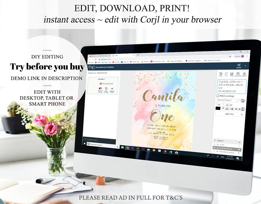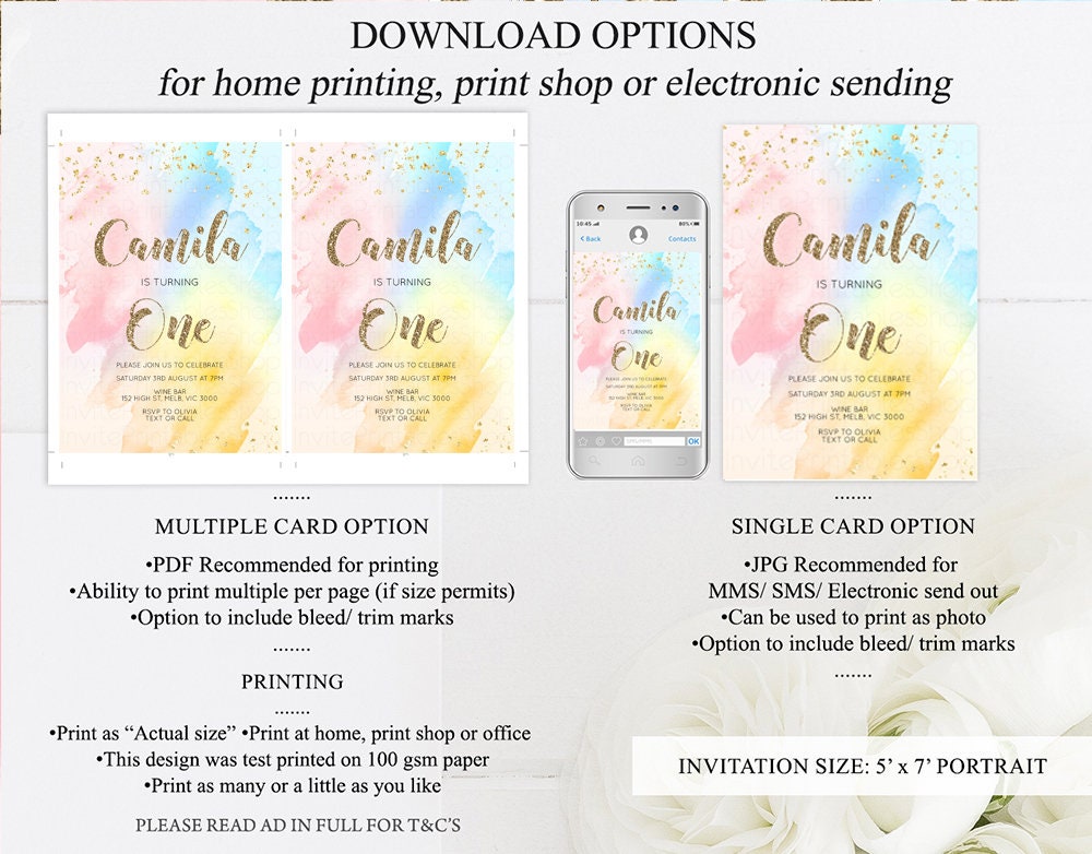 •Try before you buy! • DEMO LINK- https://www.corjl.com/d/GM6PN PLEASE READ AD IN FULL!! •Digital file. No physical item will be shipped •Do it yourself Editing. Edit online with Corjl or Edit with your mobile ITEM DETAILS Invitation size: 5’x7’ File type: PDF, JPEG Resolution: 300DPI PDF FILE OPTIONS: •Recommended for printing •Ability to print multiple per page (if size permits) •Option to include bleed/ trim marks JPG FILE OPTIONS: •Recommended for MMS/ SMS/ Electronic send out •Can be used to print as photo •Option to include bleed/ trim marks EDITING • Do it yourself editing • Mobile editing is available • Google chrome is the recommend browser for Corjl. Please download here for FREE: https://www.google.com/chrome/ • Using other browsers may not show all of Corjl's editing features • Editing on a desktop/ laptop computer is recommended to access all of Corjl features • Mobile editing is available, please use a desktop/ laptop computer to access all of Corjl features DOWNLOADS & EXPIRY •Maximum 3 downloads on the same edit •Link expires 30 days after purchase DOWNLOAD NOTICE •Once you have reached your download limits &/ “approve proof” in Corjl. You will not be able to request further downloads on your design. Further download requests are not permitted WHAT IS EDITABLE •Text - colours, fonts, size, move, delete & rotation. •Please see demo link for what you can and can’t do WHAT YOU CAN’T EDIT •Template size •Template orientation •Graphics CAN NOT BE deleted, moved, or changed in colour •Please see demo link for what you can and can’t do HOW TO 1. Choose design template & checkout on Etsy. 2. Email will be sent from Corjl. Follow link to access template 3. Edit, save & print INSTRUCTIONS •Instructions on how to edit your design have been written by Corjl and will be available with your purchase. PRINTING •Colours can vary depending on the monitor, printer & cardstock •Can be printed at home •Home printing will require you to select the high quality print settings, select appropriate paper thickness & click "Actual size" prior to you printing •This design was test printed on 100 gsm paper •Can be printed at local print shop. Please check printing requirements & any printing restrictions prior to purchase PERSONAL USE ONLY. This item cannot be shared, re-sold, or used commercially for profit. REFUND POLICY •We are unable to provide a refund/ exchange on commenced & completed work, instant downloads or self-editing link templates. Please use the demo link to work out if this product is right for you. Copyright © 2018 by InvitePrintablesShop PTY LTD All rights reserved. This file or any portion thereof may not be reproduced or resold without the express written permission of the publisher (including edits to the design). Our files are provided as high-resolution PDFs – the end result is dependent upon the printer and paper used. If using a professional printing company, InvitePrintablesShop are not responsible for their specific printing requirements, paper or colour quality. Any changes required to the template are not included with your purchase – the files come as described in the listing only and cannot be changed. Thank you for visiting Invite Printables Shop:)