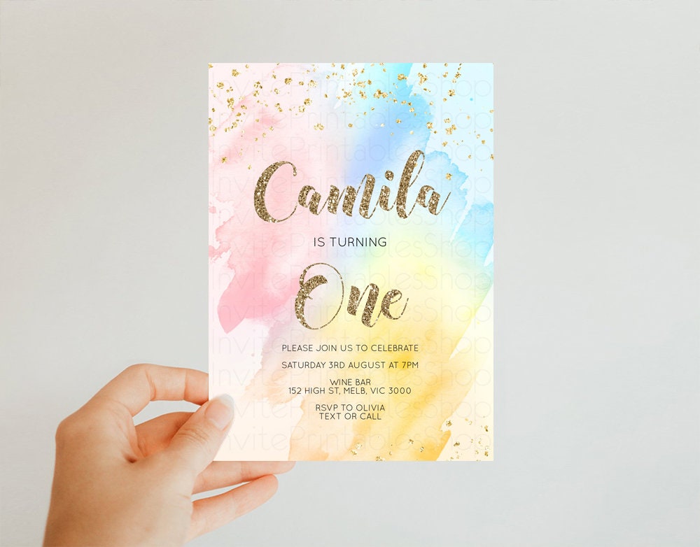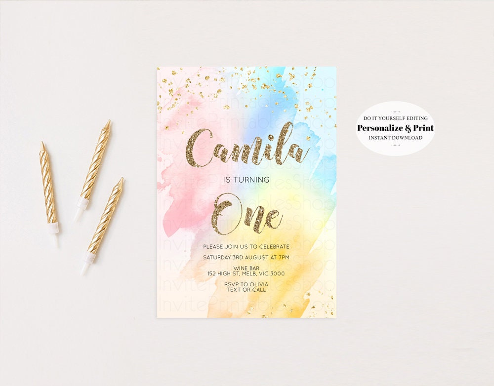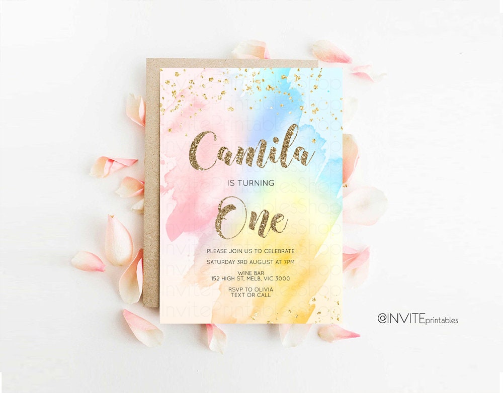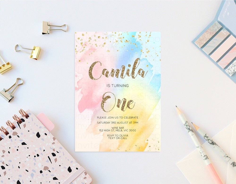 Rainbow Birthday Invitation Pastel Birthday Invitation Ombre Rainbow Invite Colorful Watercolor Invite Glitter Sprinkle Invitation