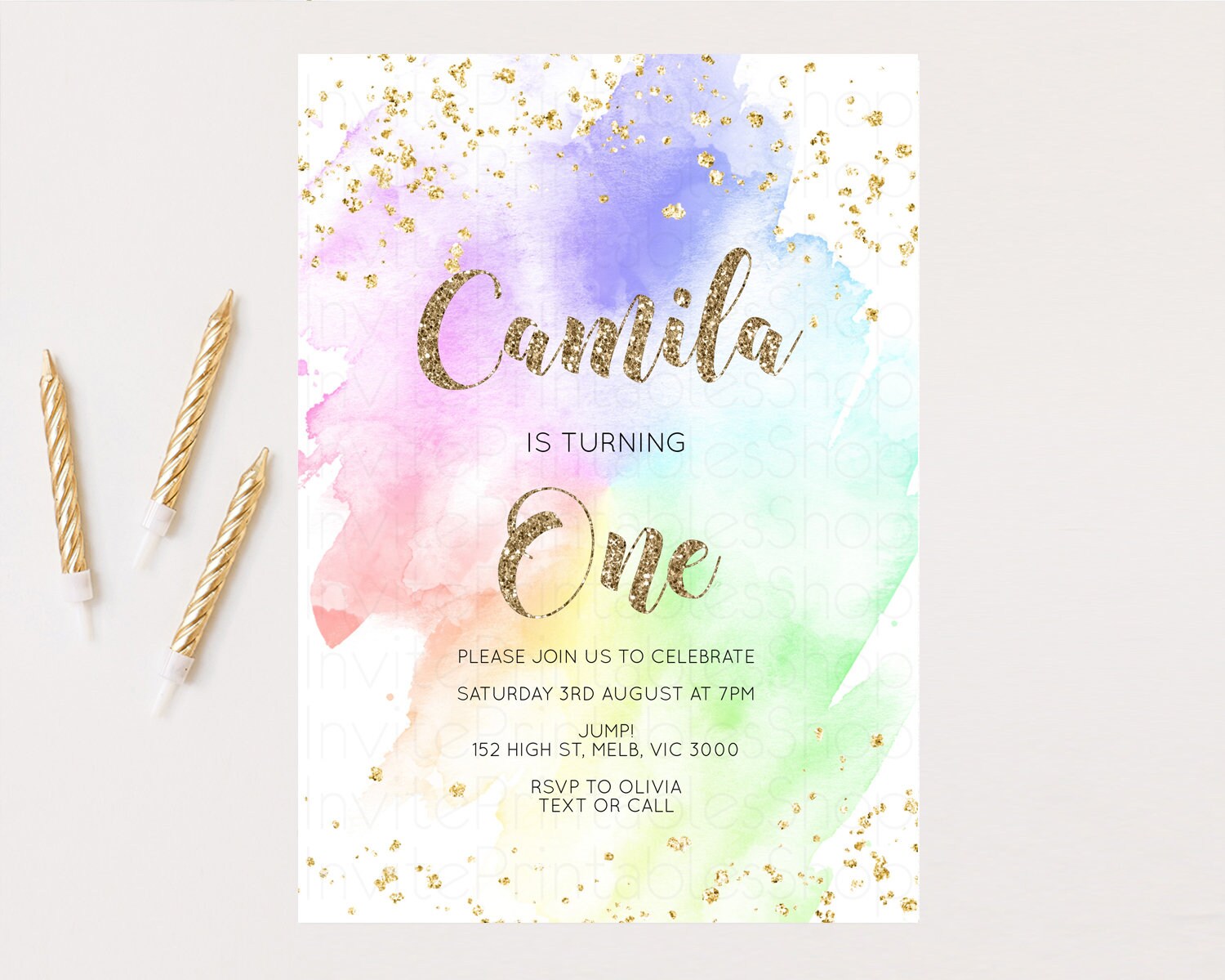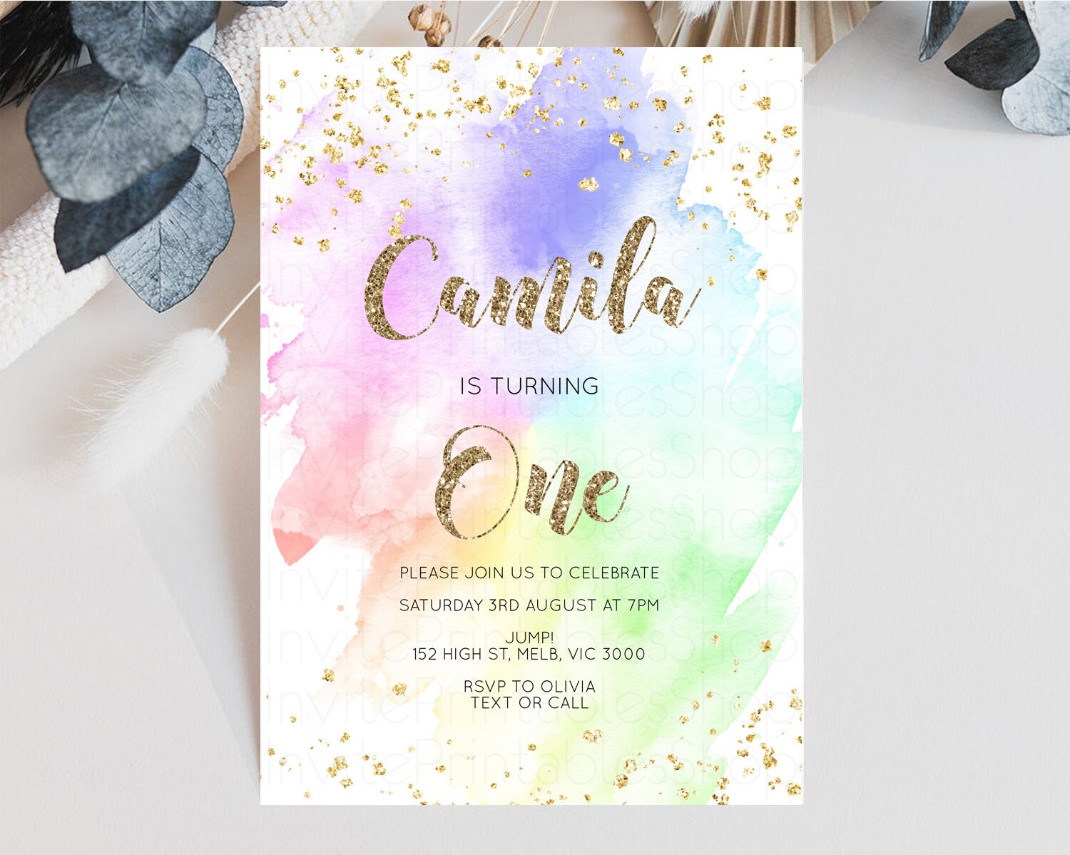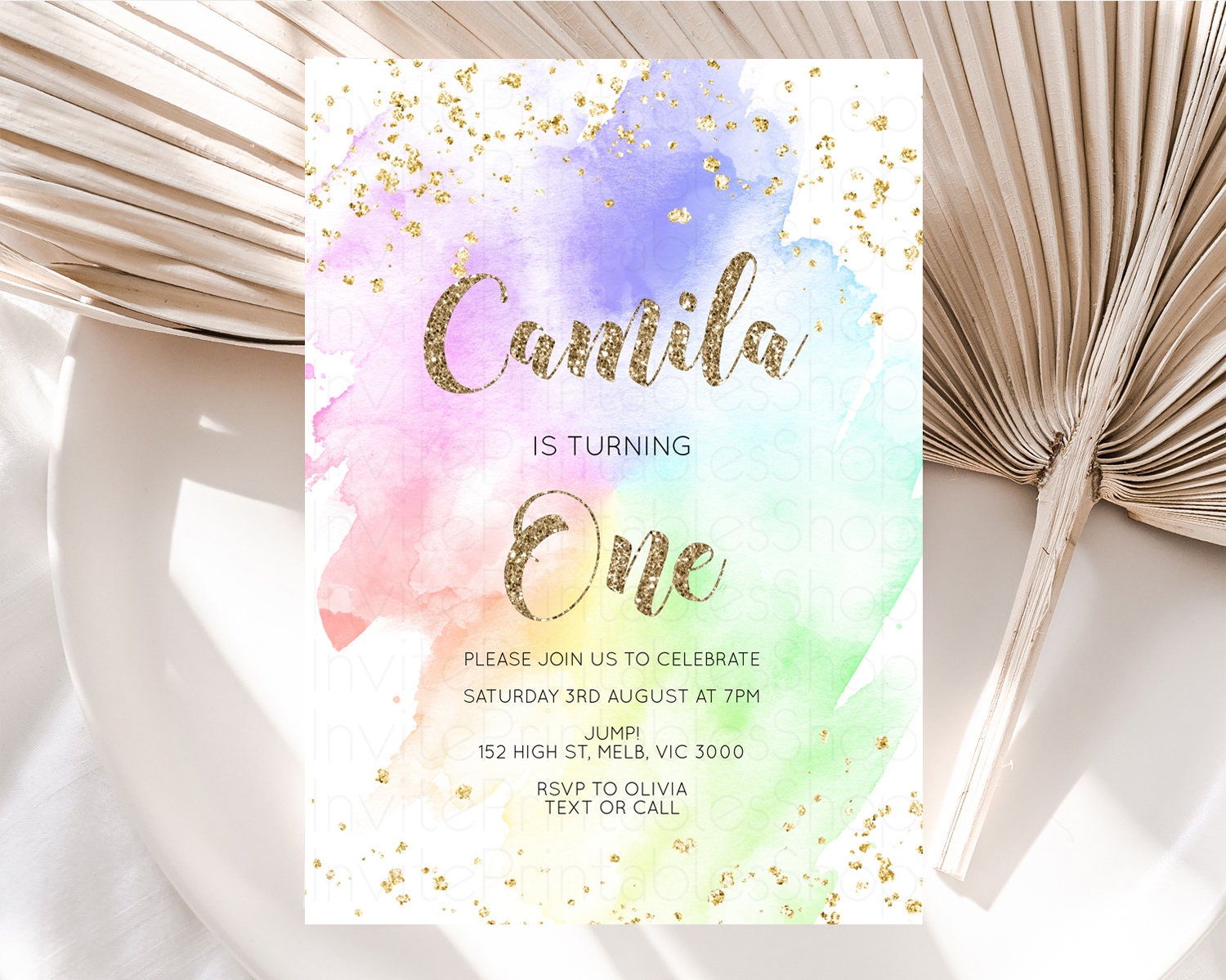 Rainbow Birthday Invitation Pastel Birthday Invitation Ombre Rainbow Invite Colorful Watercolor Invite Glitter Sprinkle Invitation G378