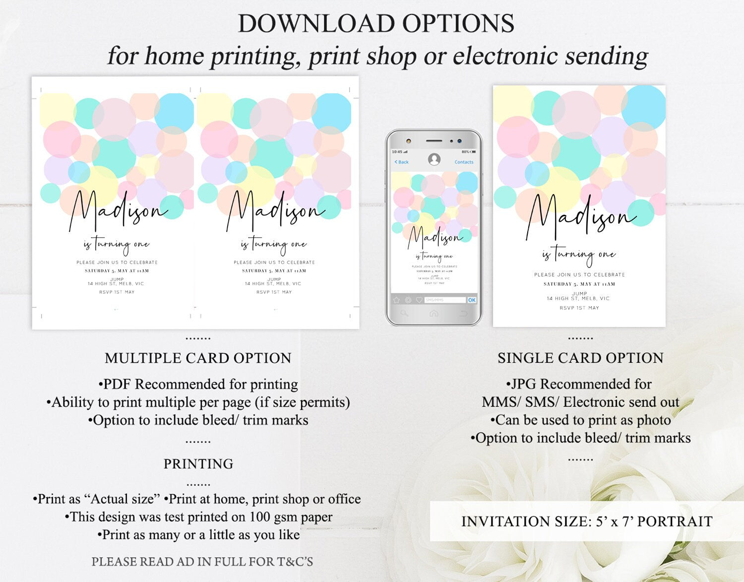 •Try before you buy! • DEMO LINK- https://www.corjl.com/d/1OC33C Matching items: https://etsy.me/34eyzxb PLEASE READ AD IN FULL!! •Digital file. No physical item will be shipped •Do it yourself Editing. Edit online with Corjl or Edit with your mobile ITEM DETAILS Invitation size: 5’x7’ File type: PDF, JPEG Resolution: 300DPI PDF FILE OPTIONS: •Recommended for printing •Ability to print multiple per page (if size permits) •Option to include bleed/ trim marks JPG FILE OPTIONS: •Recommended for MMS/ SMS/ Electronic send out •Can be used to print as photo •Option to include bleed/ trim marks EDITING • Do it yourself editing • Mobile editing is available • Google chrome is the recommend browser for Corjl. Please download here for FREE: https://www.google.com/chrome/ • Using other browsers may not show all of Corjl's editing features • Editing on a desktop/ laptop computer is recommended to access all of Corjl features • Mobile editing is available, please use a desktop/ laptop computer to access all of Corjl features DOWNLOADS & EXPIRY •Maximum 3 downloads on the same edit •Link expires 30 days after purchase DOWNLOAD NOTICE •Once you have reached your download limits &/ “approve proof” in Corjl. You will not be able to request further downloads on your design. Further download requests are not permitted WHAT IS EDITABLE •Text - colours, fonts, size, move, delete & rotation. •Please see demo link for what you can and can’t do WHAT YOU CAN’T EDIT •Template size •Template orientation •Graphics CAN NOT BE deleted, moved, or changed in colour •Please see demo link for what you can and can’t do HOW TO 1. Choose design template & checkout on Etsy. 2. Email will be sent from Corjl. Follow link to access template 3. Edit, save & print INSTRUCTIONS •Instructions on how to edit your design have been written by Corjl and will be available with your purchase. PRINTING •Colours can vary depending on the monitor, printer & cardstock •Can be printed at home •Home printing will require you to select the high quality print settings, select appropriate paper thickness & click "Actual size" prior to you printing •This design was test printed on 100 gsm paper •Can be printed at local print shop. Please check printing requirements & any printing restrictions prior to purchase PERSONAL USE ONLY. This item cannot be shared, re-sold, or used commercially for profit. REFUND POLICY •We are unable to provide a refund/ exchange on commenced & completed work, instant downloads or self-editing link templates. Please use the demo link to work out if this product is right for you. Copyright © 2018 by InvitePrintablesShop PTY LTD All rights reserved. This file or any portion thereof may not be reproduced or resold without the express written permission of the publisher (including edits to the design). Our files are provided as high-resolution PDFs – the end result is dependent upon the printer and paper used. If using a professional printing company, InvitePrintablesShop are not responsible for their specific printing requirements, paper or colour quality. Any changes required to the template are not included with your purchase – the files come as described in the listing only and cannot be changed. Thank you for visiting Invite Printables Shop:)