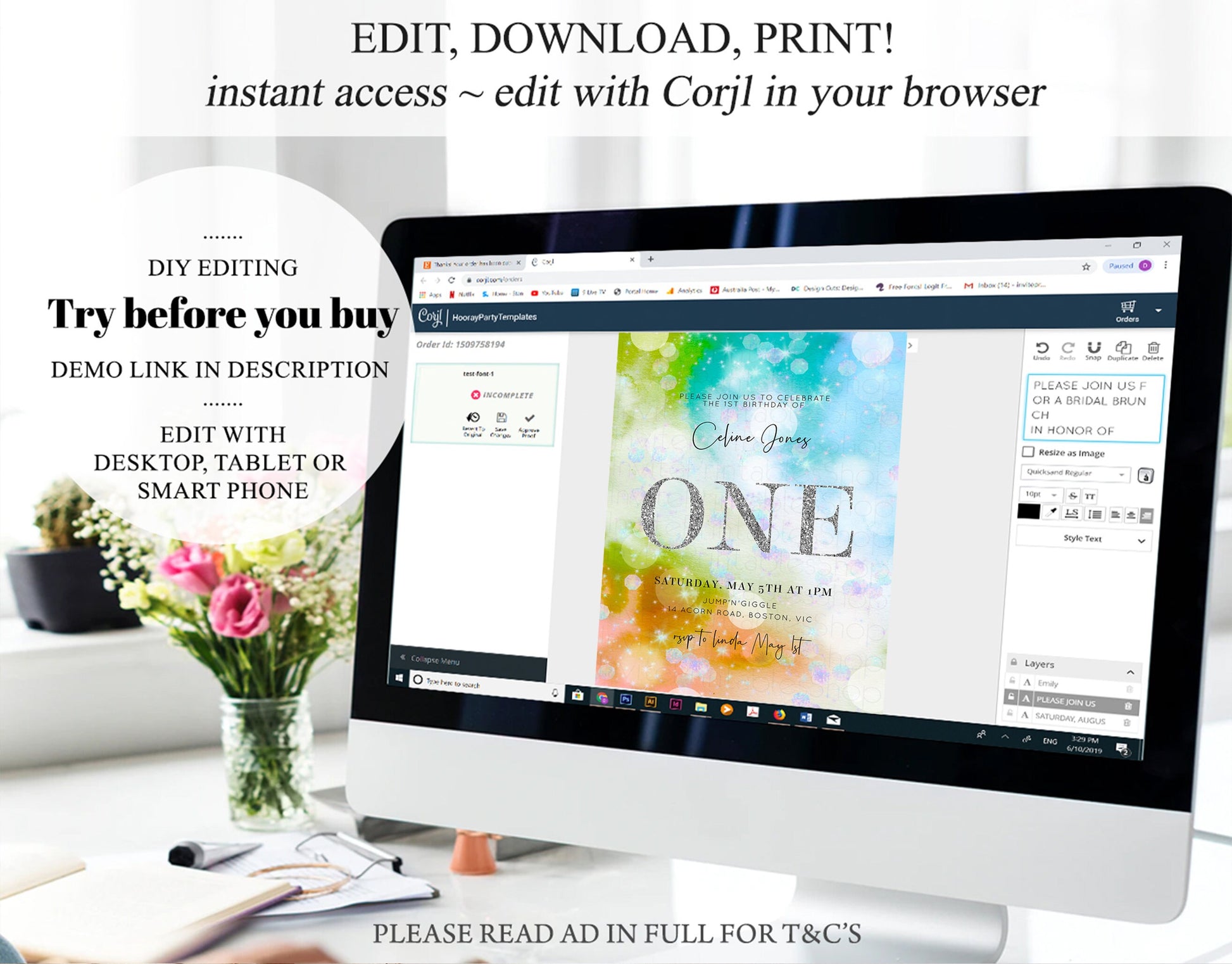 •Try before you buy! • DEMO LINK- https://www.corjl.com/d/H35KE PLEASE READ AD IN FULL!! •Digital file. No physical item will be shipped •Do it yourself Editing. Edit online with Corjl or Edit with your mobile ITEM DETAILS Invitation size: 5’x7’ File type: PDF, JPEG Resolution: 300DPI PDF FILE OPTIONS: •Recommended for printing •Ability to print multiple per page (if size permits) •Option to include bleed/ trim marks JPG FILE OPTIONS: •Recommended for MMS/ SMS/ Electronic send out •Can be used to print as photo •Option to include bleed/ trim marks EDITING • Do it yourself editing • Mobile editing is available • Google chrome is the recommend browser for Corjl. Please download here for FREE: https://www.google.com/chrome/ • Using other browsers may not show all of Corjl's editing features • Editing on a desktop/ laptop computer is recommended to access all of Corjl features • Mobile editing is available, please use a desktop/ laptop computer to access all of Corjl features DOWNLOADS & EXPIRY •Maximum 3 downloads on the same edit •Link expires 30 days after purchase DOWNLOAD NOTICE •Once you have reached your download limits &/ “approve proof” in Corjl. You will not be able to request further downloads on your design. Further download requests are not permitted WHAT IS EDITABLE •Text - colours, fonts, size, move, delete & rotation. •Please see demo link for what you can and can’t do WHAT YOU CAN’T EDIT •Template size •Template orientation •Graphics CAN NOT BE deleted, moved, or changed in colour •Please see demo link for what you can and can’t do HOW TO 1. Choose design template & checkout on Etsy. 2. Email will be sent from Corjl. Follow link to access template 3. Edit, save & print INSTRUCTIONS •Instructions on how to edit your design have been written by Corjl and will be available with your purchase. PRINTING •Colours can vary depending on the monitor, printer & cardstock •Can be printed at home •Home printing will require you to select the high quality print settings, select appropriate paper thickness & click "Actual size" prior to you printing •This design was test printed on 100 gsm paper •Can be printed at local print shop. Please check printing requirements & any printing restrictions prior to purchase PERSONAL USE ONLY. This item cannot be shared, re-sold, or used commercially for profit. REFUND POLICY •We are unable to provide a refund/ exchange on commenced & completed work, instant downloads or self-editing link templates. Please use the demo link to work out if this product is right for you. Copyright © 2018 by InvitePrintablesShop PTY LTD All rights reserved. This file or any portion thereof may not be reproduced or resold without the express written permission of the publisher (including edits to the design). Our files are provided as high-resolution PDFs – the end result is dependent upon the printer and paper used. If using a professional printing company, InvitePrintablesShop are not responsible for their specific printing requirements, paper or colour quality. Any changes required to the template are not included with your purchase – the files come as described in the listing only and cannot be changed. Thank you for visiting Invite Printables Shop:)
