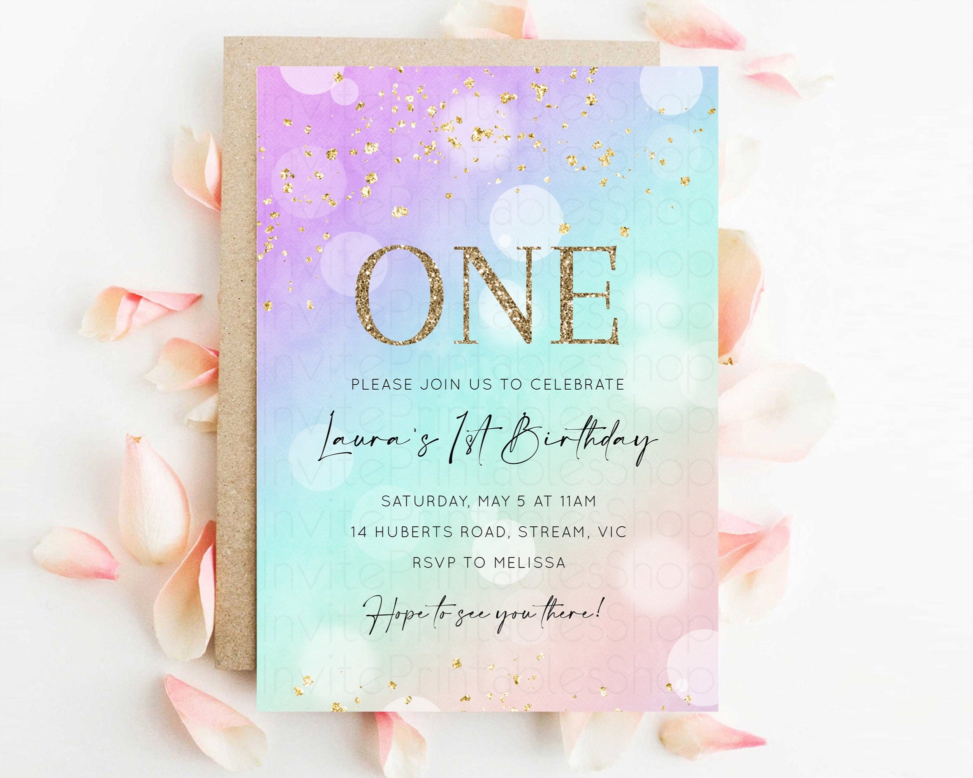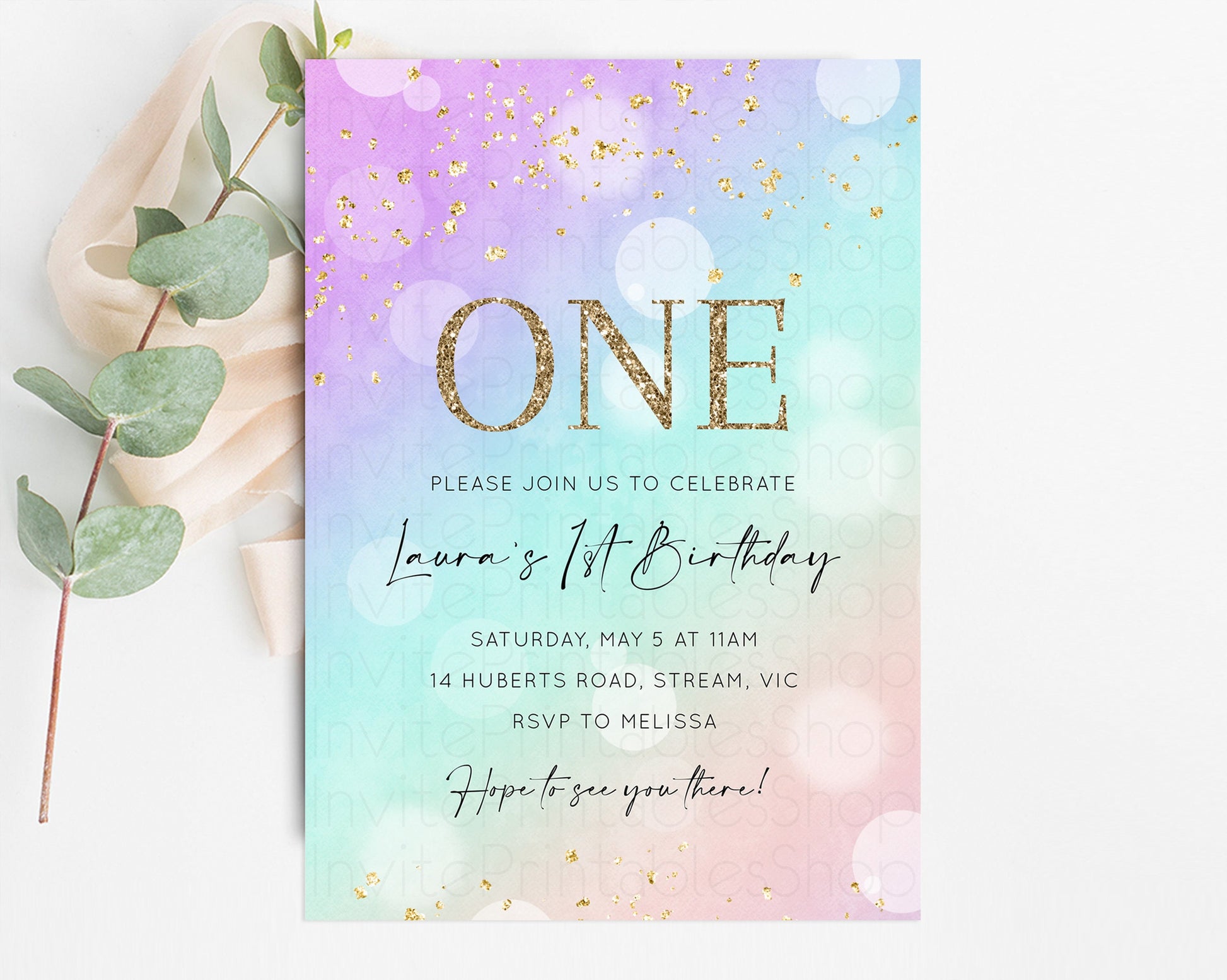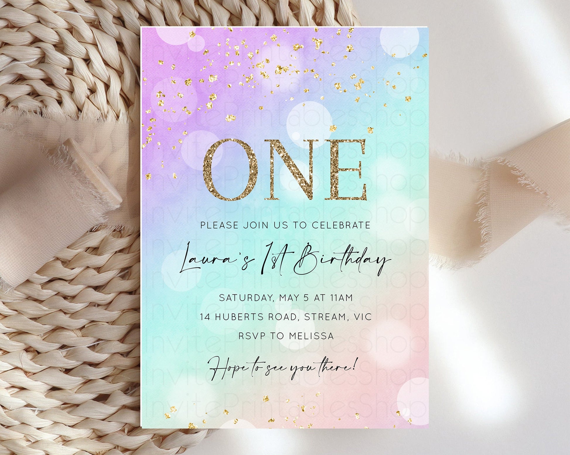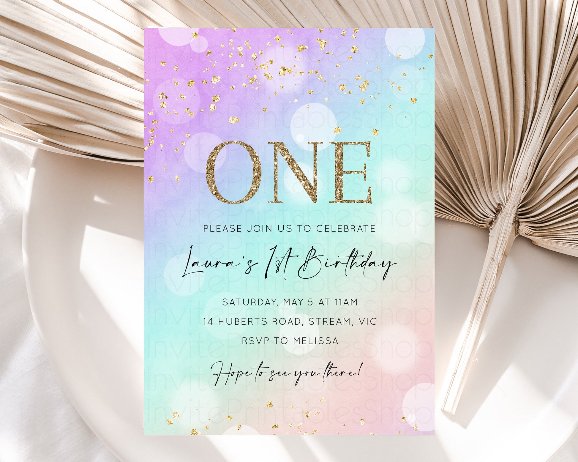 Rainbow Birthday Invitation Pastel Birthday Invite Ombre Watercolor Invite Enchanted Theme Colorful Splash Glitter Sprinkles 1st 2nd 3rd